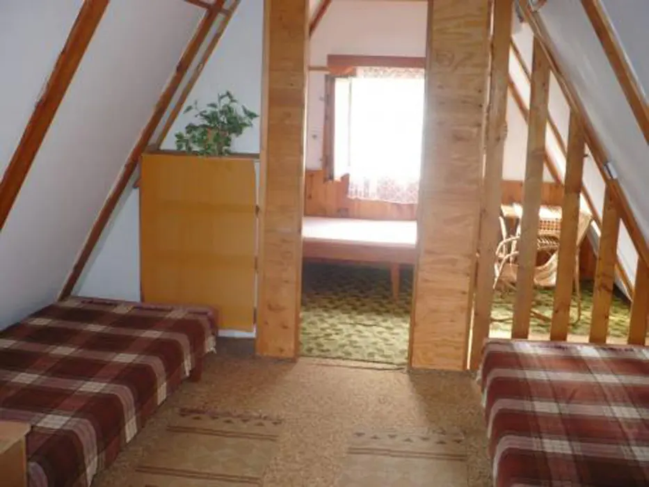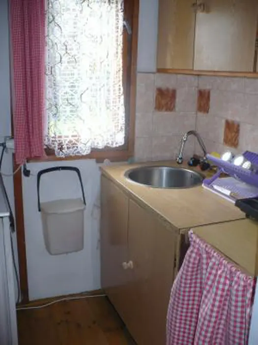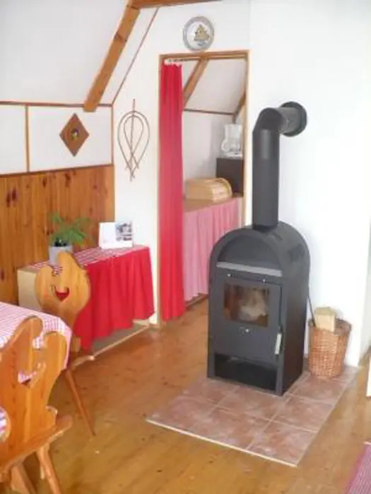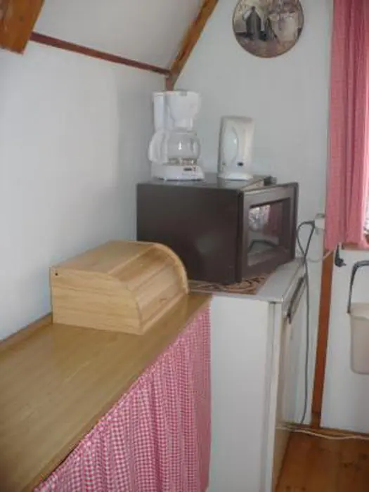 Obývací pokoj - sedací souprava, TV, jídelní stůl, vstup na prostornou terasu, společenská místnost. Kuchyně - elektrický 2 plotýnkový indukční vařič, lednice, mikrovlnná trouba, varná konvice, kávovar. 1 ložnice v podkroví 1x5 lůžek ( vedou příkré schody ). Sociální zařízení - v přízemí koupelna, sprcha, umyvadlo, WC. Topení - krbová kamna.