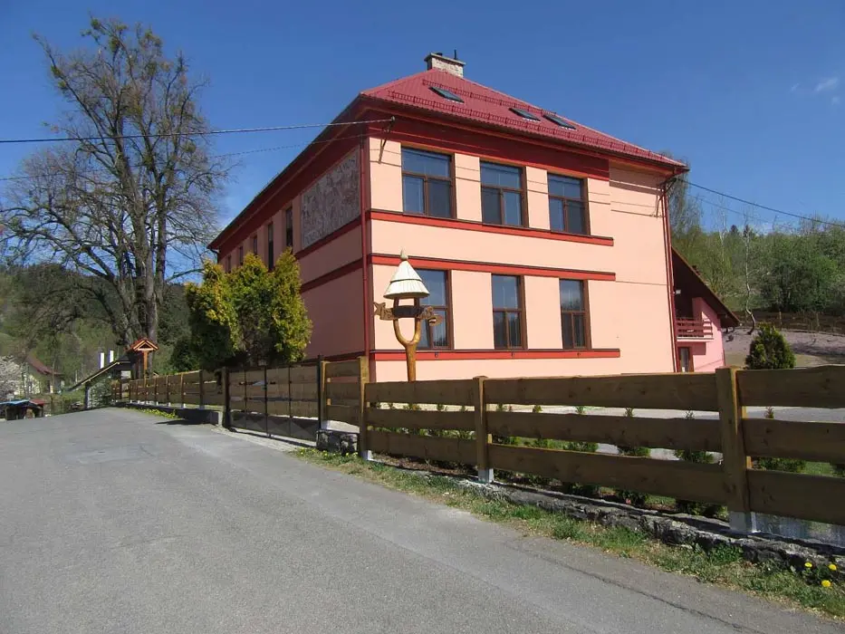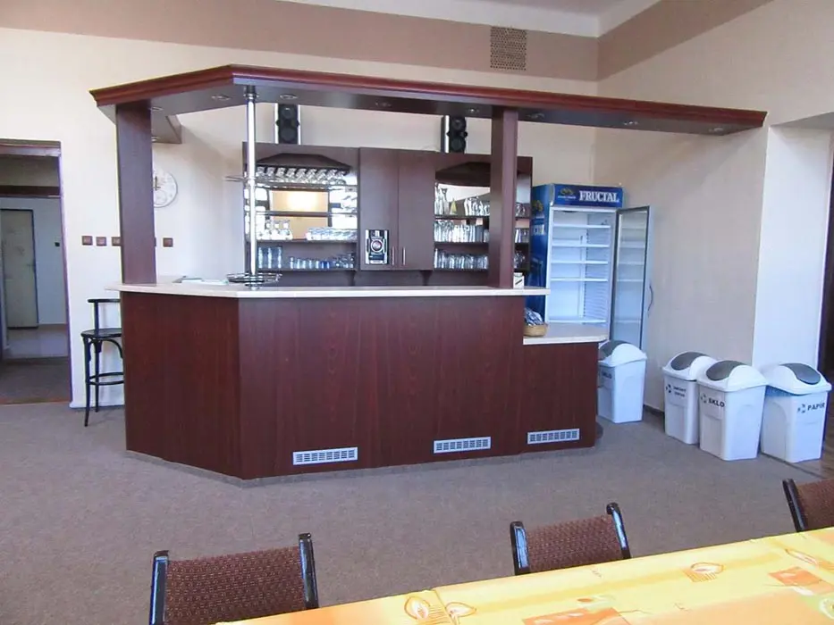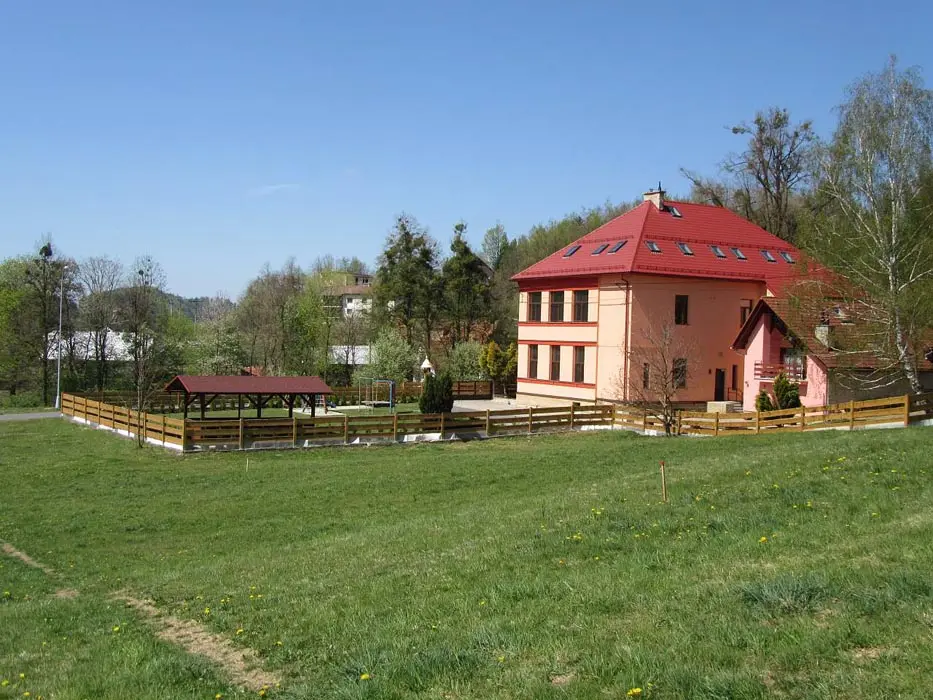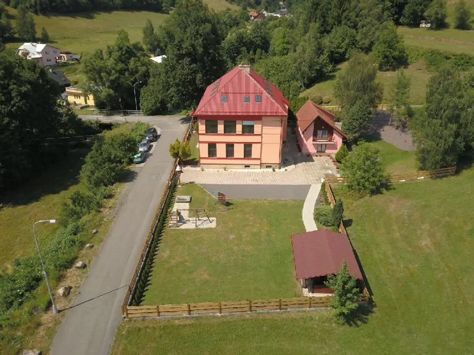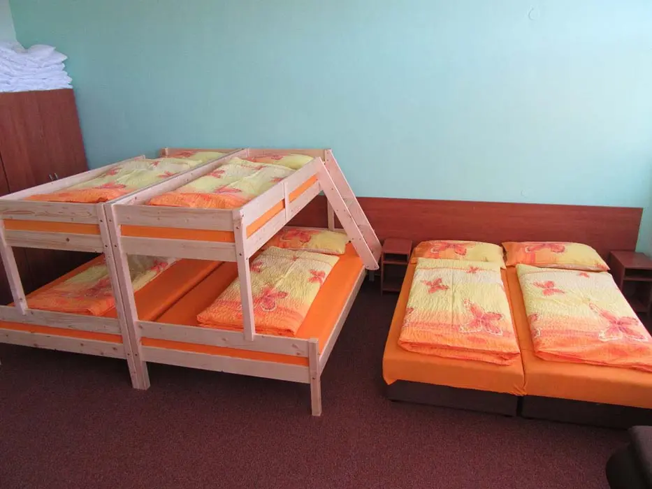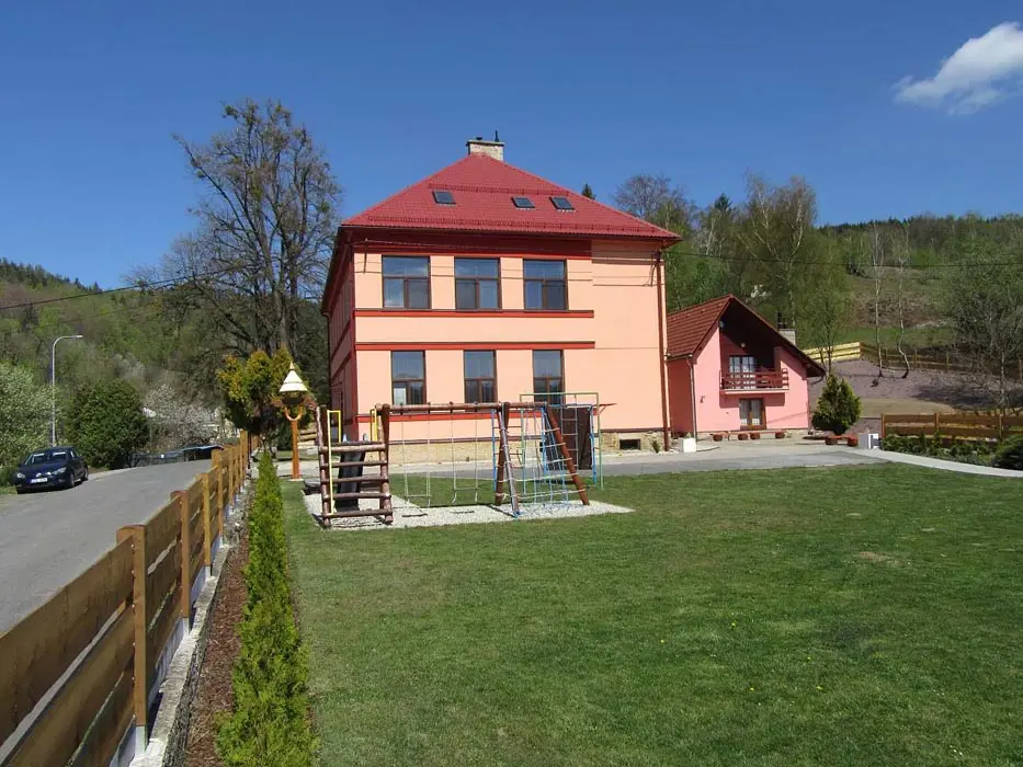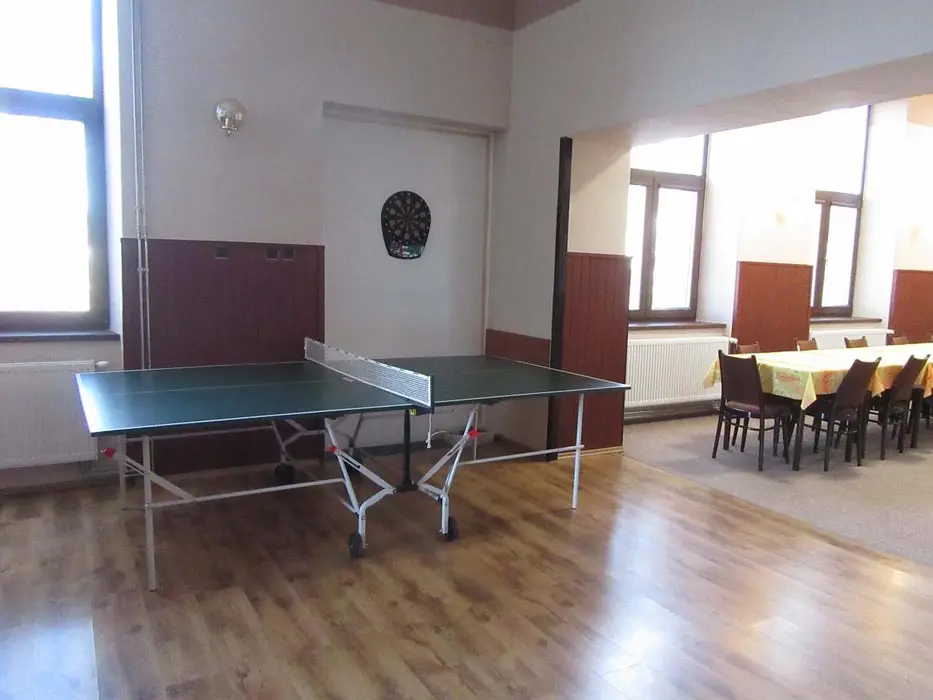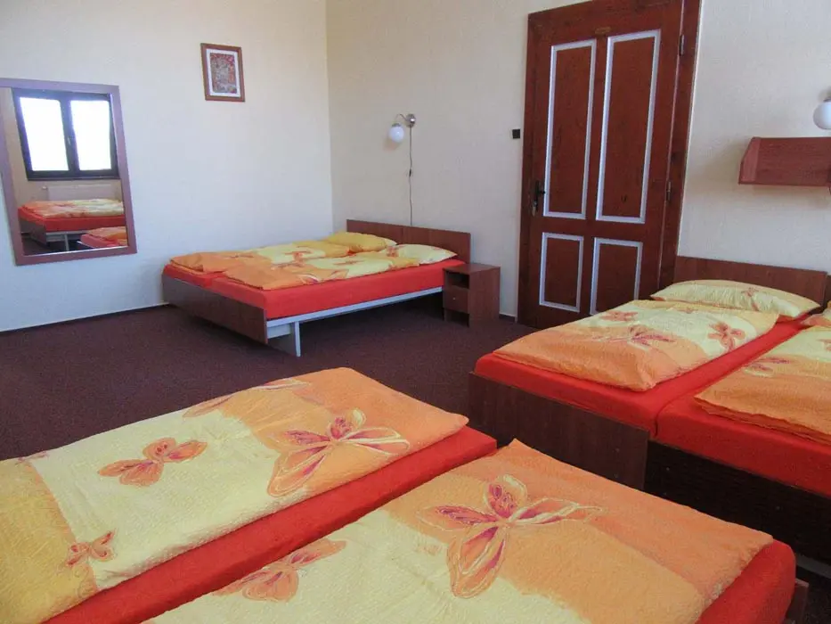 Společenská místnost s posezením, bar, velká chladnička na nápoje, plně vybavená kuchyně. 14 ložnic - přízemí: 1x2, 3x2 + v 3 přistýlky, 2x4, 1x4 + přistýlka, 1x6, 1x12 lůžek. V patře: 2x2, 3x4 lůžka. Soc. zařízení - 12 ložnic má svoje - sprcha + WC, 2 ložnice mají společné sprchy + toalety. Vytápění - pevná paliva, centrální, radiátory
