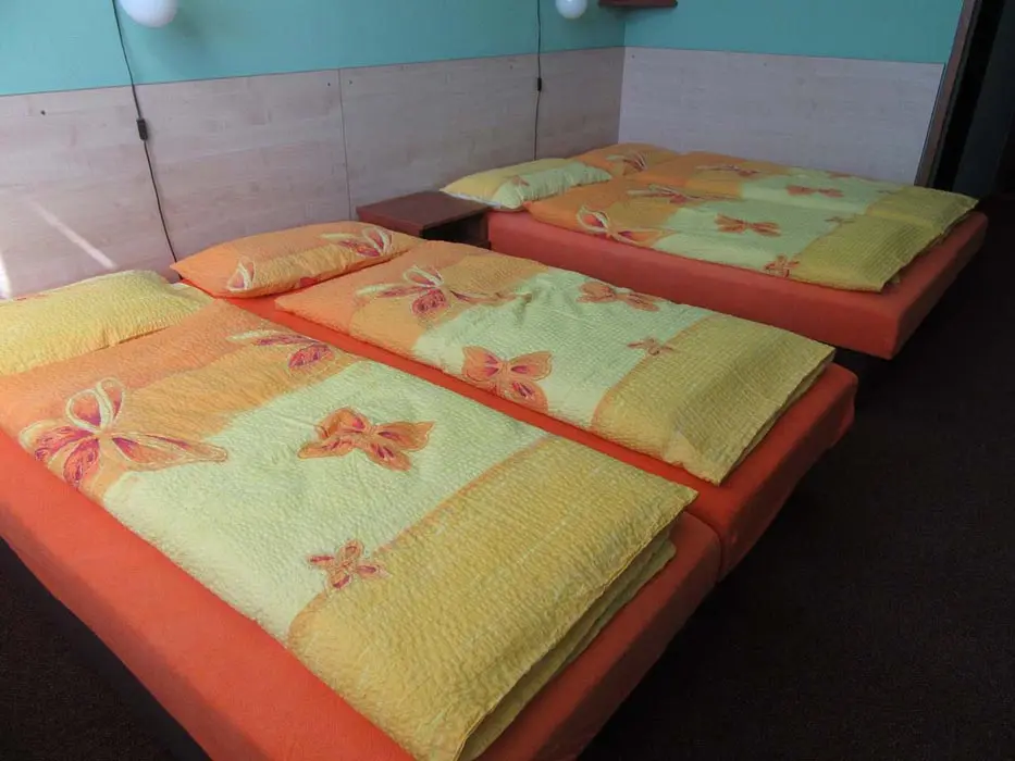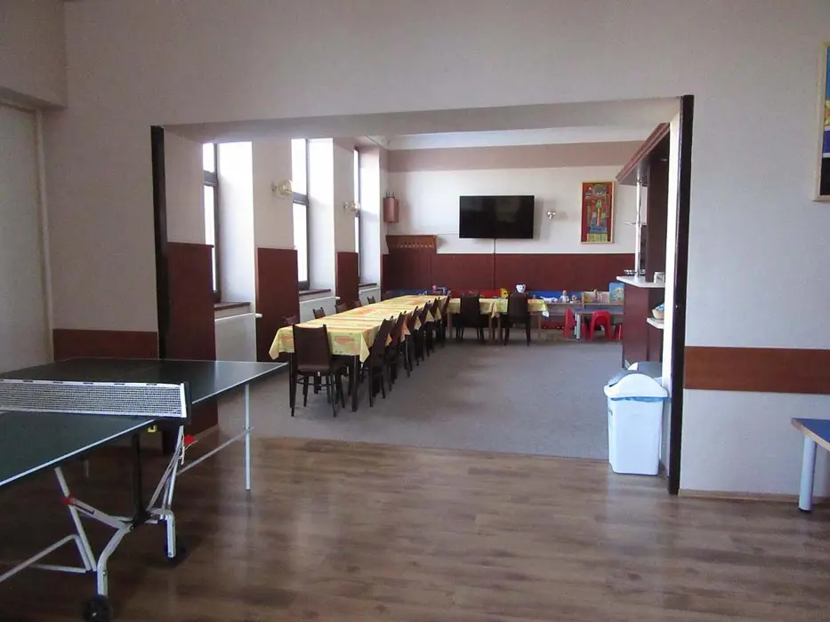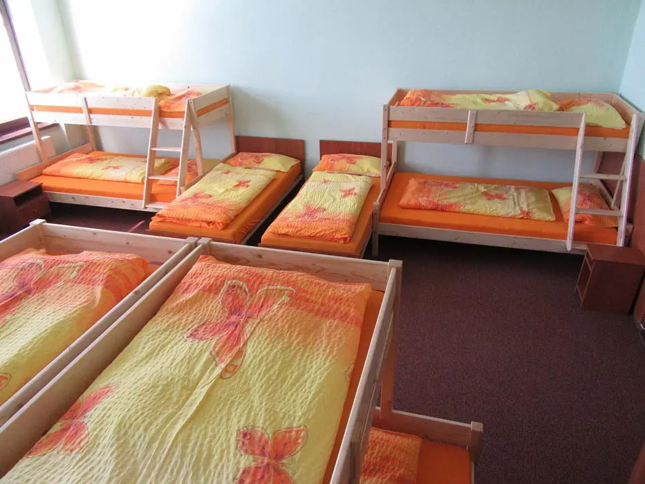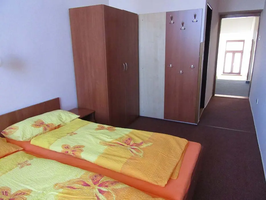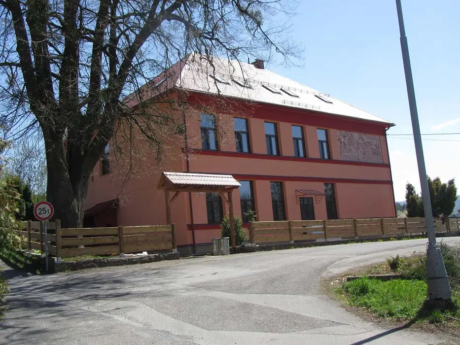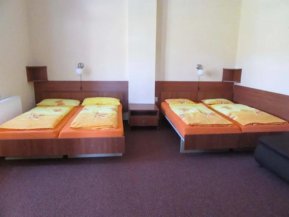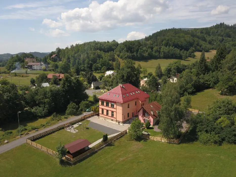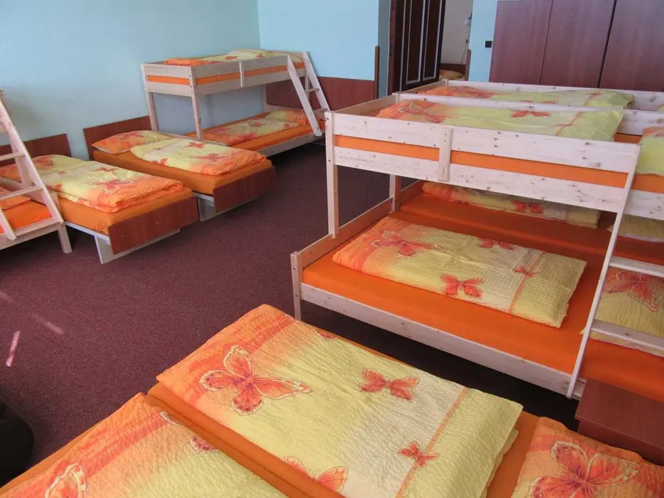 Společenská místnost s posezením, bar, velká chladnička na nápoje, plně vybavená kuchyně. 14 ložnic - přízemí: 1x2, 3x2 + v 3 přistýlky, 2x4, 1x4 + přistýlka, 1x6, 1x12 lůžek. V patře: 2x2, 3x4 lůžka. Soc. zařízení - 12 ložnic má svoje - sprcha + WC, 2 ložnice mají společné sprchy + toalety. Vytápění - pevná paliva, centrální, radiátory