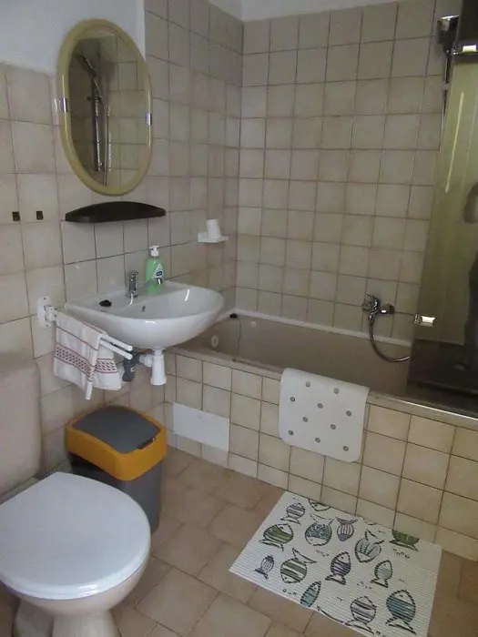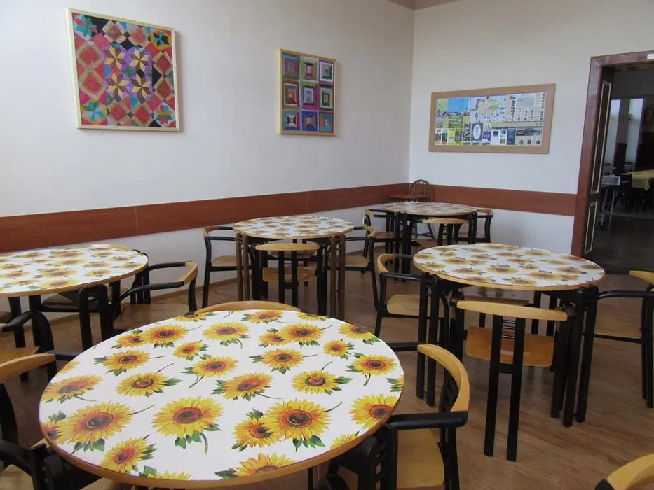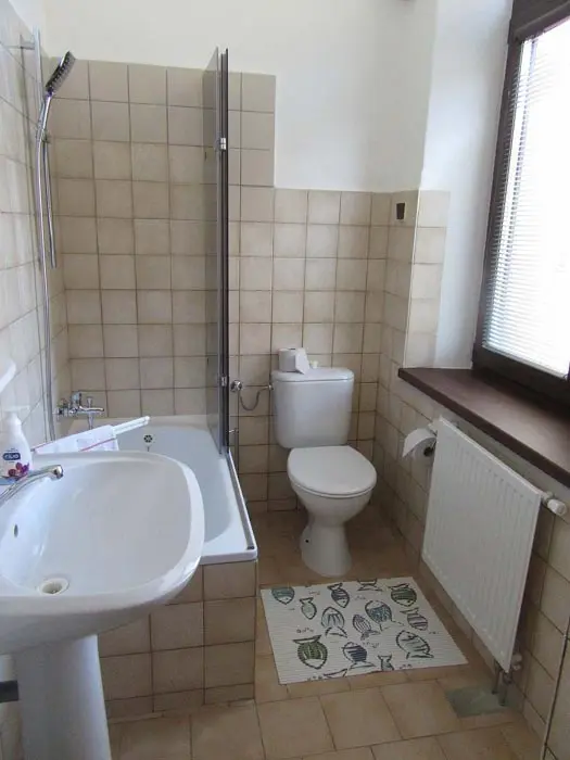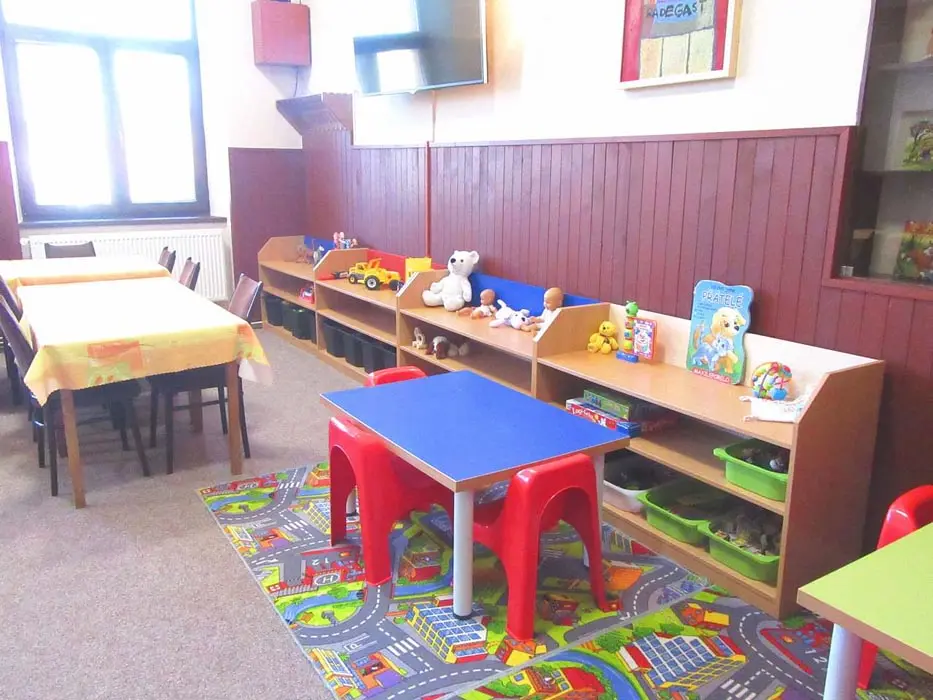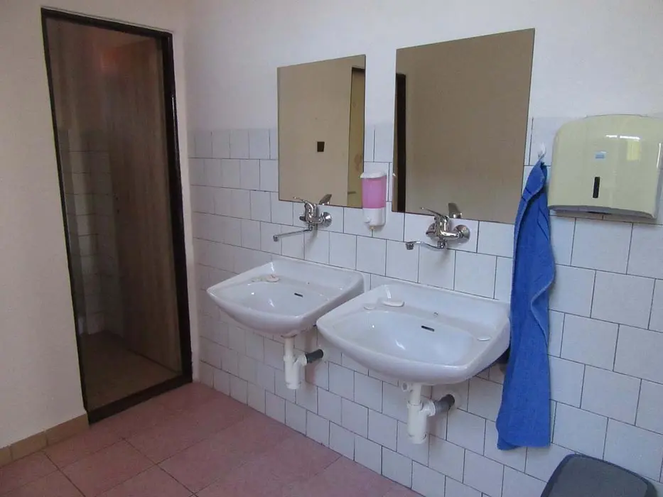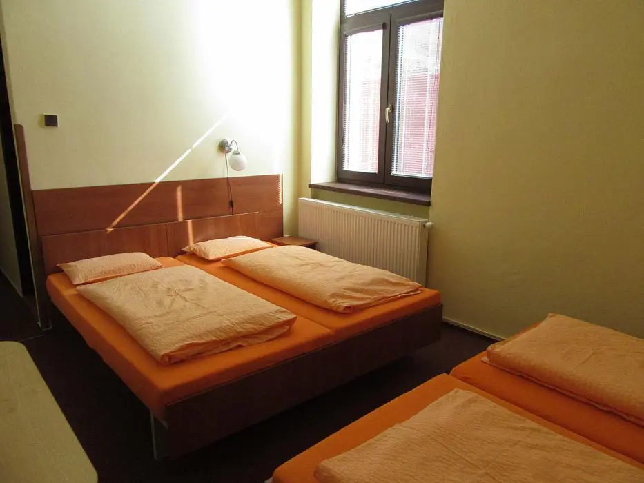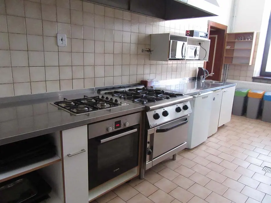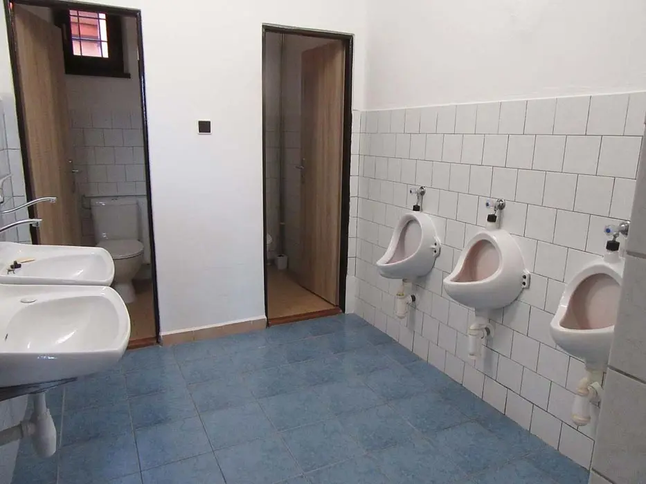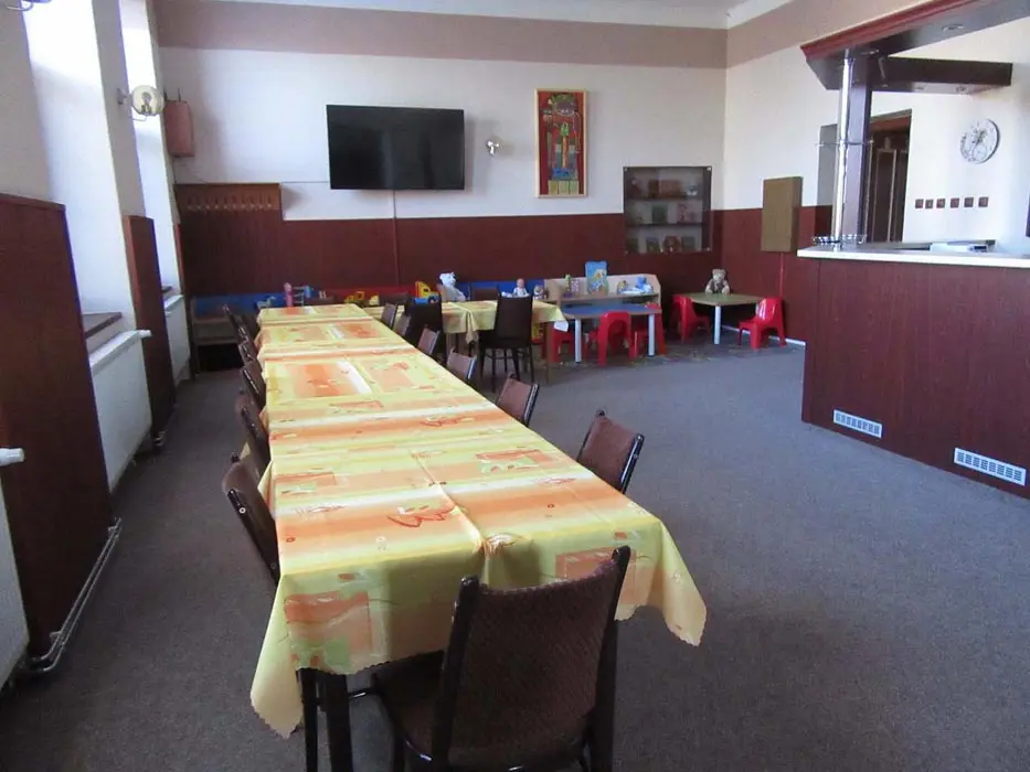 Společenská místnost s posezením, bar, velká chladnička na nápoje, plně vybavená kuchyně. 14 ložnic - přízemí: 1x2, 3x2 + v 3 přistýlky, 2x4, 1x4 + přistýlka, 1x6, 1x12 lůžek. V patře: 2x2, 3x4 lůžka. Soc. zařízení - 12 ložnic má svoje - sprcha + WC, 2 ložnice mají společné sprchy + toalety. Vytápění - pevná paliva, centrální, radiátory