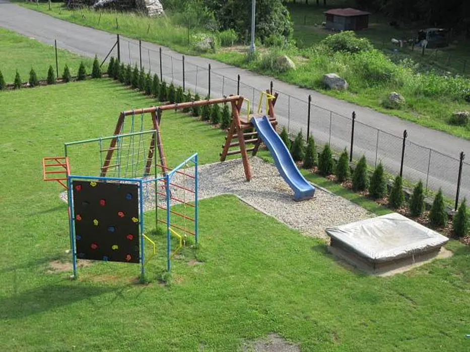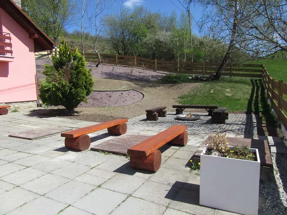 Zahrádka se slunečníky s výhledem na dětské hrací hřiště, skluzavka, pískoviště, houpačka, posezení, gril - 300 Kč za pronájem