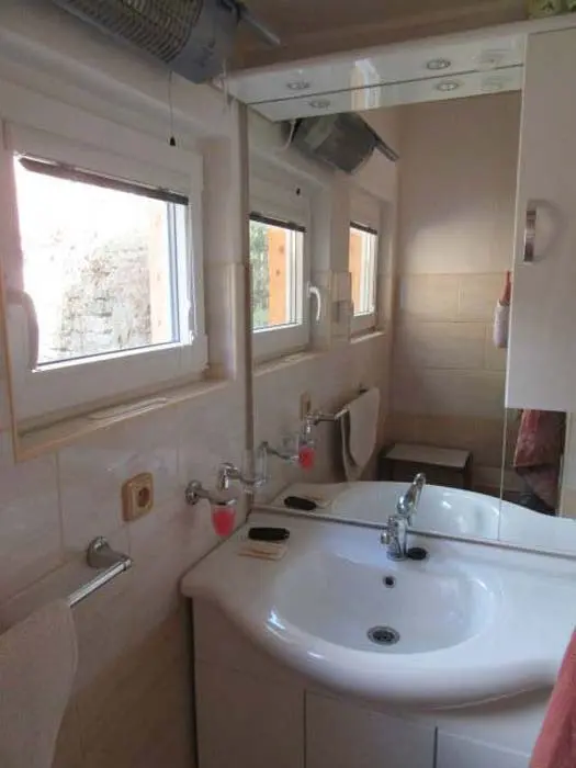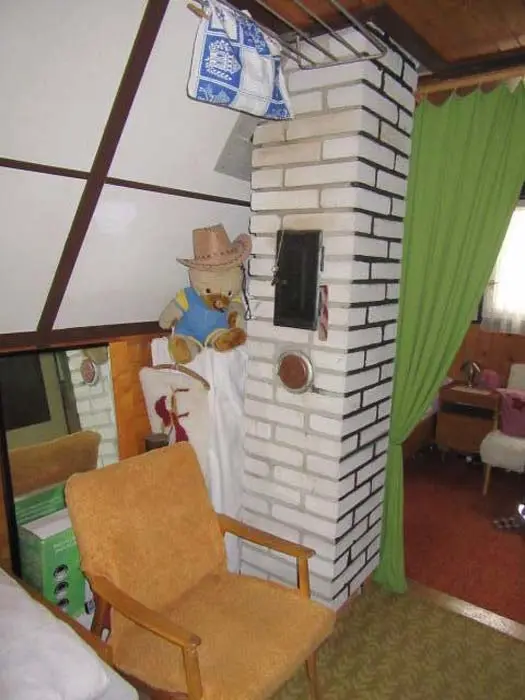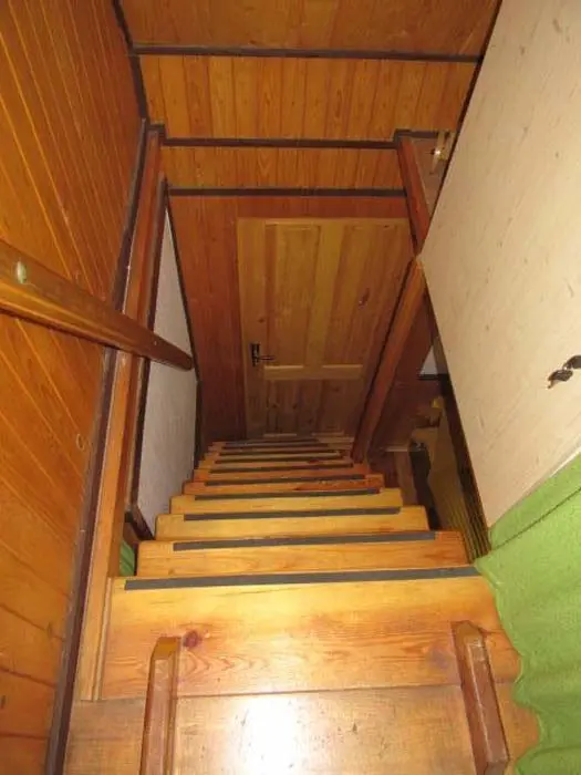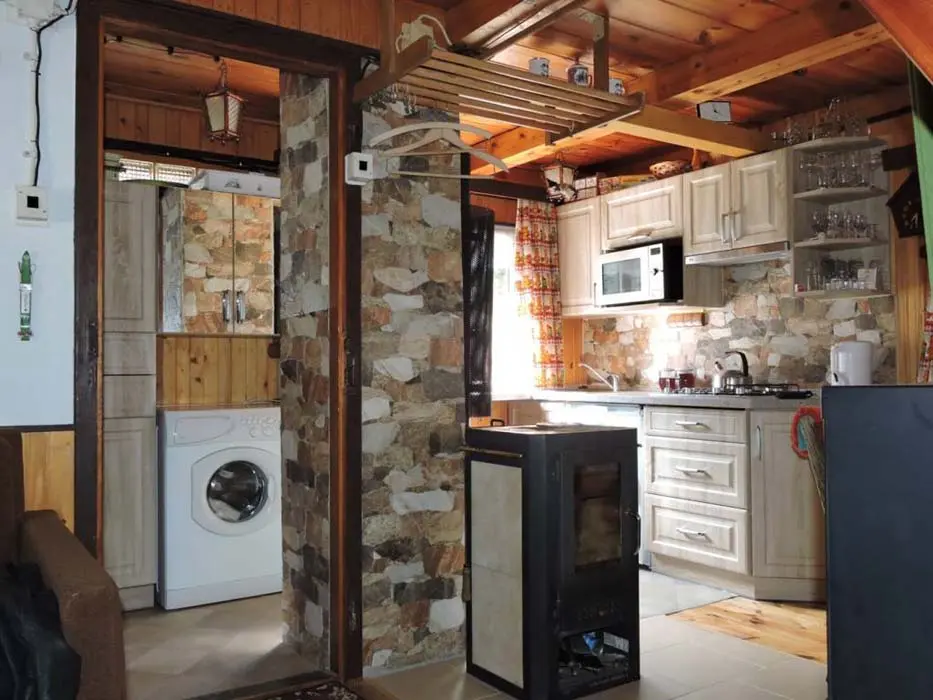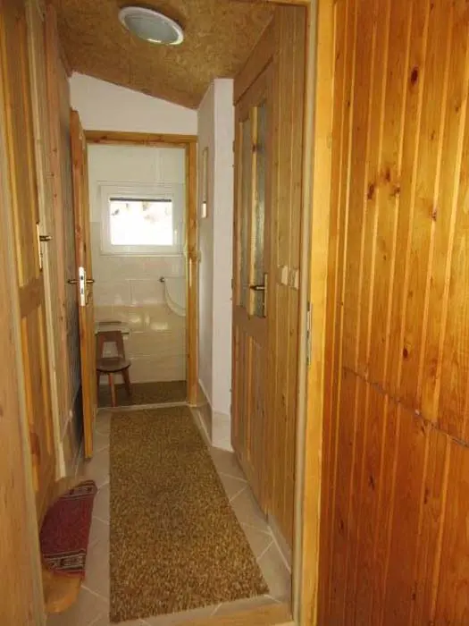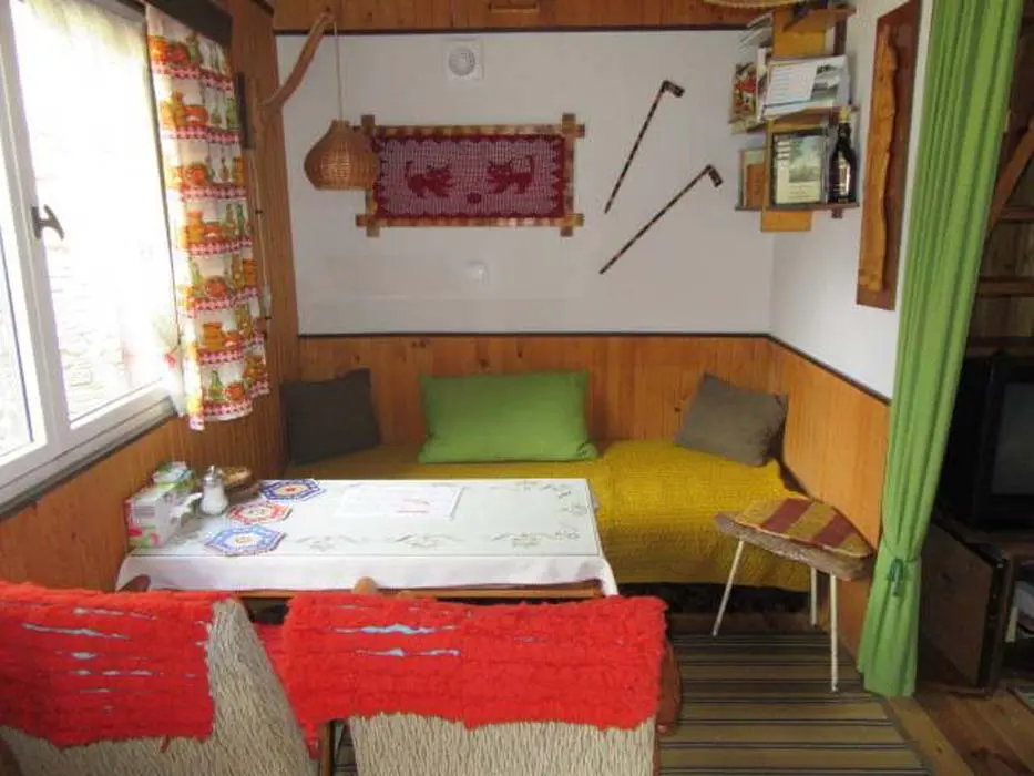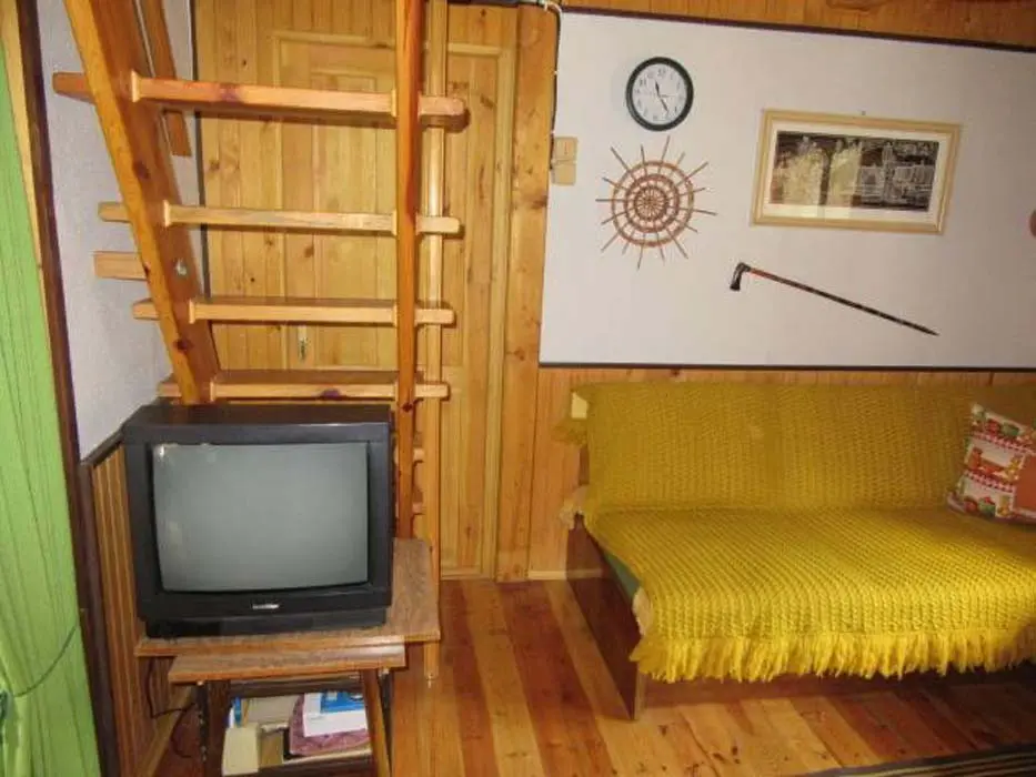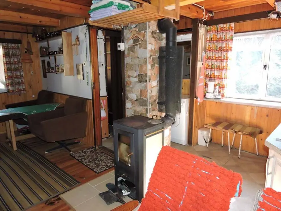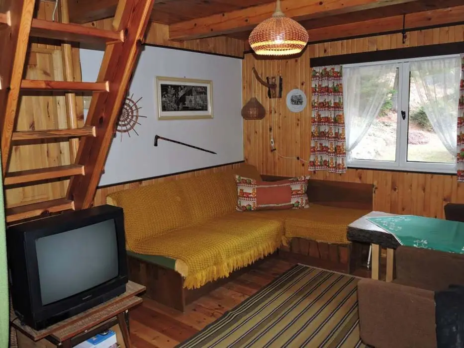 Obývací pokoj s posezením ( možnost 2 přistýlek ) - spojený s kuchyní, TV. Kuchyně - lednička s výparníkem, mikrovlnná trouba, k vaření dvouplotýnková sklokeramická el. deska + 2x plynový hořák. V podkroví 1 ložnice 1x4 lůžka - oddělena napůl závěsem. Sociální zařízení - 1x koupelna se sprchovým koutem a umyvadlem, 1x WC. Topení - krbová kamna, v podkroví přímotop
