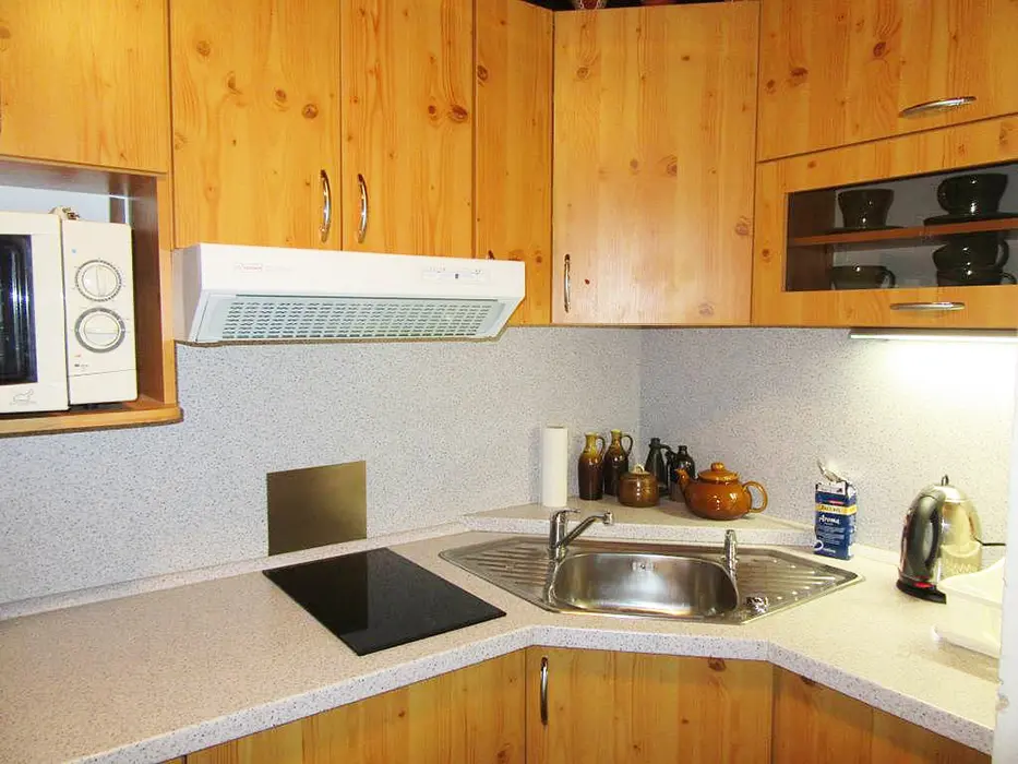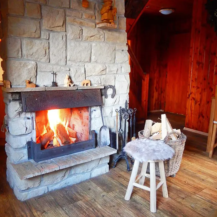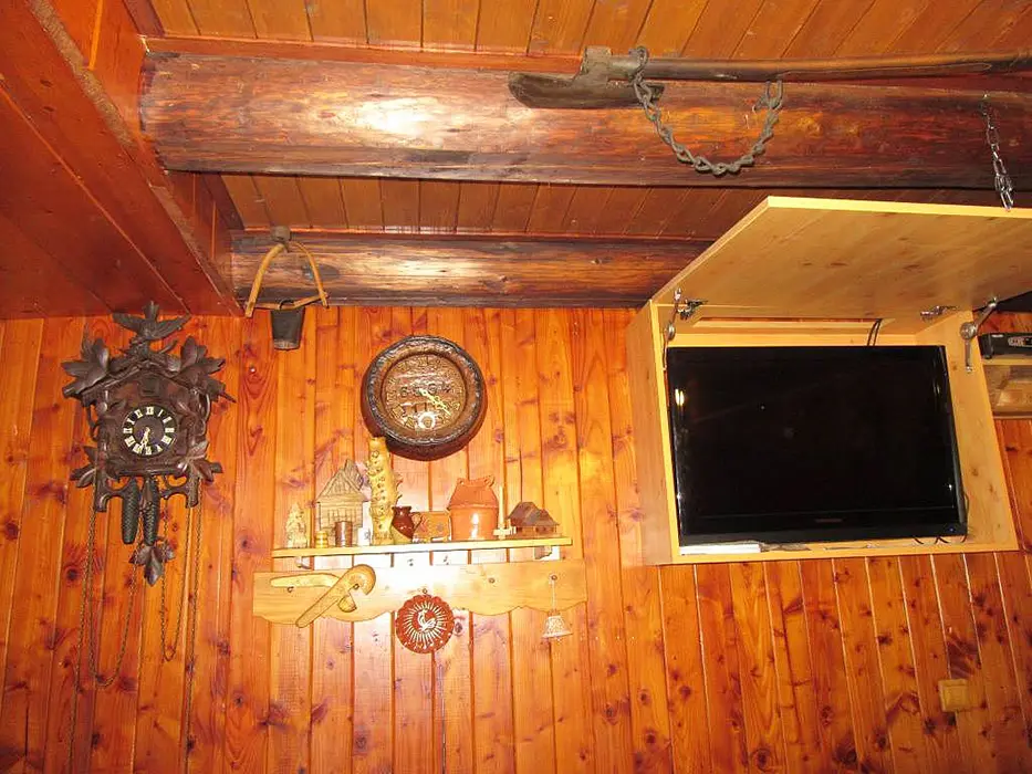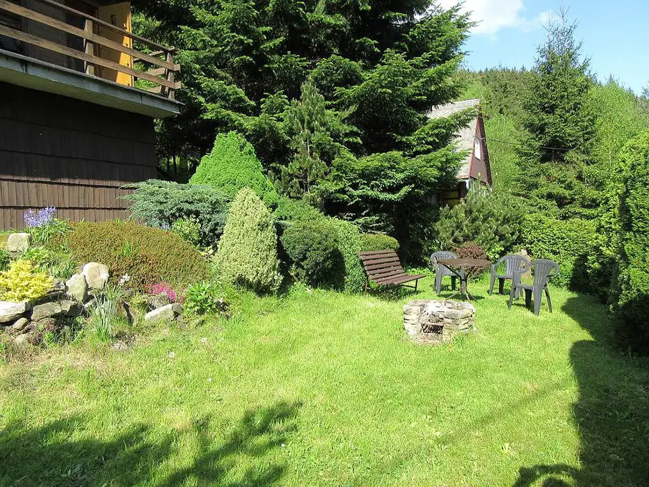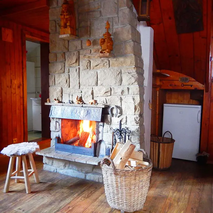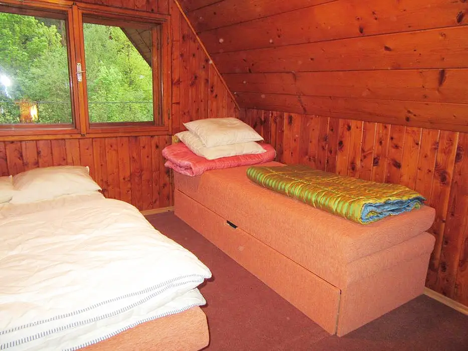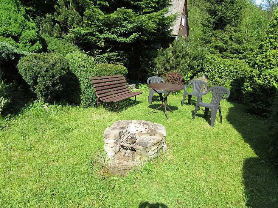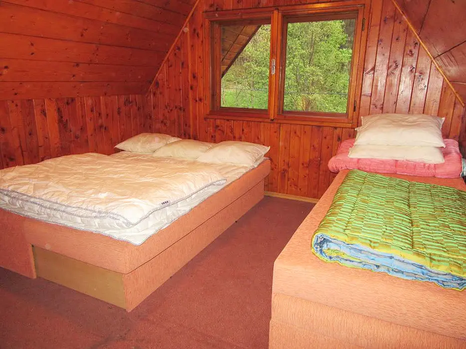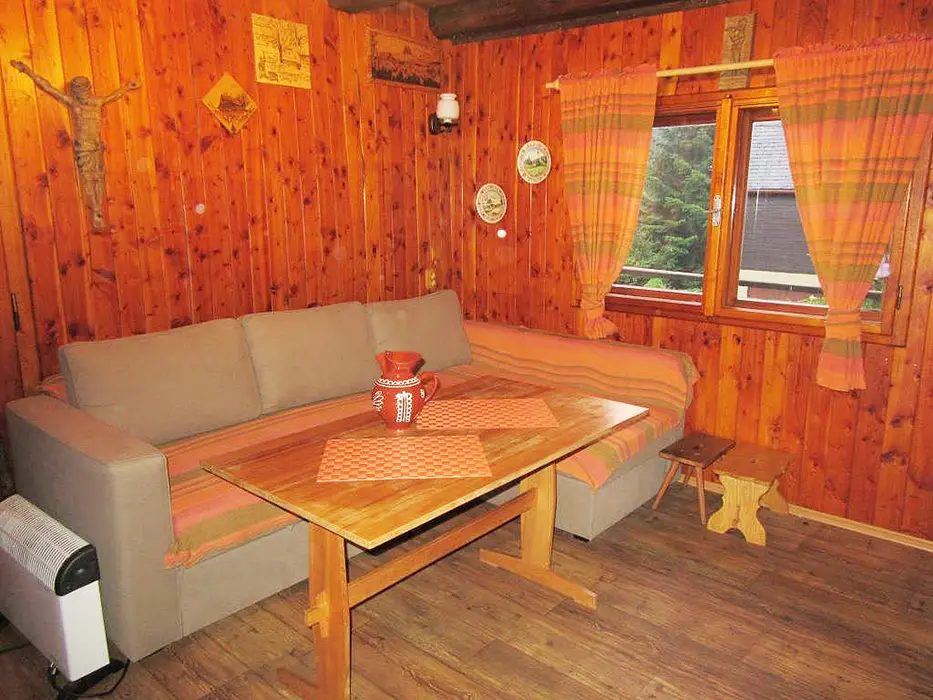 Obývací pokoj s posezením u krbu, TV, jídelní stůl, rohová pohovka - po rozložení 2 lůžka. Kuchyně - spojená s obývacím pokojem - el. sklokeramická varná deska, varná konvice, mikrovlnka, lednice, nádobí. V podkroví 1 ložnice 1x4 lůžka. Sociální zařízení - sprchový kout, umyvadlo, samostatné WC s umyvadlem. Topení - krb, el. přímotopy.