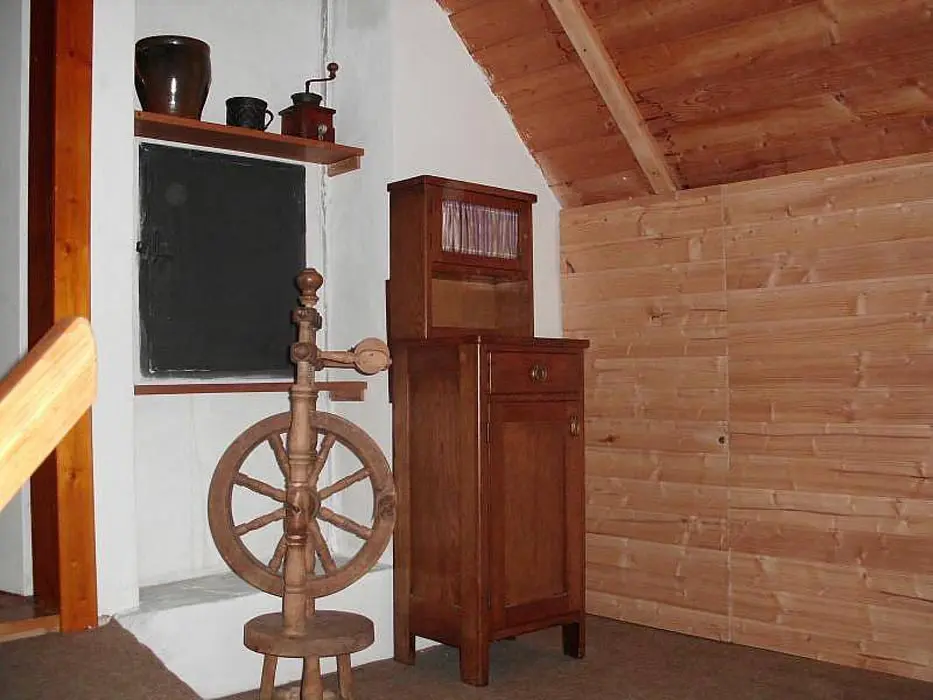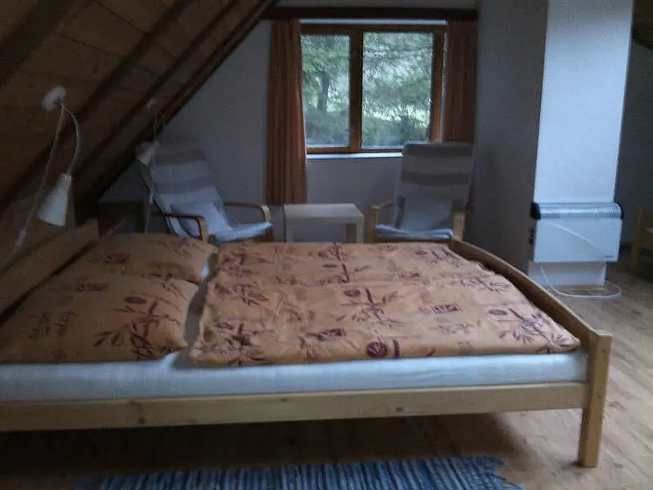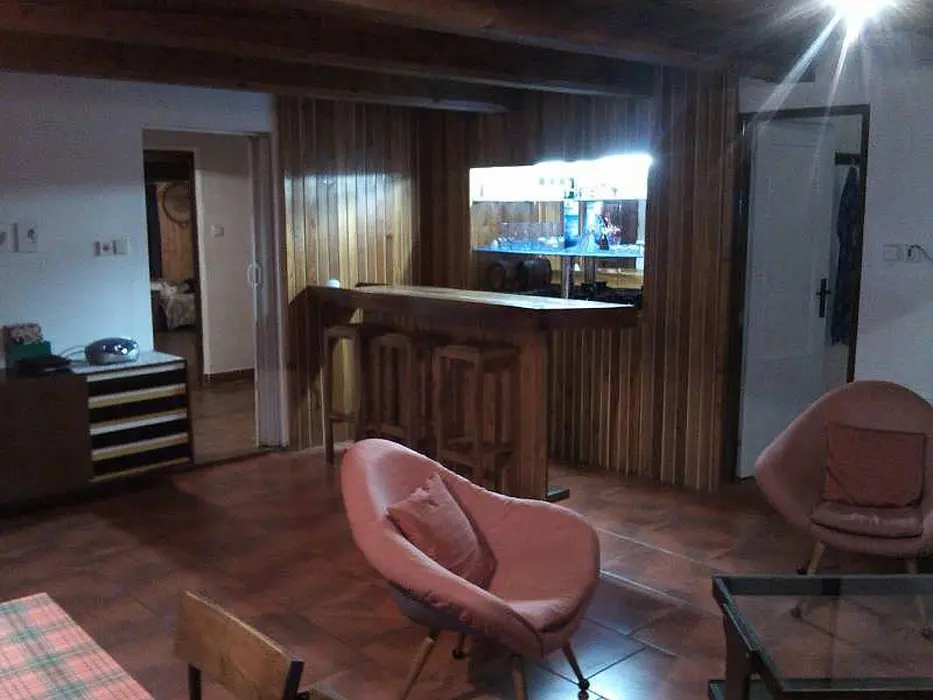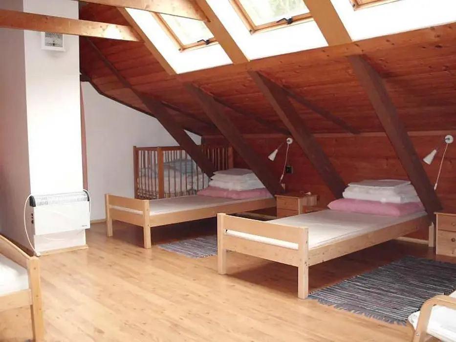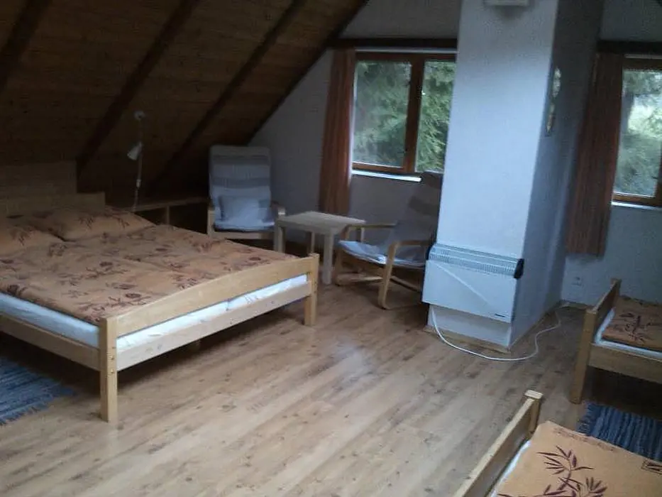 Vstupní prostorná chodba, kamenný sklep ( možnost uschování potravin a nápojů ), stylová valašská kuchyně - chlebová pec, velký dubový stůl, rozkládací pohovka - 2 lůžka, TV, vybavení kuchyně - sporák na dřevo, dvouplotýnkový vařič s el. troubou, toustovač, mikrovlnka, varná konvice, lednička a rádio. Za touto místností je další obývací pokoj - součástí je bar. V podkroví 2 ložnice 1x4, 1x6 lůžek + dětská postýlka. K ohřevu vody bojler 125 l. V objektu je pitná voda. Soc. zařízení - 1x koupelna s vanou, 2x WC. Topení - v kuchyni pec, v obývacím pokoji krb s rozvodem teplého vzduchu do ložnic v podkroví, v koupelně + WC + předsíni podlahové topení, el. přímotopy ve všech místnostech