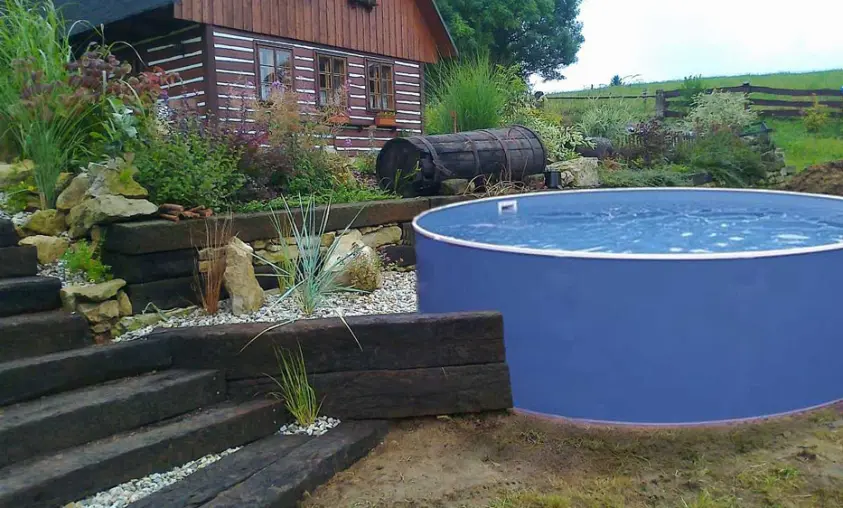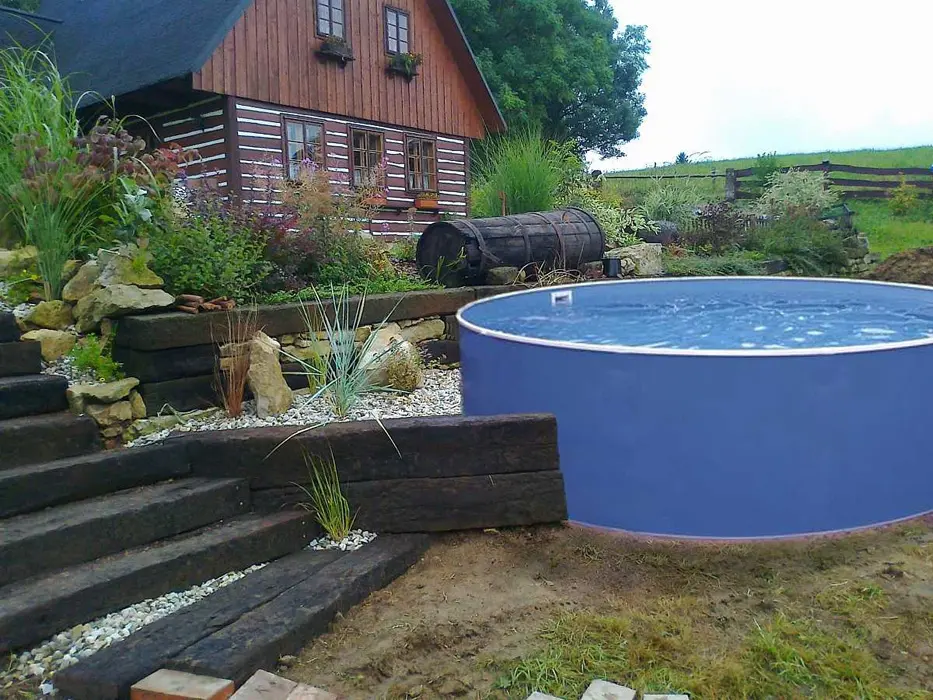 zapuštený bazén se solárním ohřevem o průměru 3,66 m, hloubka 1 m