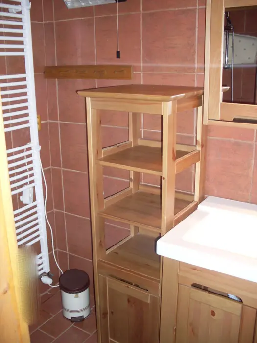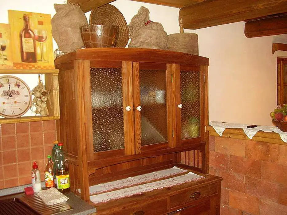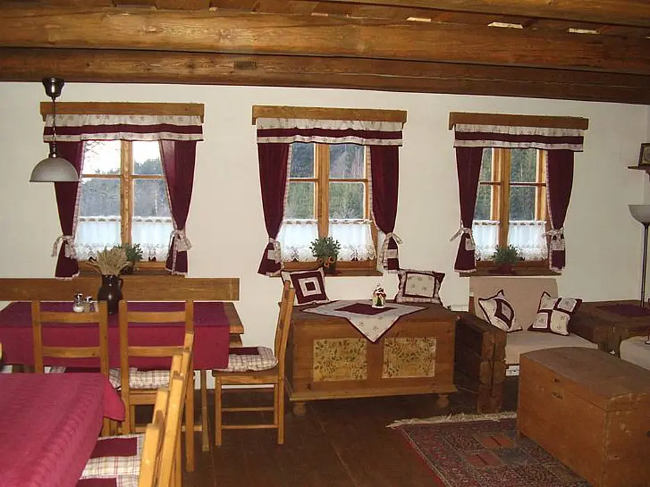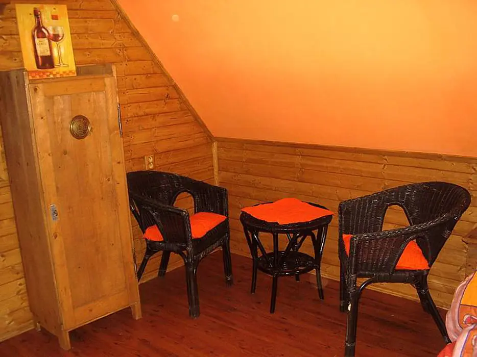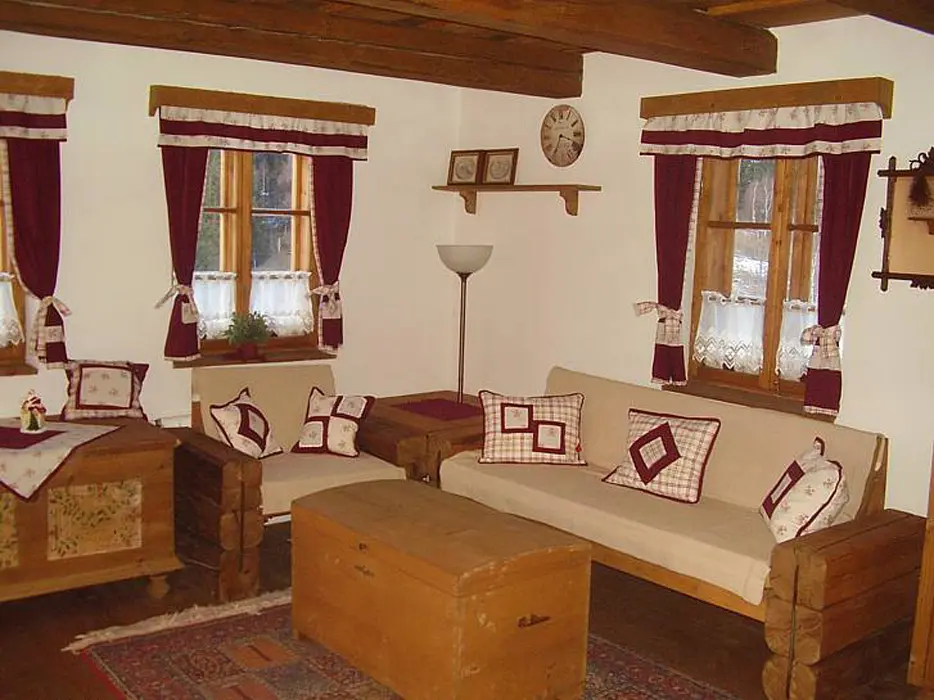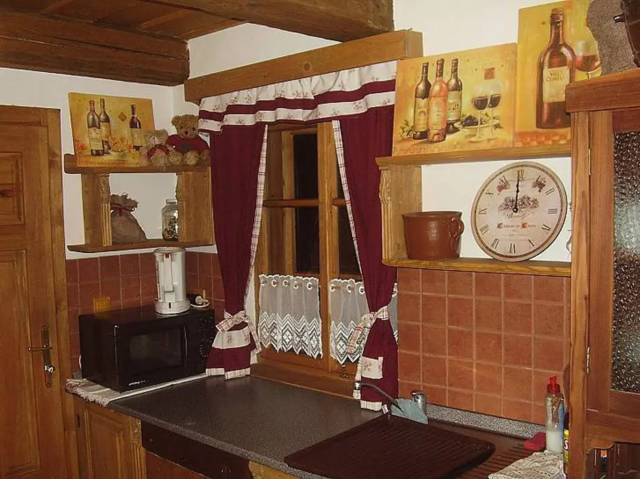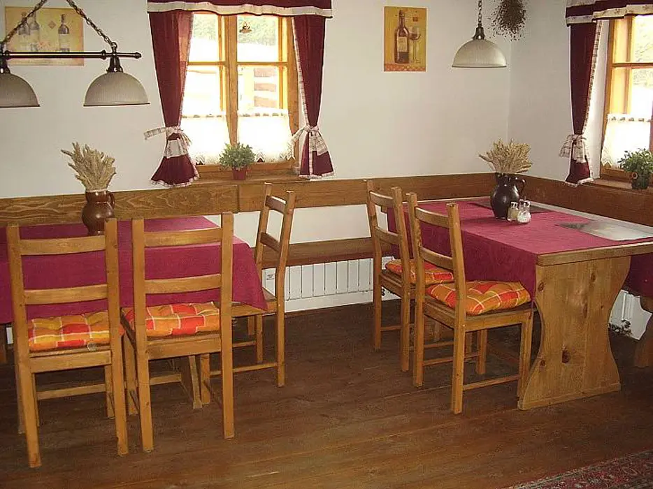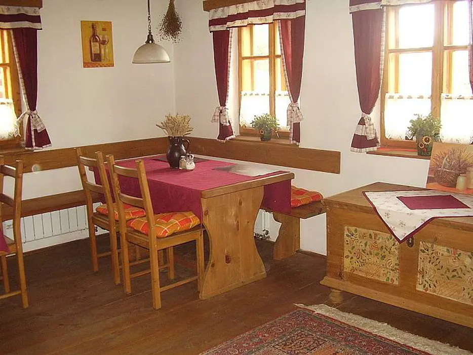 Obývací pokoj - spojený s jídelnou se dvěma stoly + odpočinková část (sedací souprava, TV, kabelová televize, DVD). Kuchyně - v přízemí, horkovzdušná trouba, sklokeramická deska, mikrovlnná trouba, myčka na nádobí, varná konvice, kávovar, toastovač, sendvičovač, mixér, fritéza, lednice s mrazákem, samostatná spíž. 3 ložnice - v podkroví 3x4 lůžka. Sociální zařízení - v přízemí, samostatné WC, koupelna se sprchovým koutem. Další WC je v patře. Topení - krbová kamna s rozvodem teplé vody do radiátorů ve všech místnostech, je možné použít i elektrický přímotop.