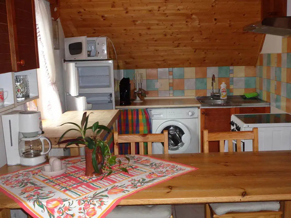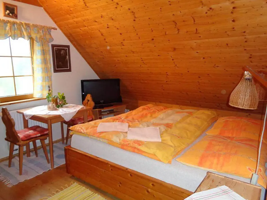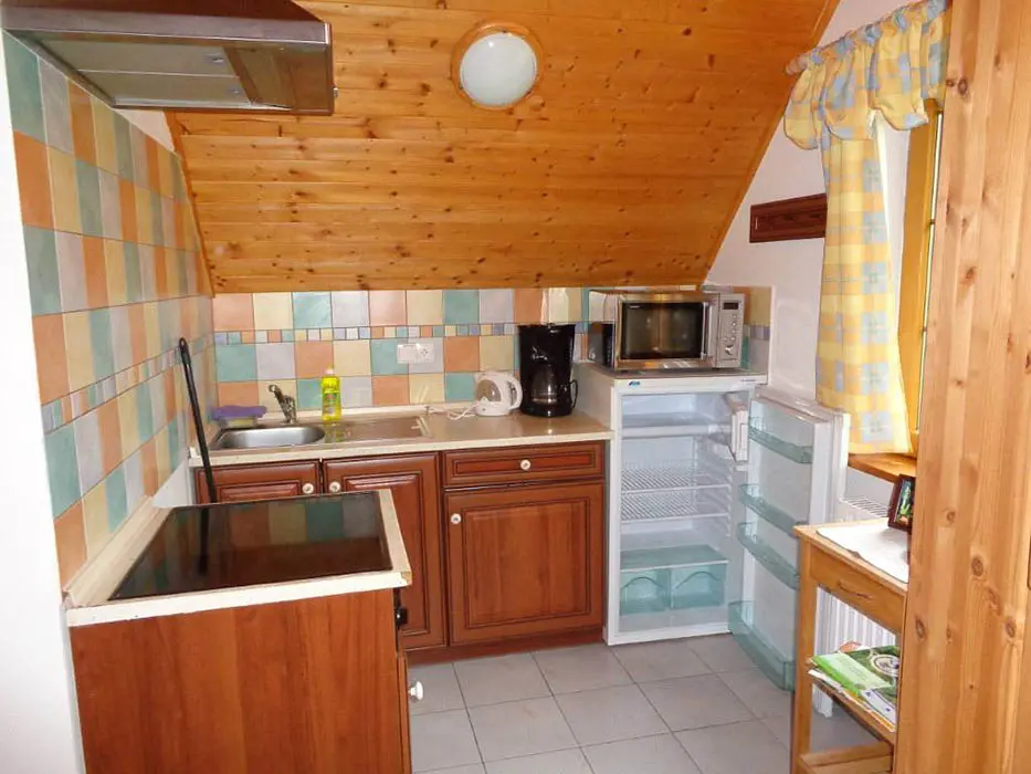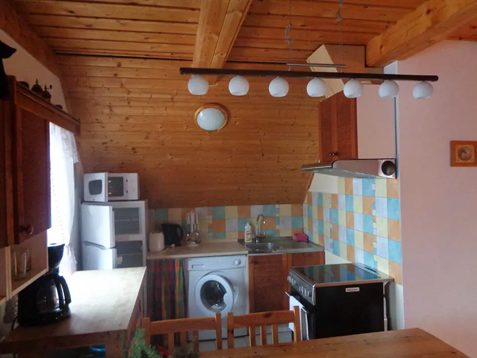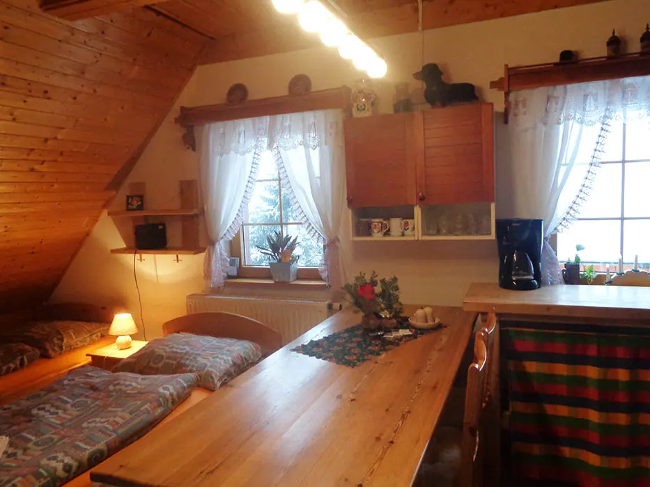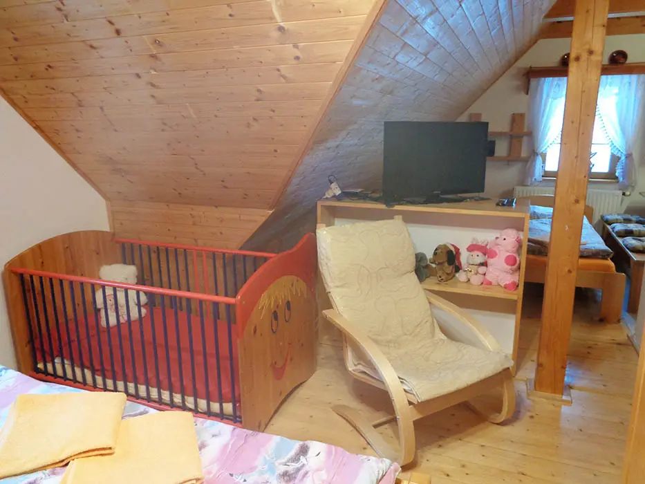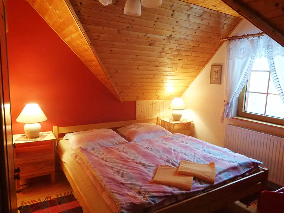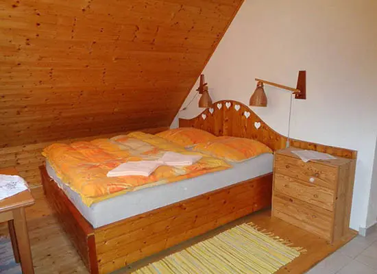V podkroví se nachází 2 apartmány - 1x2, 1x4 lůžka, v každém: kuchyně - sporák nebo varná deska, lednice, mikrovlnná trouba, varná konvice, překapávač na kávu, nádobí. K dispozici dětská postýlka. Sociální zařízení - sprchový kout, umyvadlo, WC. Možnost poskytnutí snídaně nebo polopenze - po dohodě.