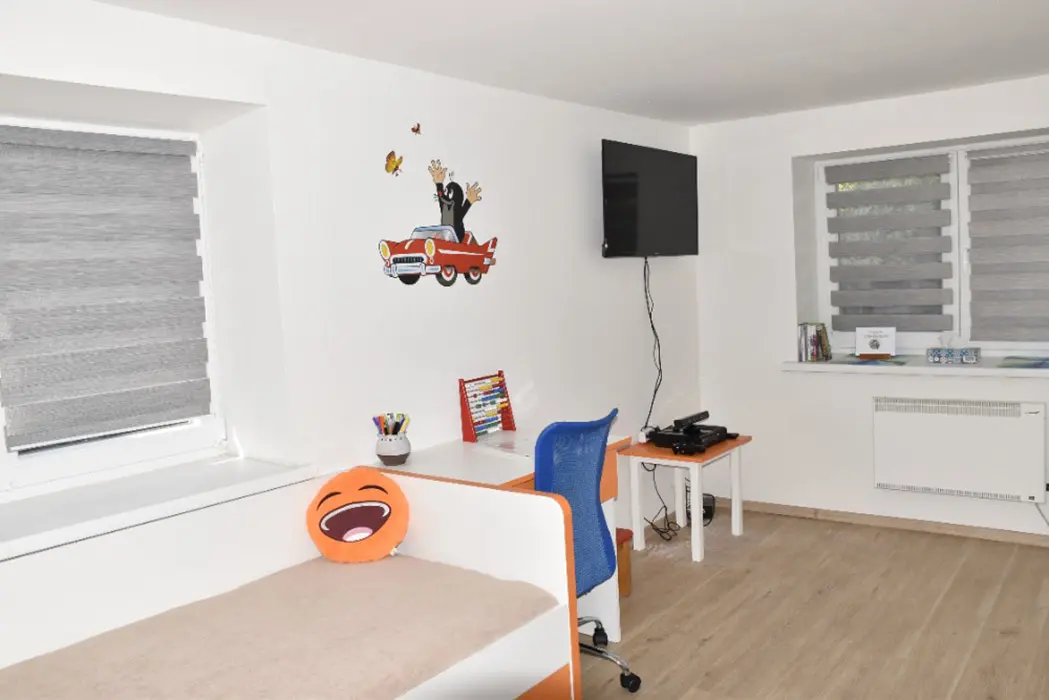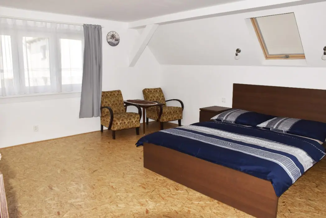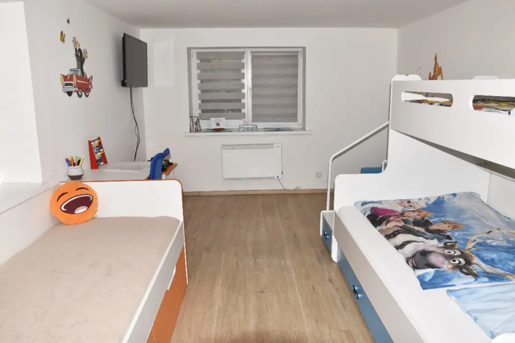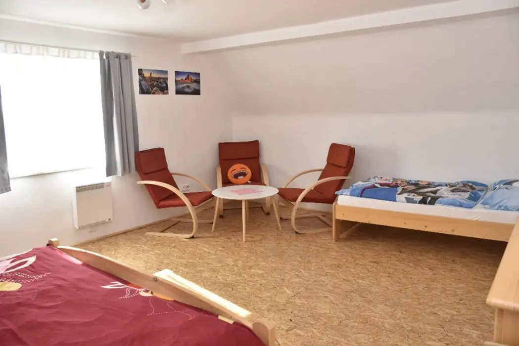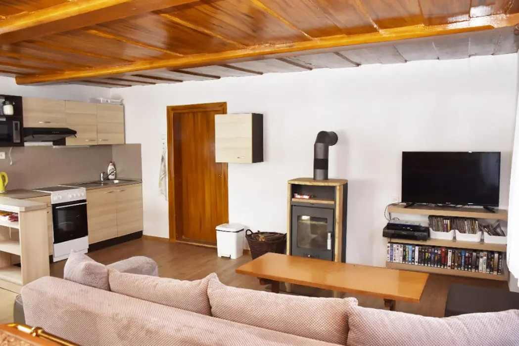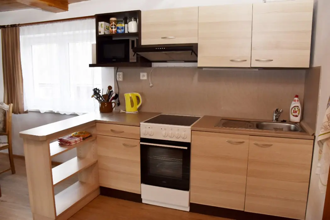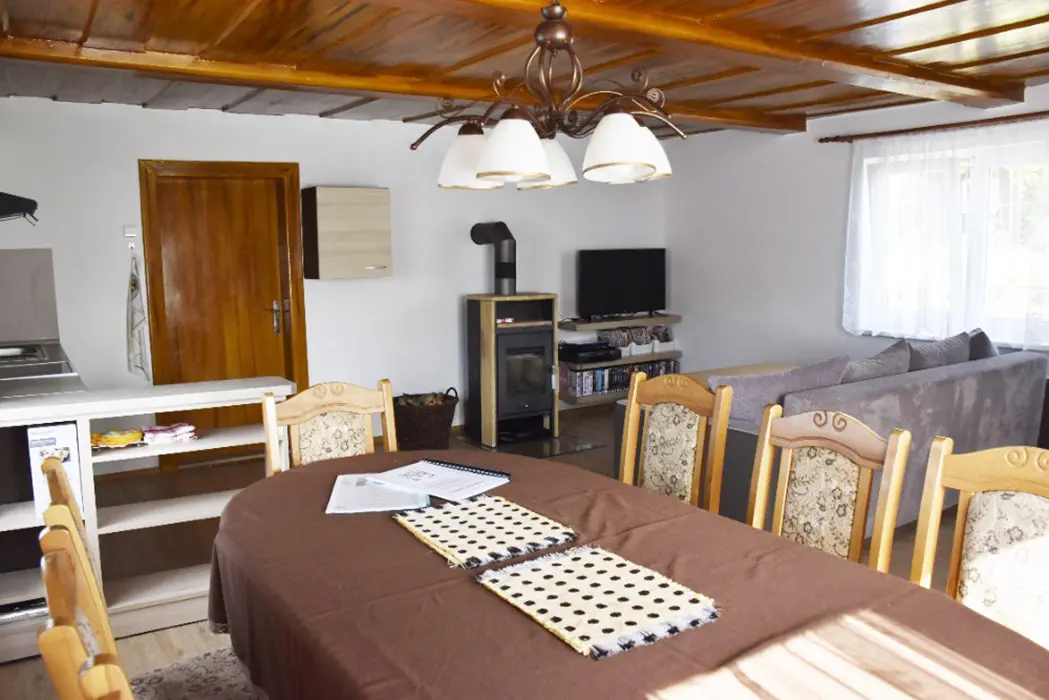 Obývací pokoj s posezením TV, bar, DVD, rádio. Kuchyně - el. sporák s troubou, lednice, varná konvice, mikrovlnná trouba, jídelní stůl, židle, nádobí, kávovar na překapávanou kávu a na espresso ( čaj a káva během pobytu zdarma ), topinkovač. 3 ložnice 1x3, 1x2, 1x2 ( tato je pro 2 dospělé osoby nebo 3 děti ). Sociální zařízení - sprchový kout s teplou vodou, pračka, samostatné WC. Topení: kuchyň + obývací pokoj - krbová kamna, koupelna - podlahové vytápění, ostatní prostory - elektrické přímotopy