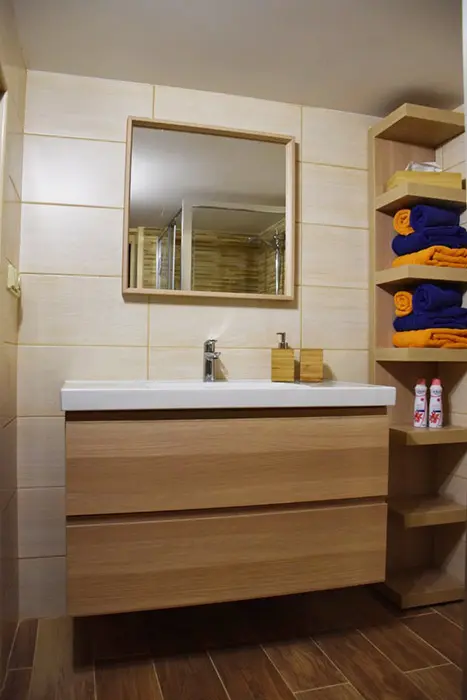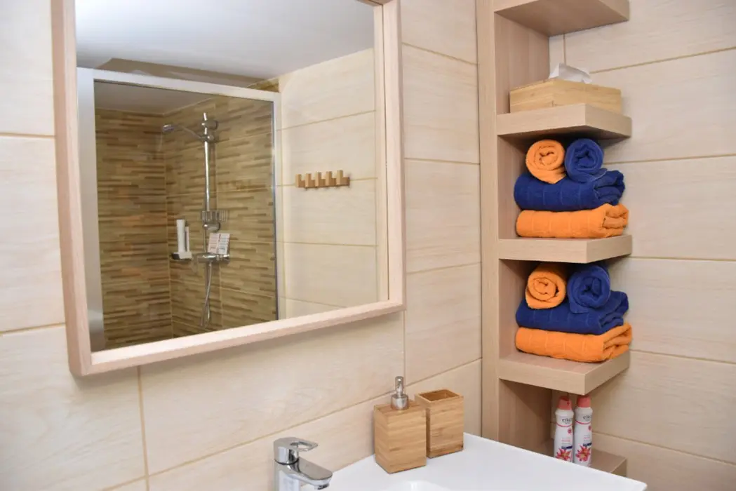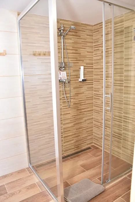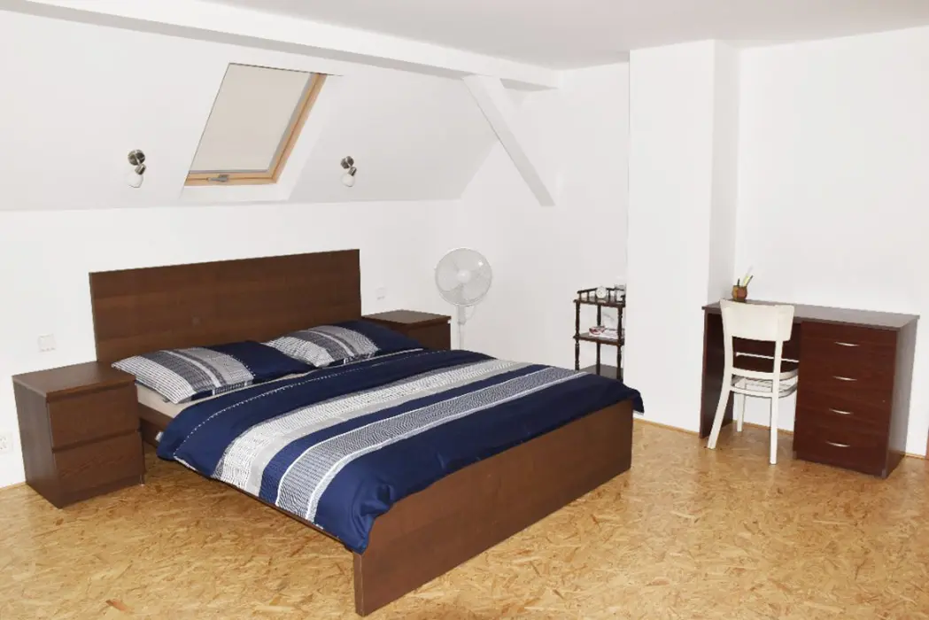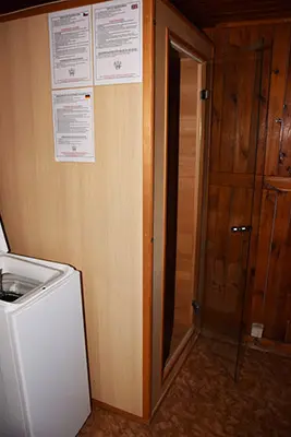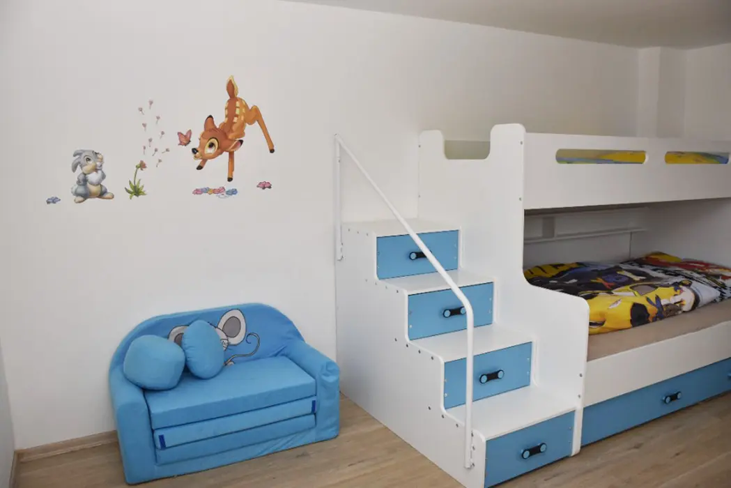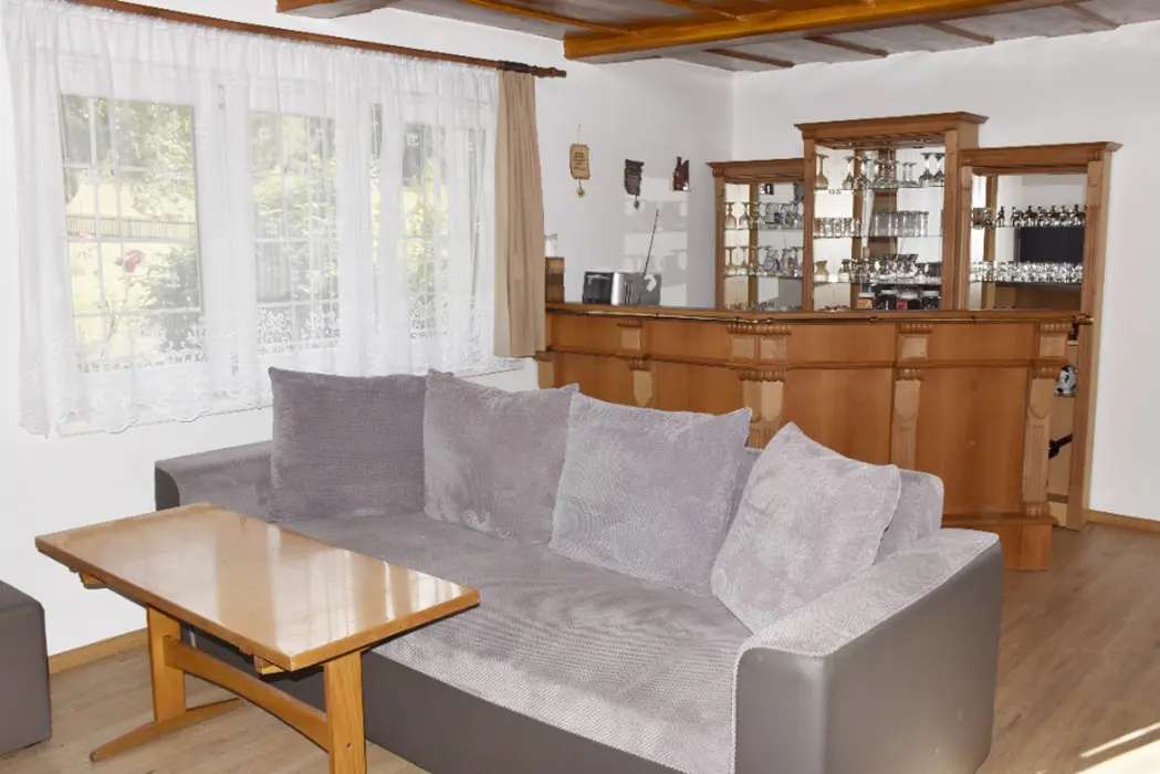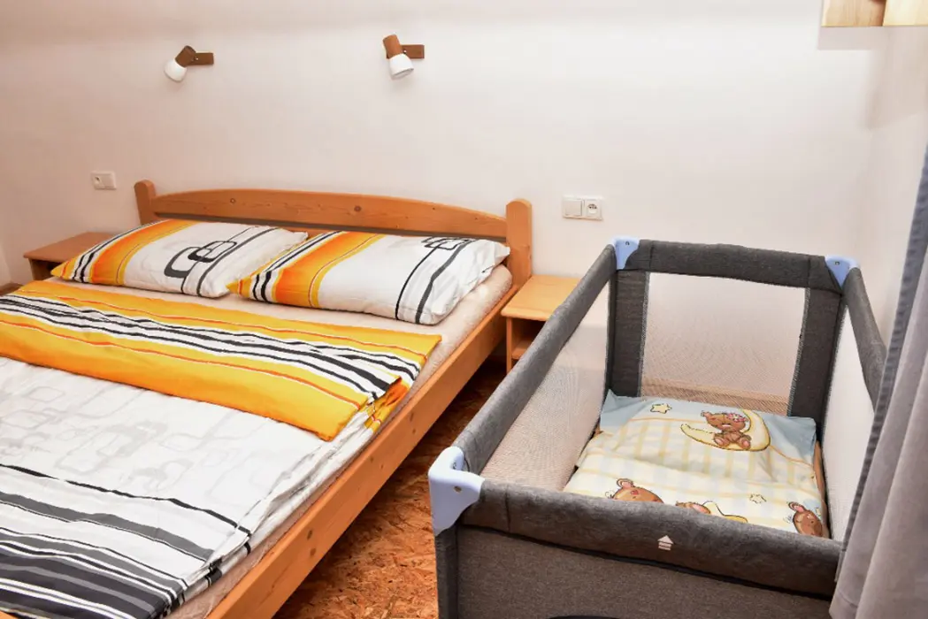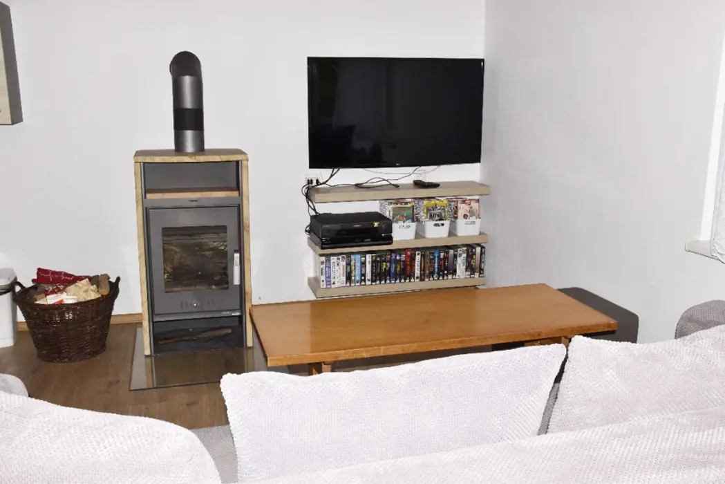 Obývací pokoj s posezením TV, bar, DVD, rádio. Kuchyně - el. sporák s troubou, lednice, varná konvice, mikrovlnná trouba, jídelní stůl, židle, nádobí, kávovar na překapávanou kávu a na espresso ( čaj a káva během pobytu zdarma ), topinkovač. 3 ložnice 1x3, 1x2, 1x2 ( tato je pro 2 dospělé osoby nebo 3 děti ). Sociální zařízení - sprchový kout s teplou vodou, pračka, samostatné WC. Topení: kuchyň + obývací pokoj - krbová kamna, koupelna - podlahové vytápění, ostatní prostory - elektrické přímotopy