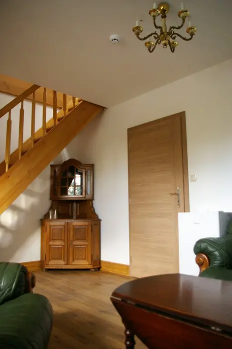 Obytná část - sedací souprava, varná konvice, chladnička, odpovídající nádobí, TV. V patře - 1 ložnice 1x4 lůžka. Soc. zařízení - sprcha + WC. Topení - centrální - VIZ FOTO Č. 18-21