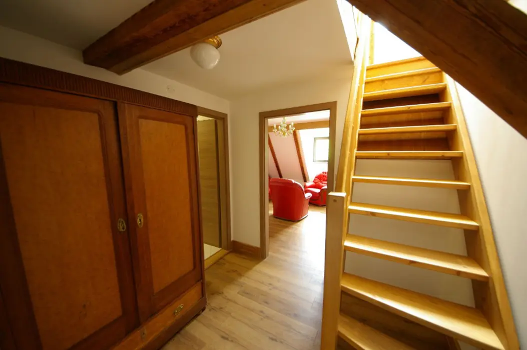 Obytná část - sedací souprava, varná konvice, chladnička, odpovídající nádobí, TV. V patře - 1 ložnice 1x4 lůžka. Soc. zařízení - sprcha + WC. Topení - centrální - VIZ FOTO Č. 34-37