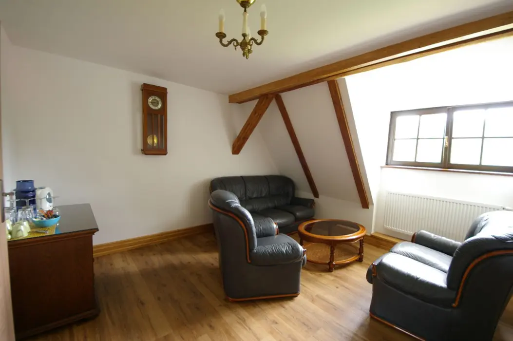 Obytná část - sedací souprava, jídelní stůl a židle, kuchyňský kout - varná konvice, chladnička, odpovídající nádobí, TV. V patře - 1 ložnice 1x2 lůžka. Soc. zařízení - sprcha + WC. Topení - centrální - VIZ FOTO Č. 12-17