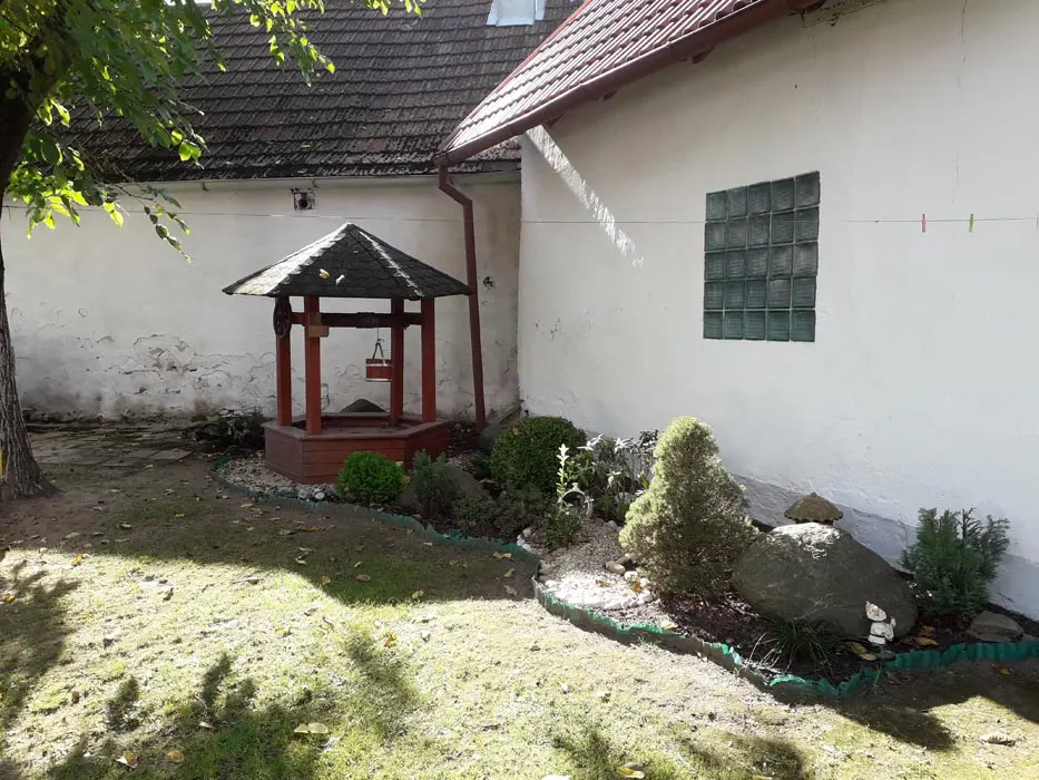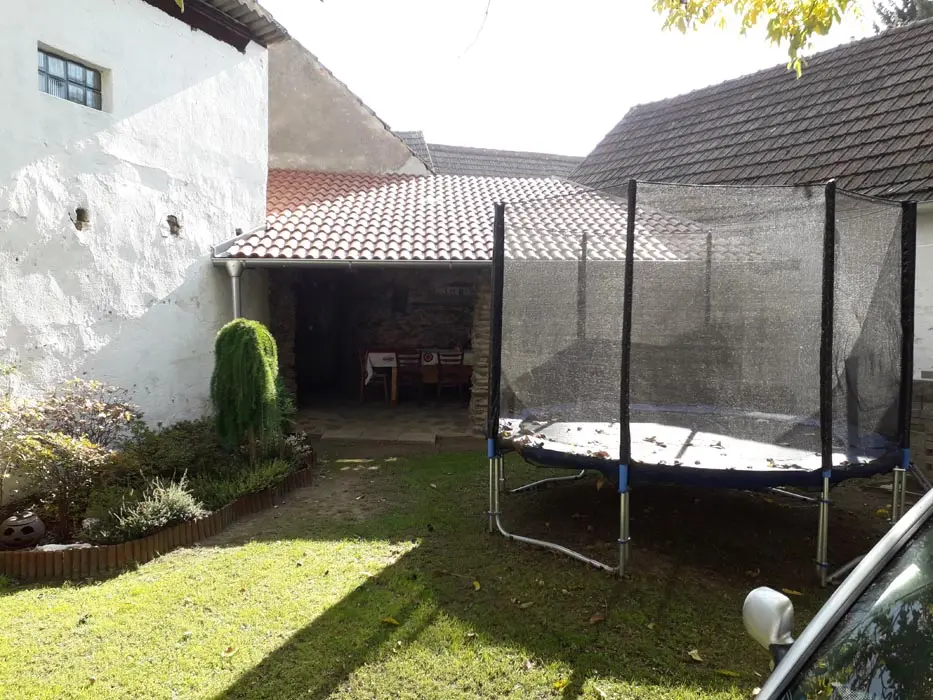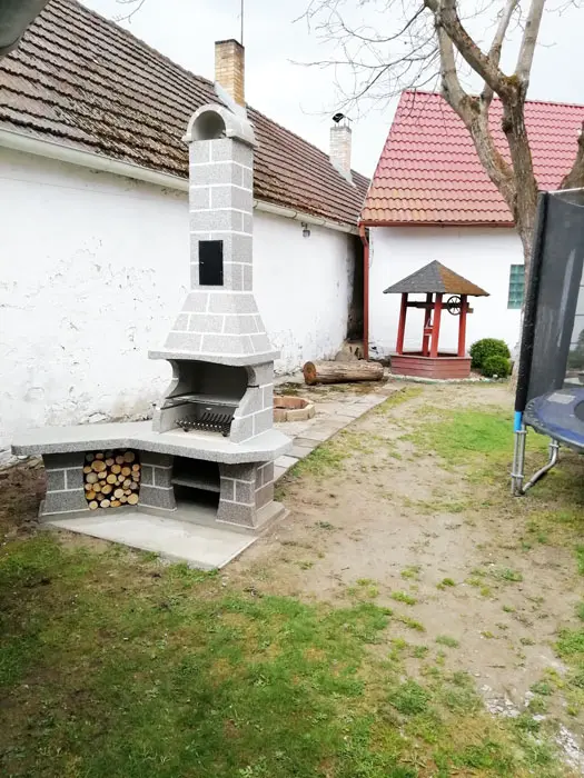 Kryté posezení - stůl a lavice, gril, venkovní kuchyně - sporák, nádobí, lednice, trampolína, houpačky