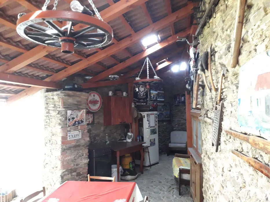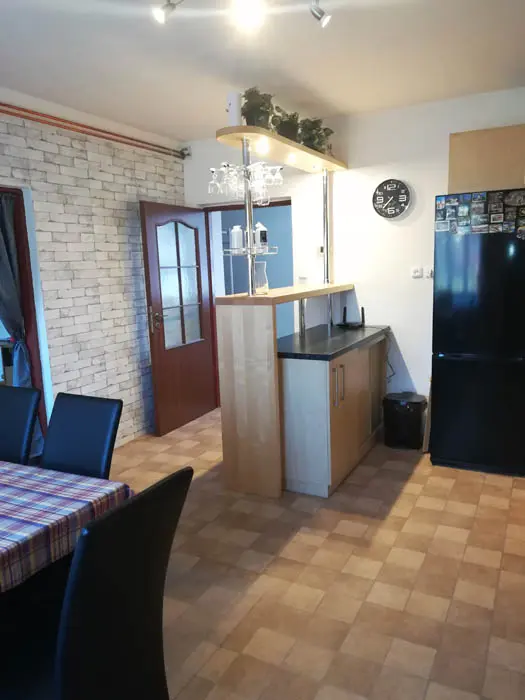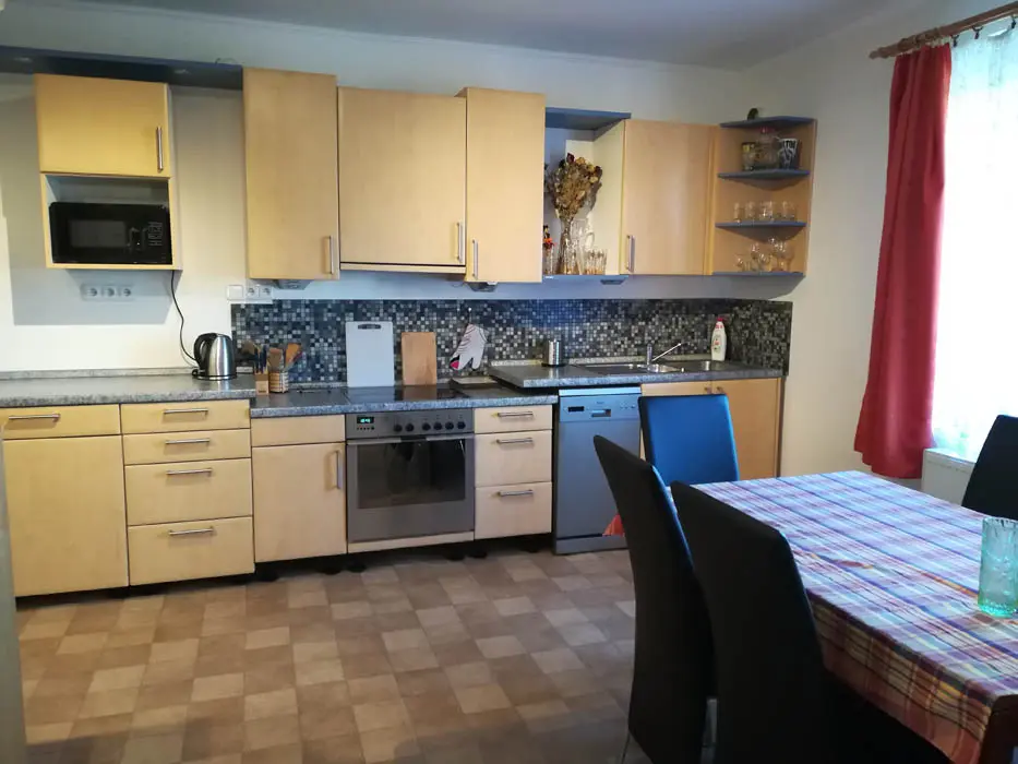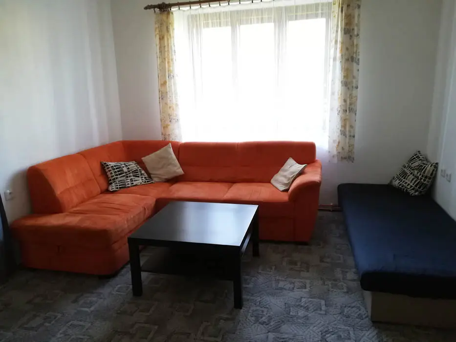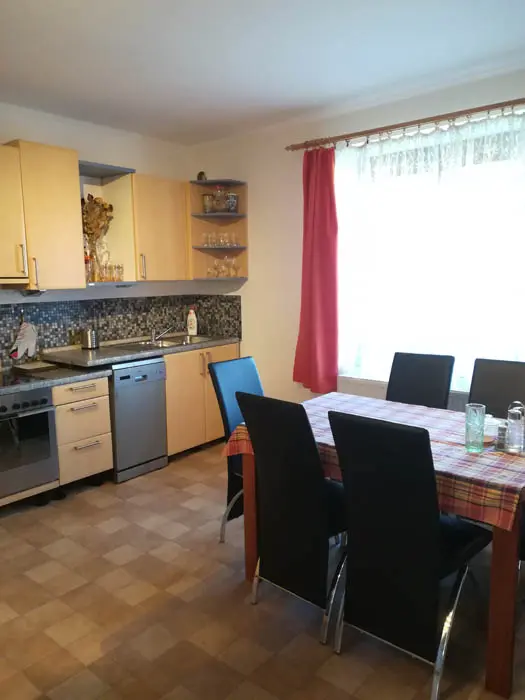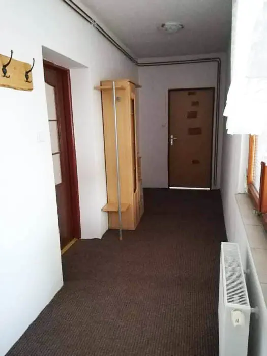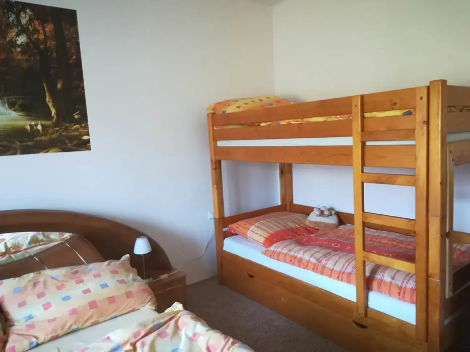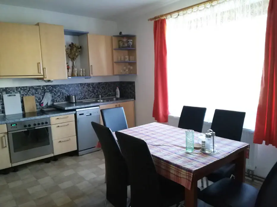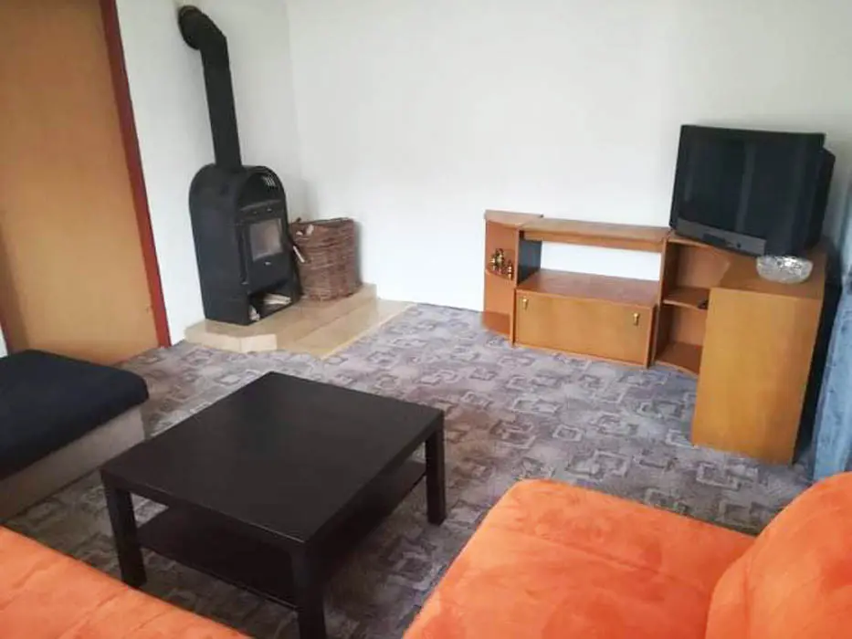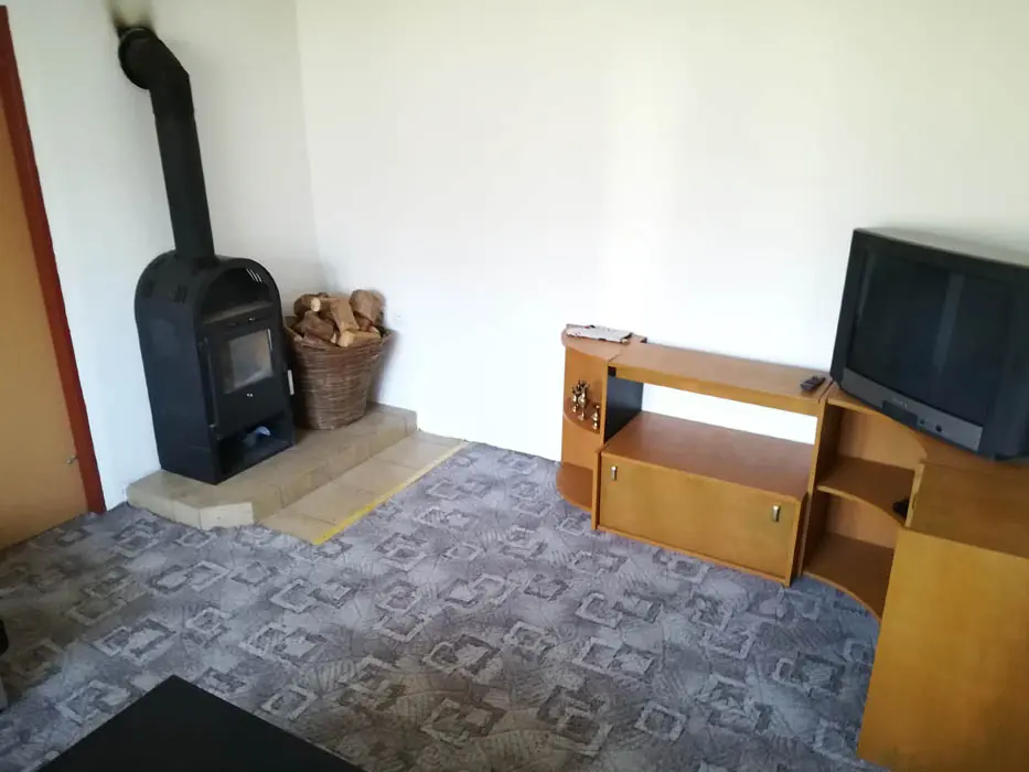 Vstupní chodba - mrazák, samostatná kuchyně - el. trouba, sklokeramická varná deska, mikrovlnka, varná konvice, velká lednice ( 3 šuplíkový mražák ), myčka, nádobí na počet osob, stůl a židle. Obývací pokoj s posezením ( rozkládací gauč - možnost 2 přistýlek ), 1 samostatné lůžko, TV, krbová kamna, 1 ložnice - 1x4 lůžka ( manželská postel + palanda ). Soc. zařízení - koupelna s vanou, umyvadlo, WC, teplá voda z bojleru. Topení - tuhá paliva