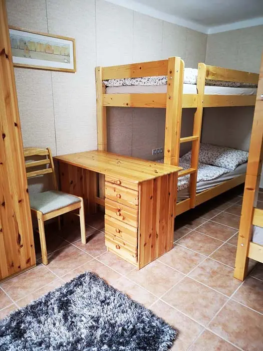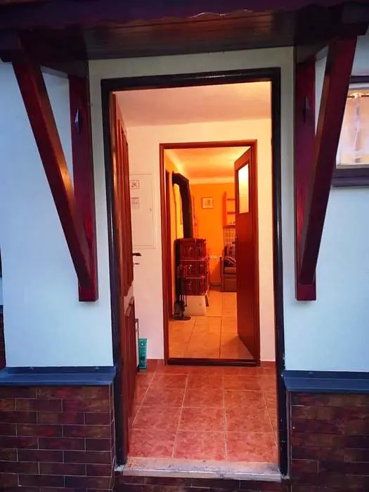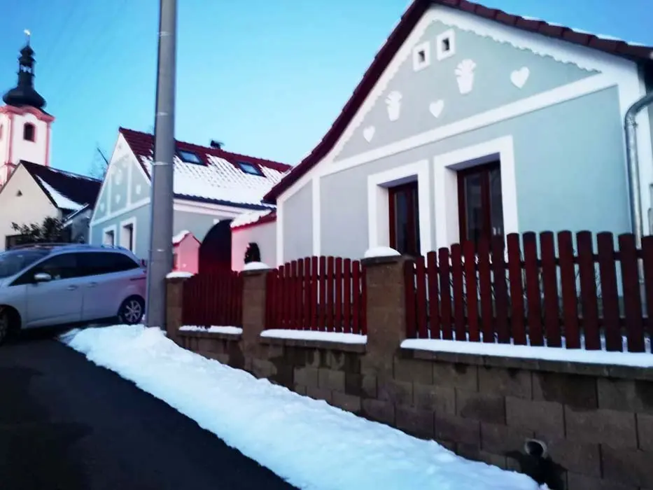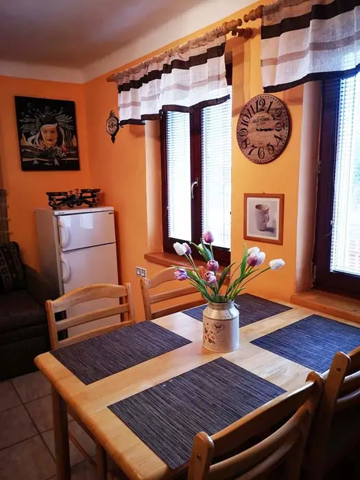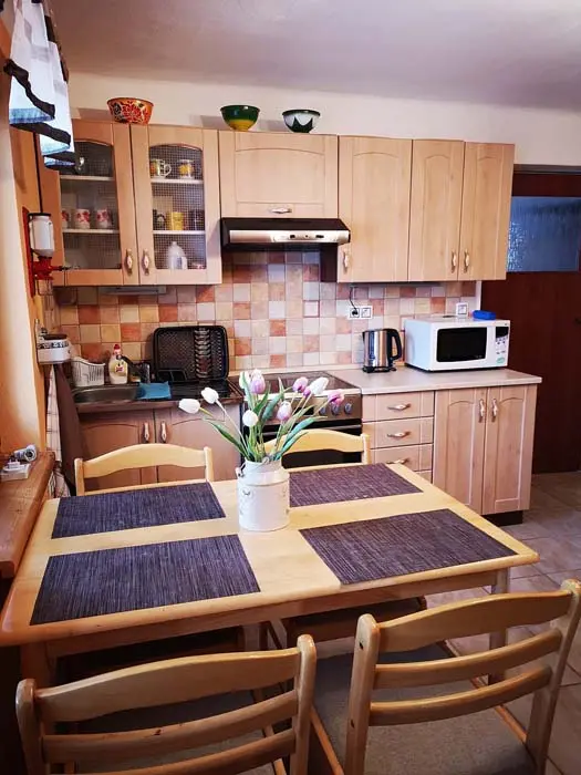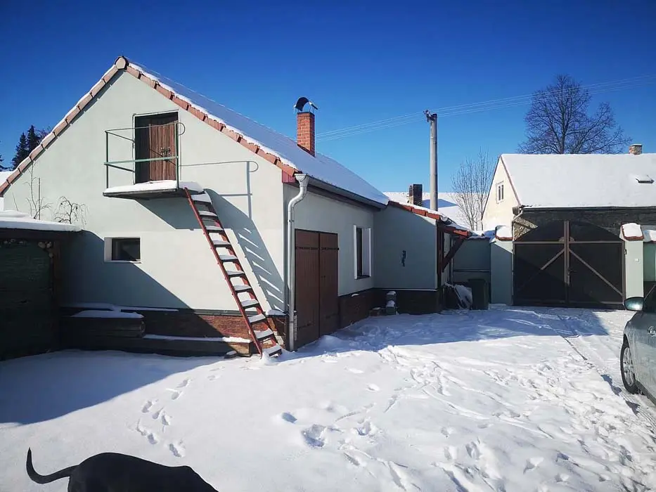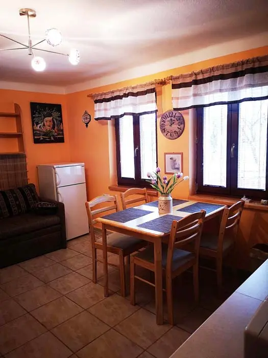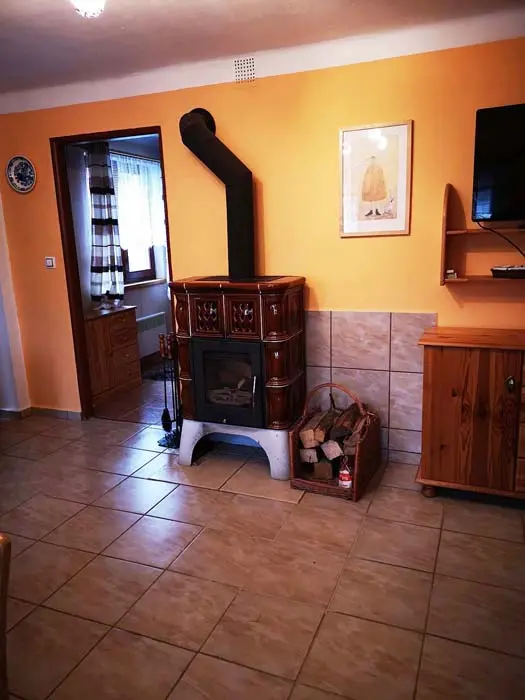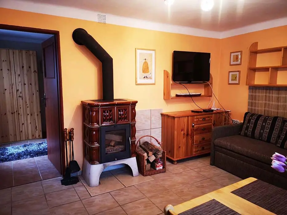 Obytná část spojená s kuchyní - krbová kamna, sedačka, TV, jídelní stůl a židle, vybavená kuchyně - mikrovlnka, el. trouba, sklokeramická varná deska, varná konvice, topinkovač, lednice, nádobí. 1 ložnice - 1x4 lůžka ( 2 palandy). Soc. zařízení - sprcha + WC. Topení - el. přímotop + krbová kamna
