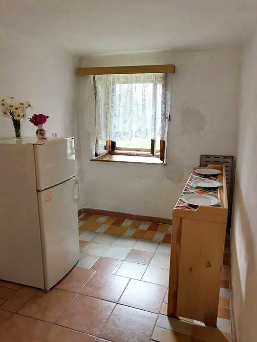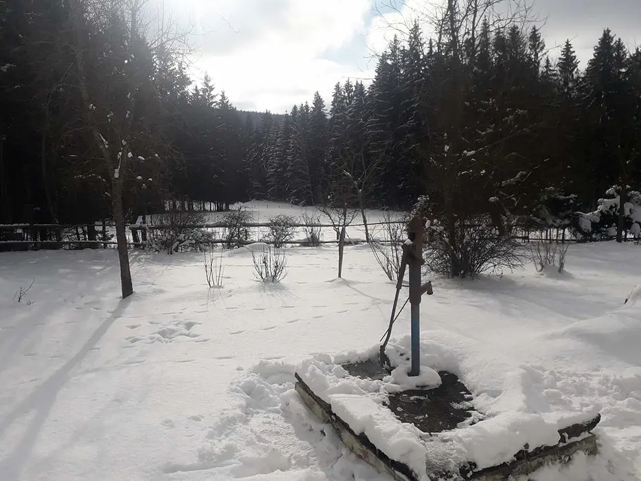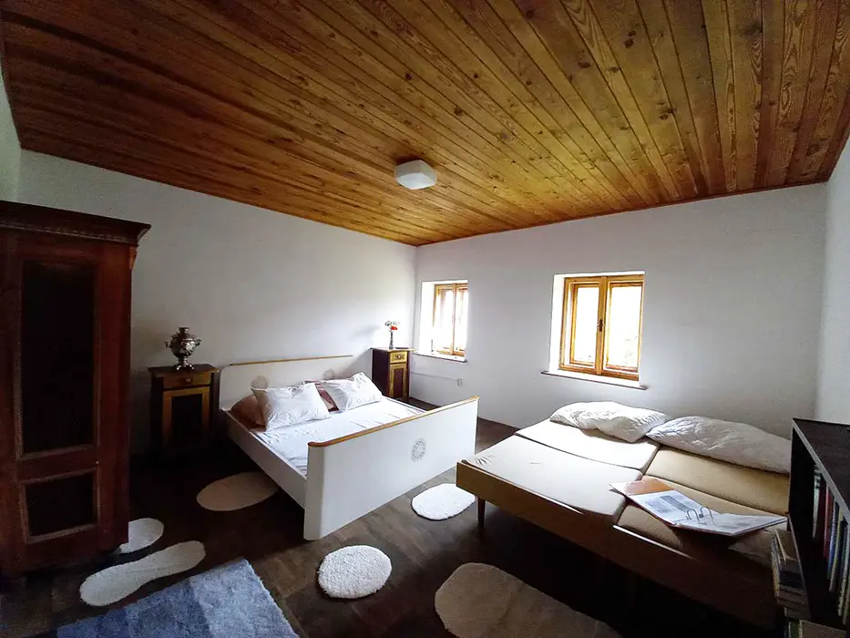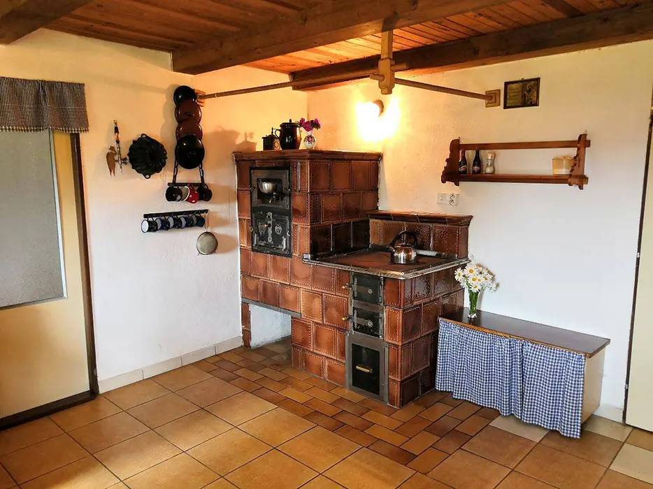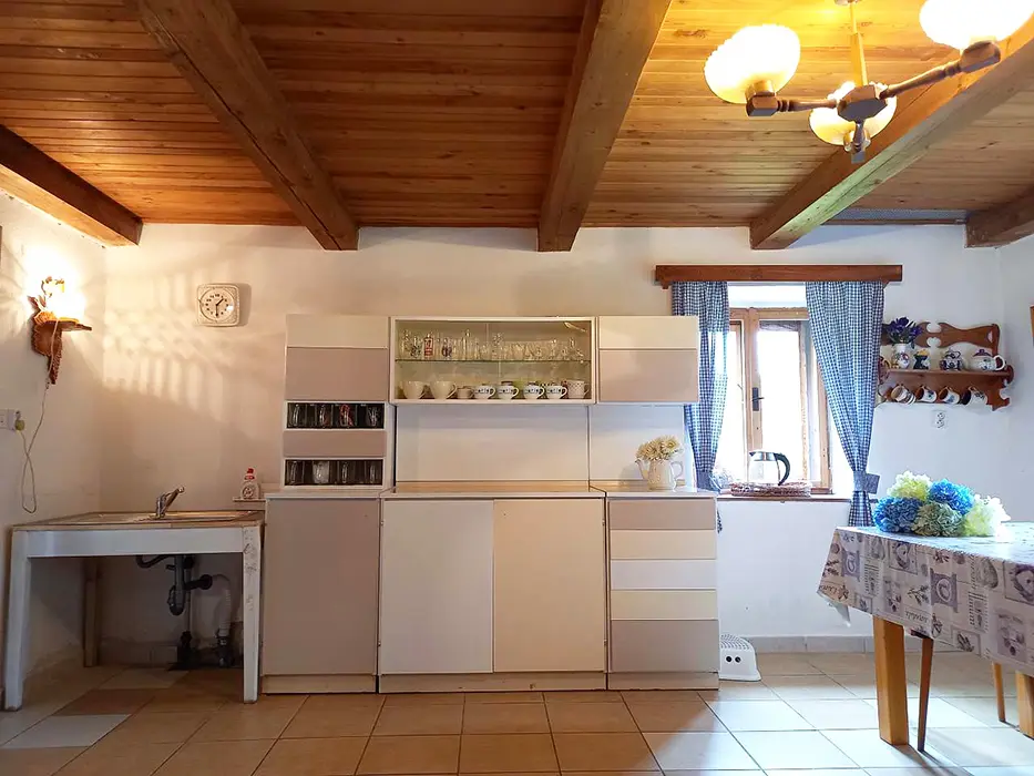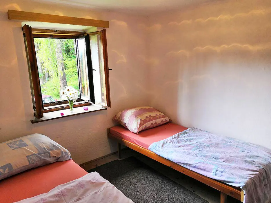 V přízemí - obytná sednice - posezení, stůl a židle, kachlová kamna spojená s kuchyní - el. dvouvařič, varná konvice, mikrovlnka, lednice, nádobí. V patře 3 ložnice - 1x2, 1x4, 1x5 lůžka. Soc. zařízení - koupelna s vanou a sprchou, WC. Topení - kachlová kamna, el. přímotopy. Není TV, SAT, internet