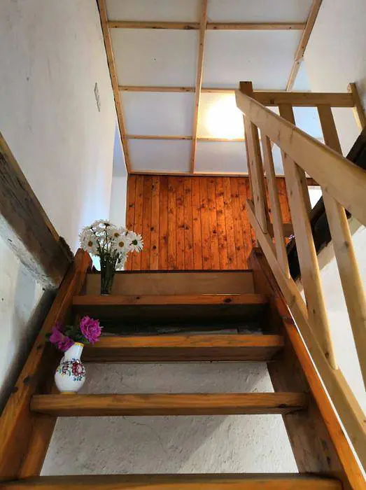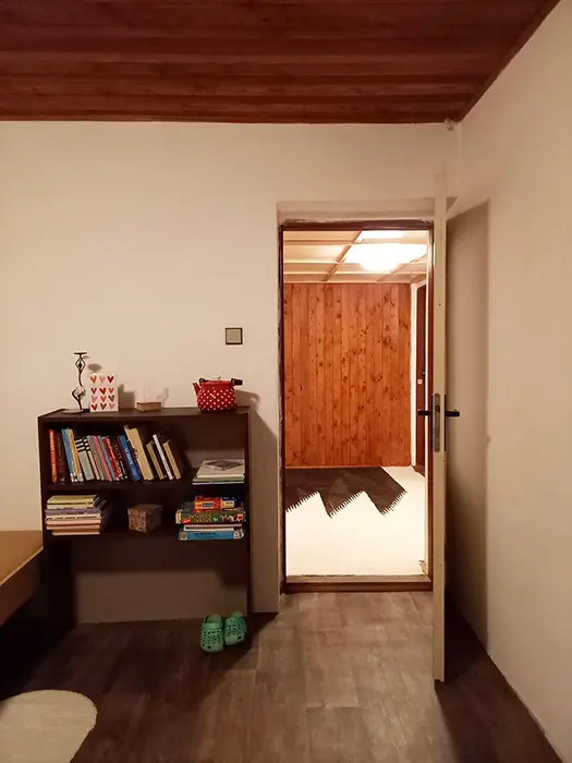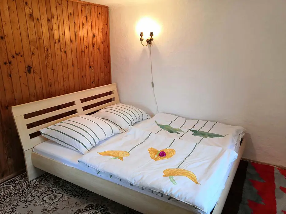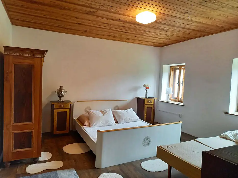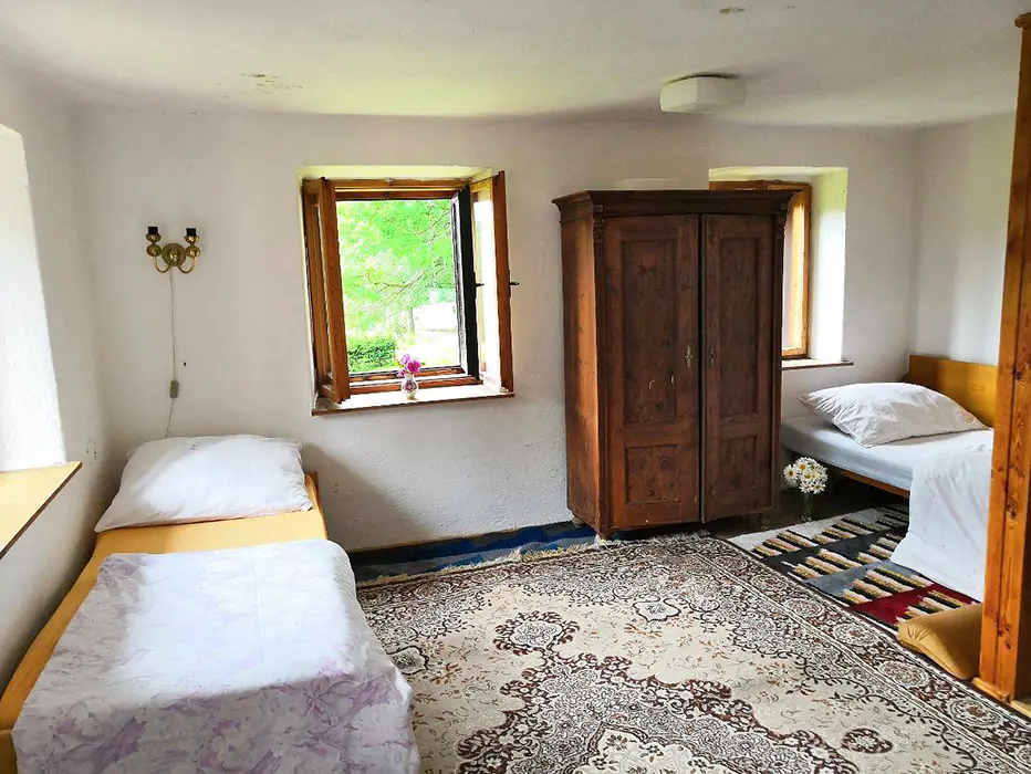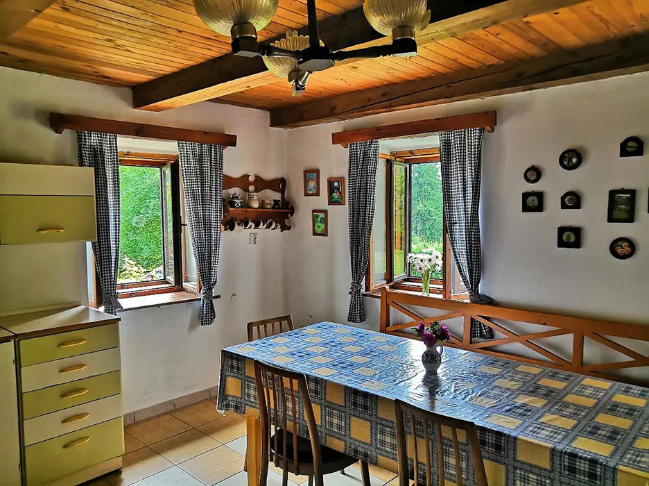 V přízemí - obytná sednice - posezení, stůl a židle, kachlová kamna spojená s kuchyní - el. dvouvařič, varná konvice, mikrovlnka, lednice, nádobí. V patře 3 ložnice - 1x2, 1x4, 1x5 lůžka. Soc. zařízení - koupelna s vanou a sprchou, WC. Topení - kachlová kamna, el. přímotopy. Není TV, SAT, internet