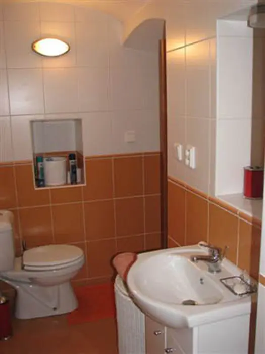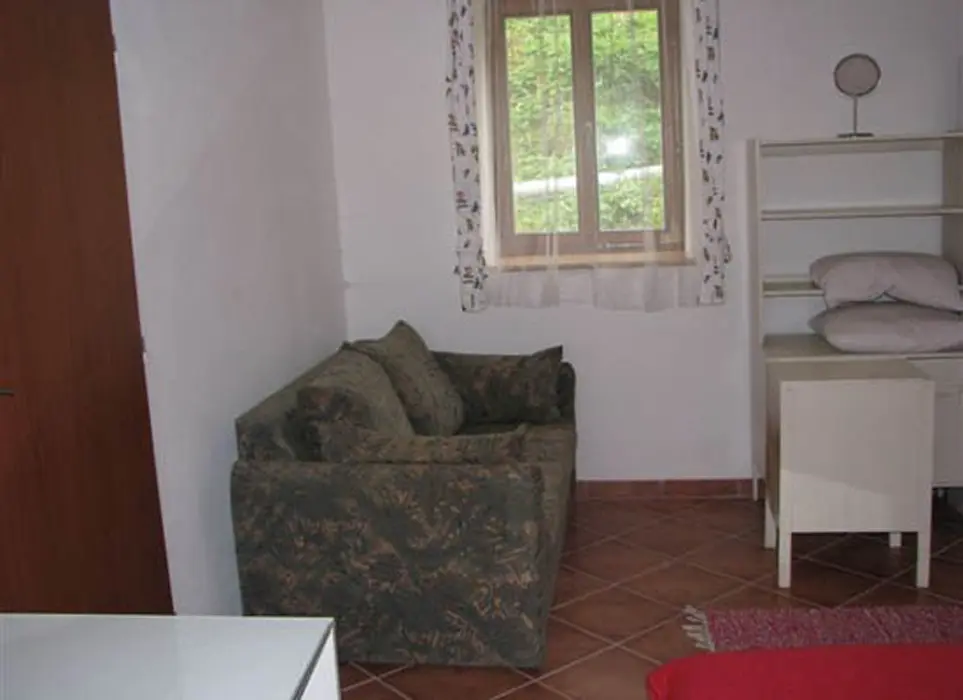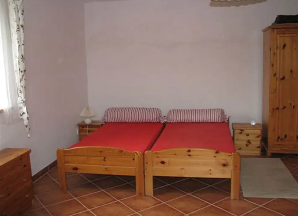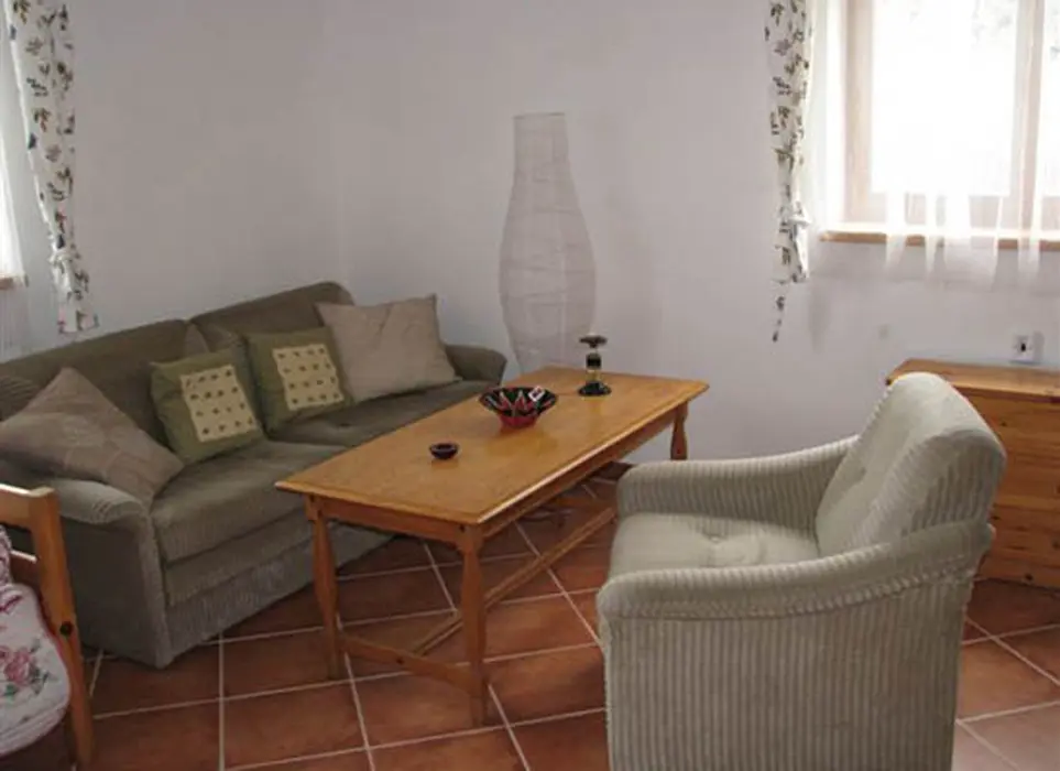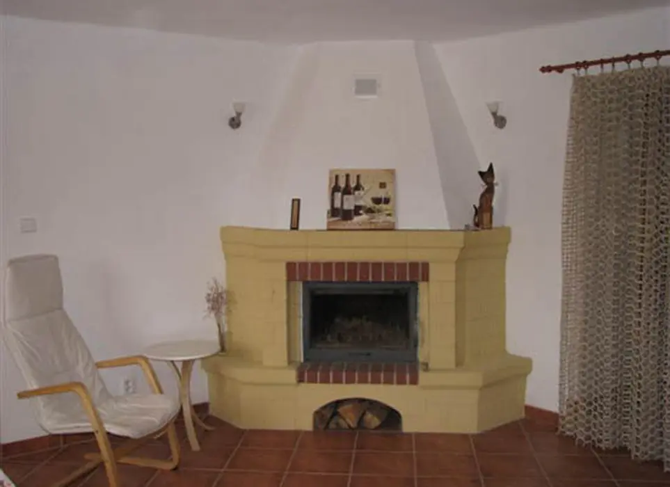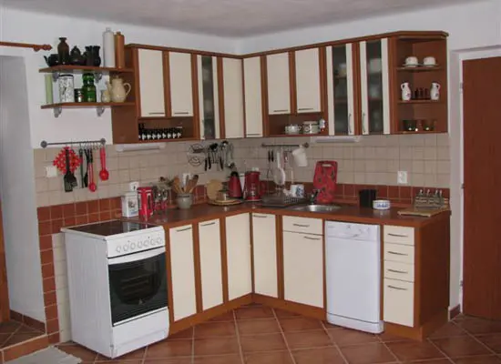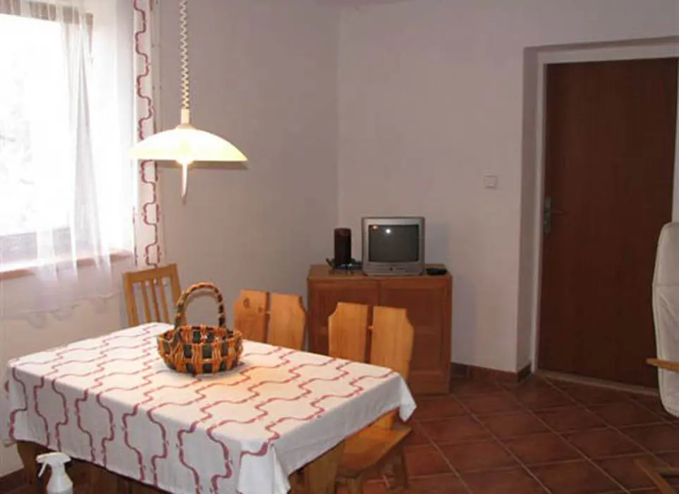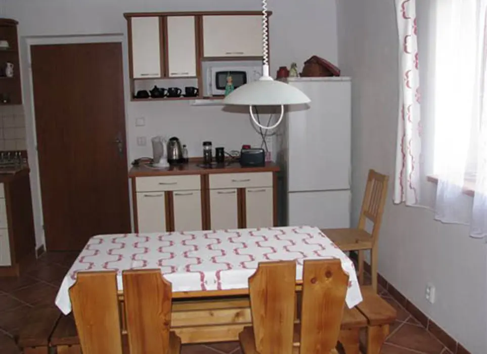 Velká komfortní kuchyně s krbem, el. sporák s troubou, myčka nádobí, lednice, mrazák, varná konvice, mikrovlnka, nádobí, jídelní stůl a židle, BTV. 2 ložnice 1x2 a 1x3 lůžka + možnost 2 přistýlek. Koupelna - sprchový kout, umyvadlo, pračka, teplá voda, 2x WC ( jedno v koupelně, jedno samostatné ). Topení - na tuhá paliva - rozvod z centrálního krbu do všech místností