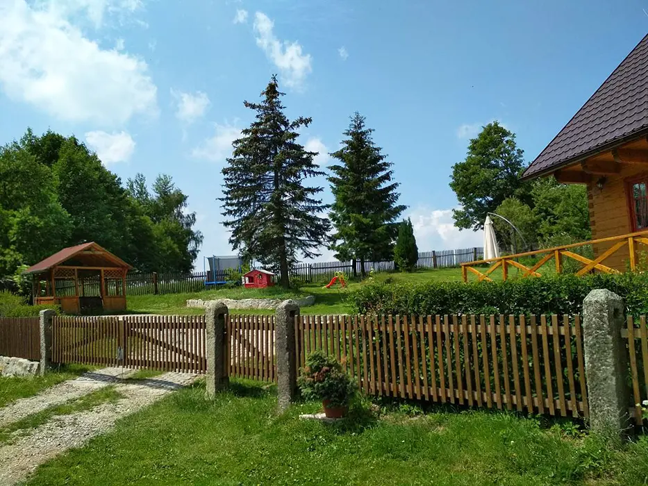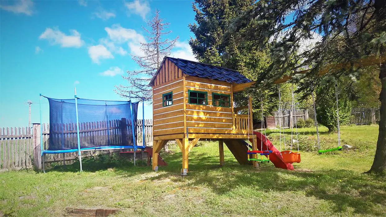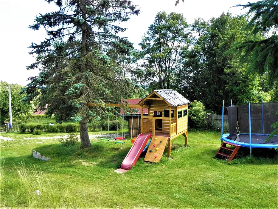 Částečně oplocený pozemek, zahradní nábytek, slunečník, trampolína, dětský koutek, pískoviště, gril