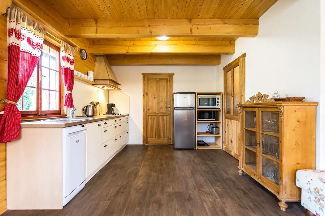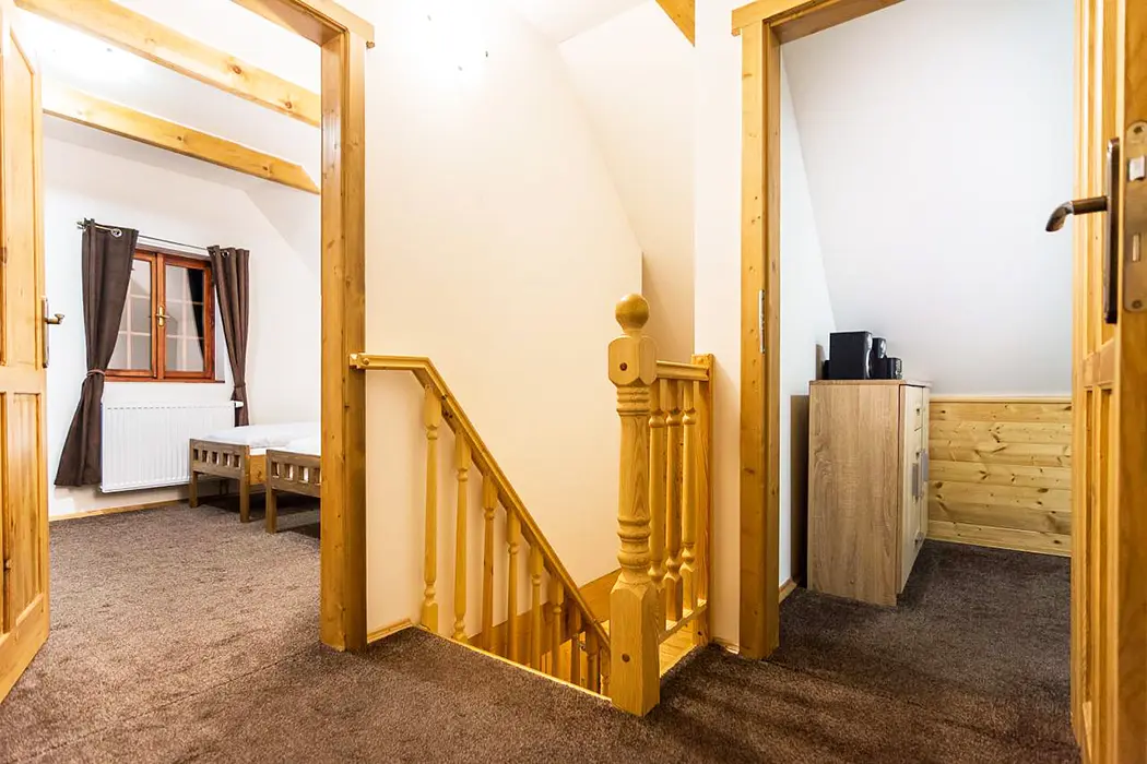 židlemi, jídelní židlička pro děti. 3 samostatné ložnice 3x2 lůžka - nachází se v prvním patře, 1 pokoj - 2 postele, šatní skříň, 2 pokoj - 2 postele, komoda, CD+rádio, 3 pokoj - 2 postele, dětský koutek (knížky, hračky, kuchyňka, autíčka,