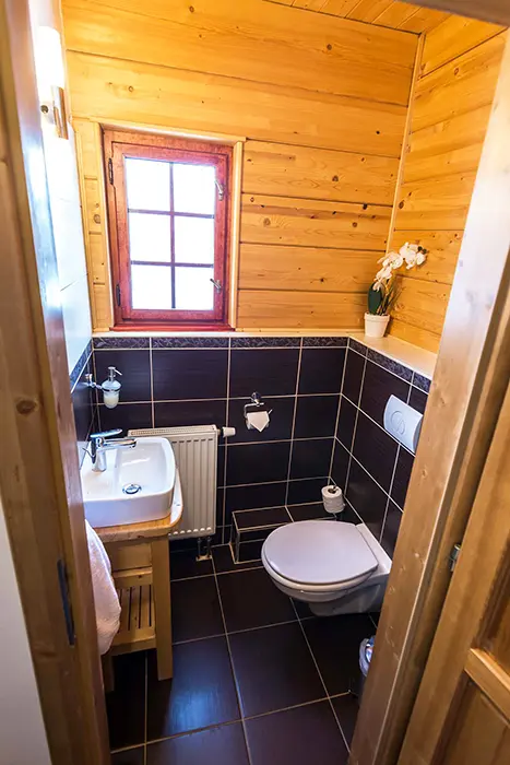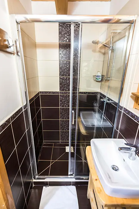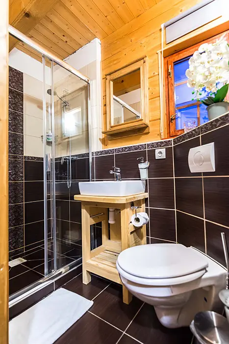 1x koupelna se sprchovým koutem, umyvadlo, WC. 1x samostatné WC + umyvadlo. Topení - centrální - elektrický kotel.