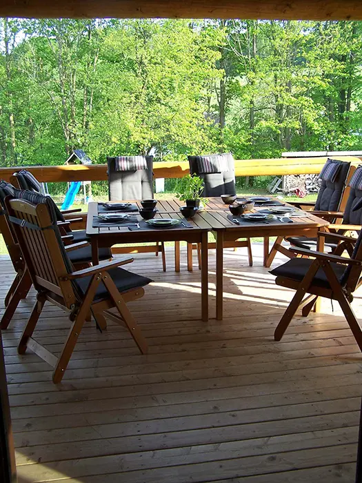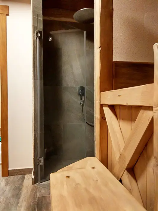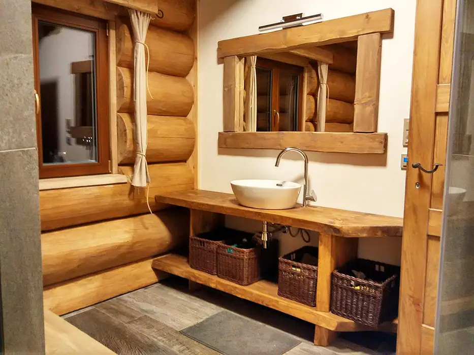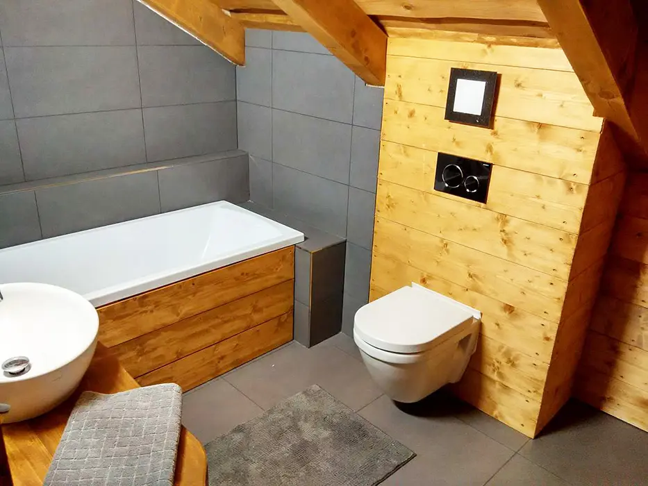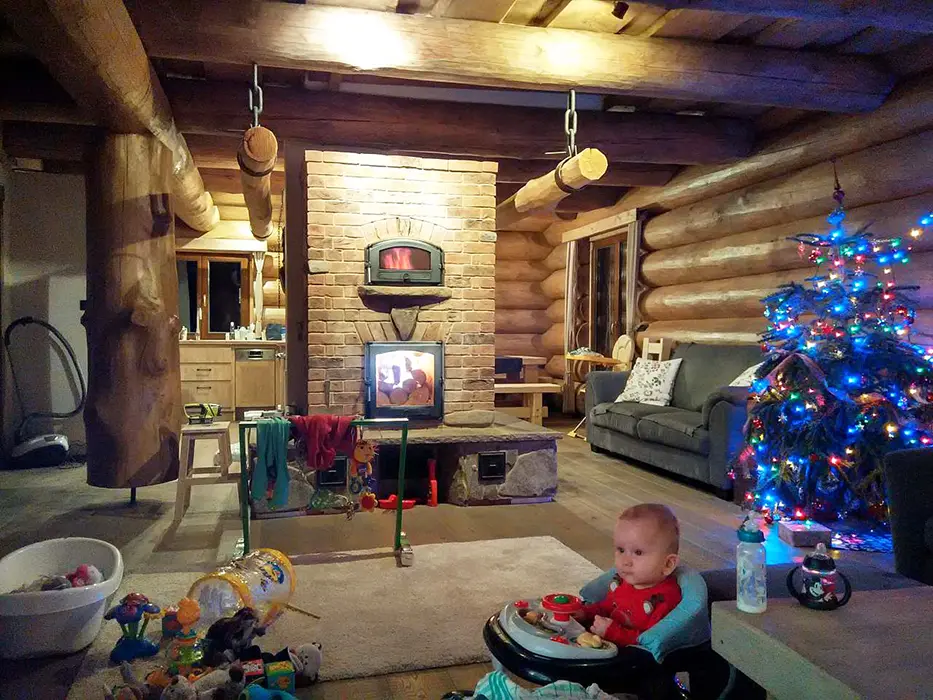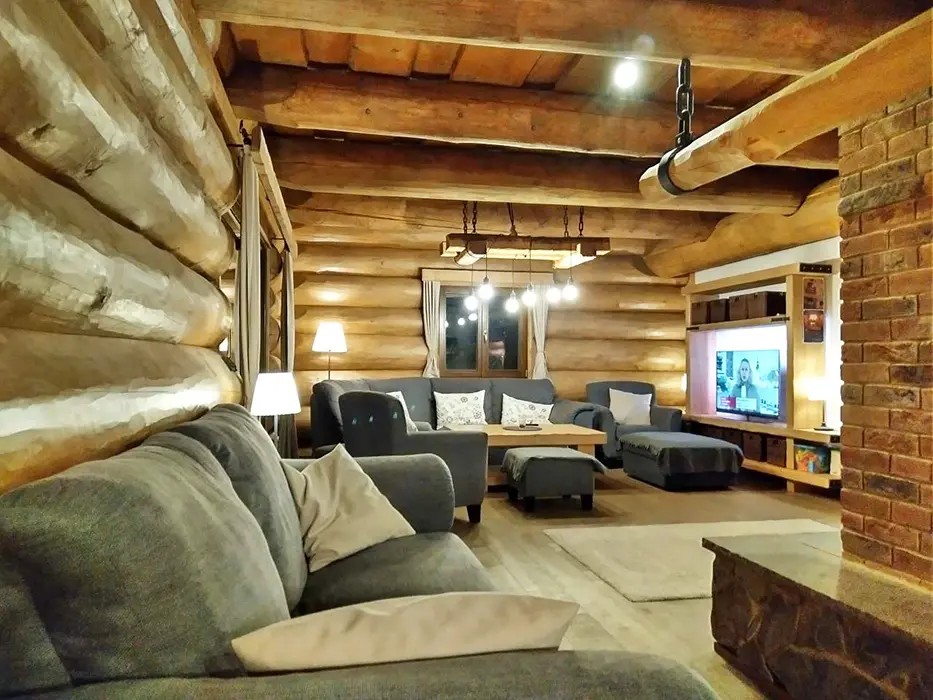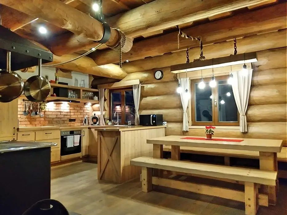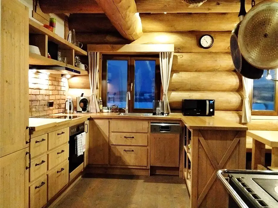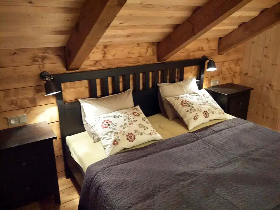 Obývací pokoj spojený s kuchyní. Kuchyně - lednice ( další lednice je v technické místnosti ), mikrovlnná trouba, myčka, trouba, rychlovarná konvice, nádobí, dolce gusto. 4 ložnice - v přízemí 1x2, v podkroví 2x2, 1x4 lůžka. Sociální zařízení - přízemí koupelna se sprchovým koutem, samostatné WC, v patře 2x koupelna, 2x WC, k dispozici pračka. Topení - finská protiproudá pec