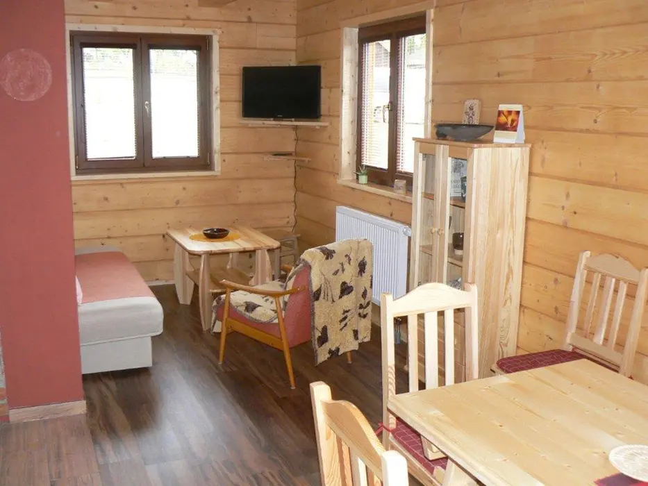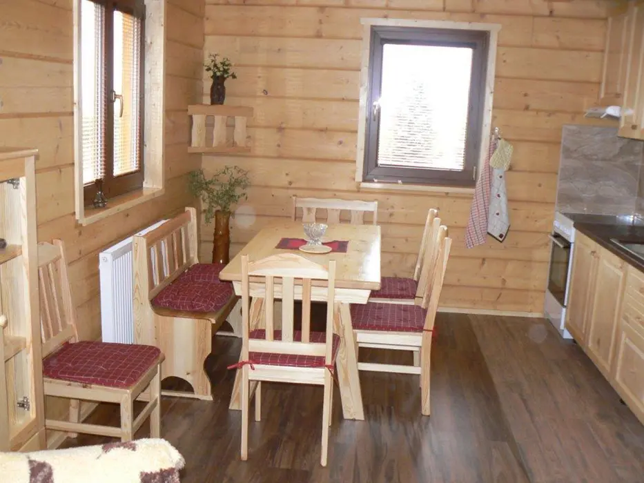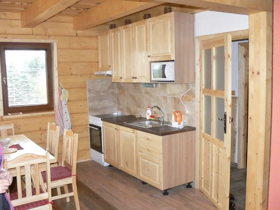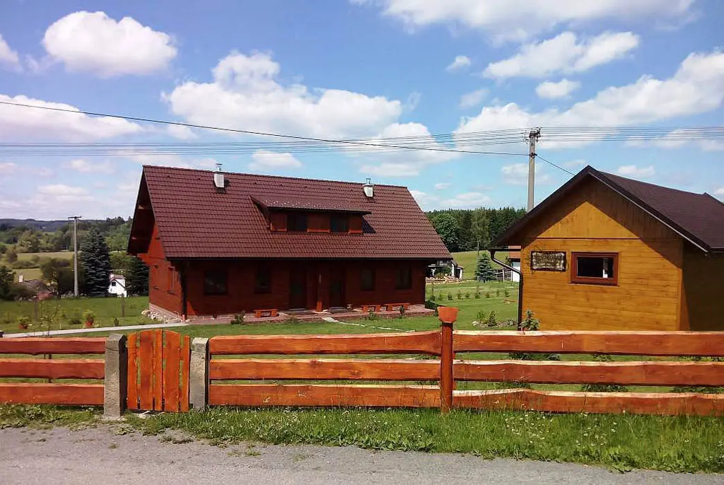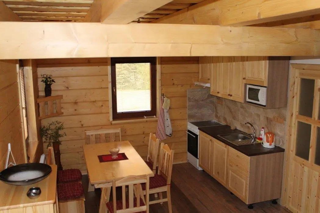 Roubenka je rozdělená na 2 shodné poloviny. V každé polovině - obývací pokoj spojený s kuchyní - el.sporák se sklokeramickou deskou, lednice s mrazákem, mikrovlnka, varná konvice, nádobí. V patře 3 ložnice - 3x2 lůžka. Sociální zařízení - v přízemí vybavená koupelna se sprchovým koutem a samostatné WC, další WC v patře. Topení - centrálně el. proudem