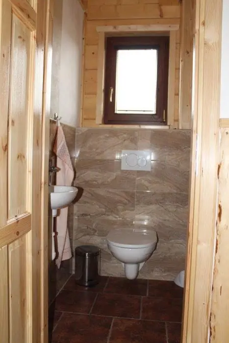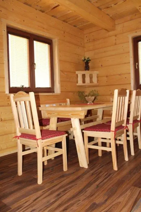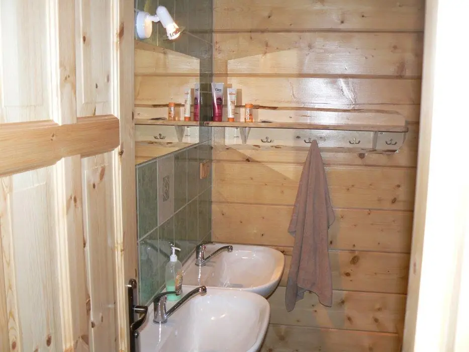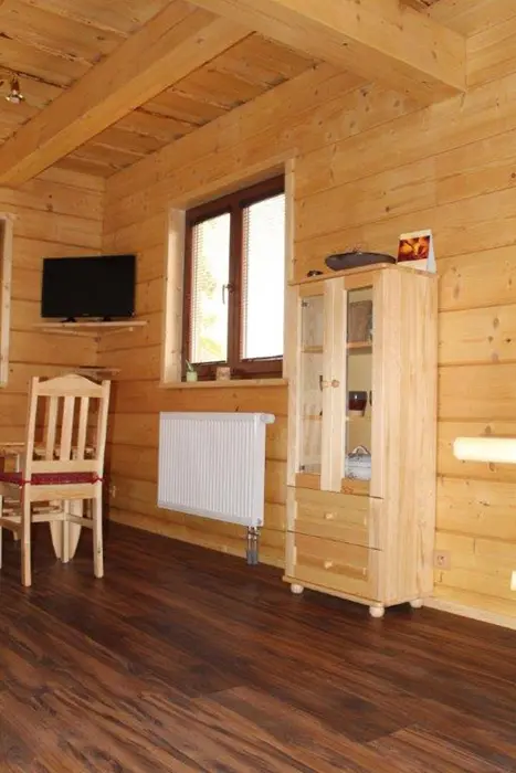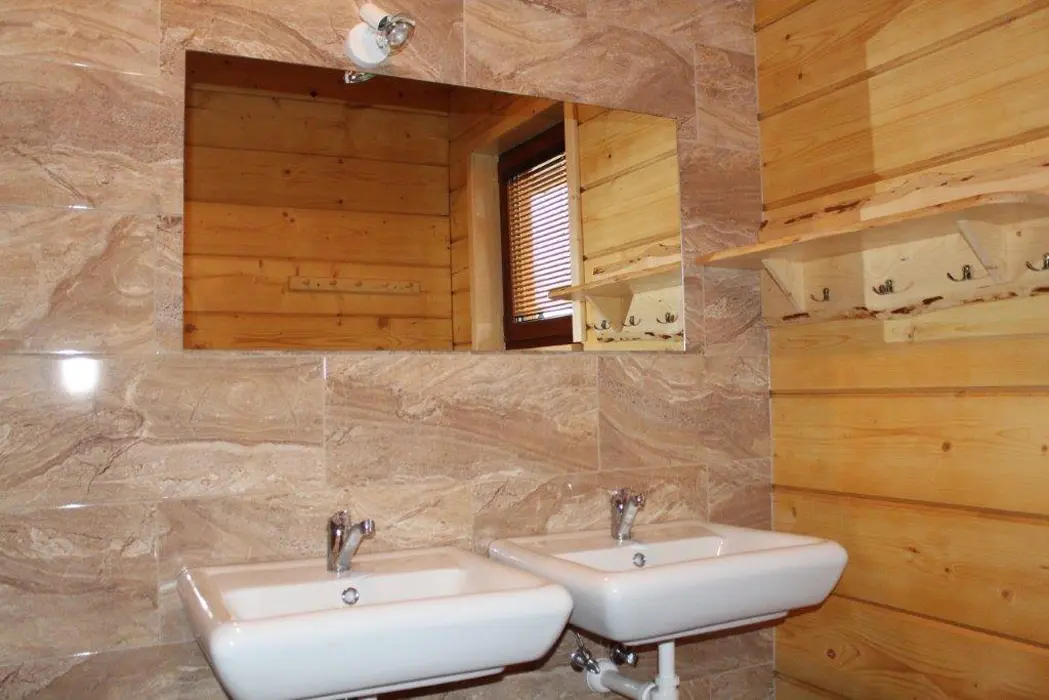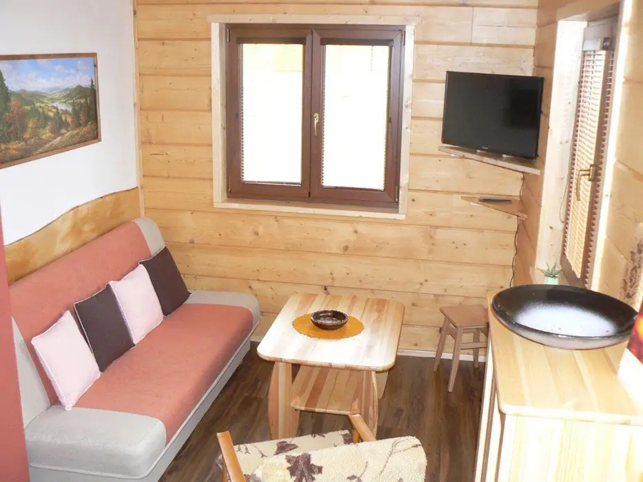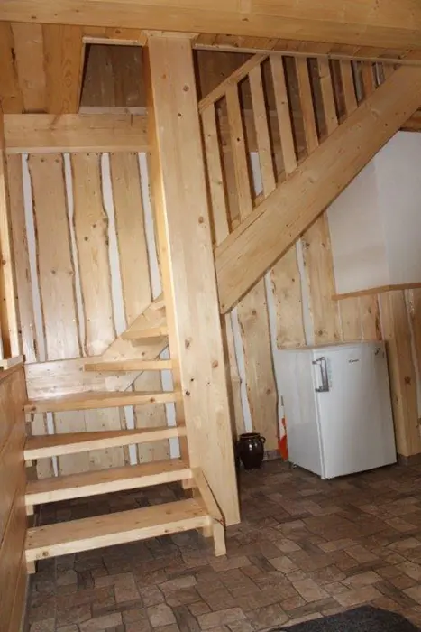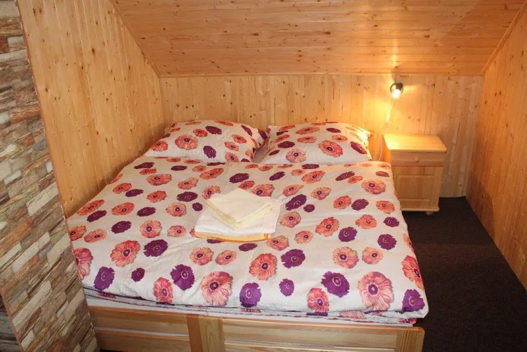 Roubenka je rozdělená na 2 shodné poloviny. V každé polovině - obývací pokoj spojený s kuchyní - el.sporák se sklokeramickou deskou, lednice s mrazákem, mikrovlnka, varná konvice, nádobí. V patře 3 ložnice - 3x2 lůžka. Sociální zařízení - v přízemí vybavená koupelna se sprchovým koutem a samostatné WC, další WC v patře. Topení - centrálně el. proudem