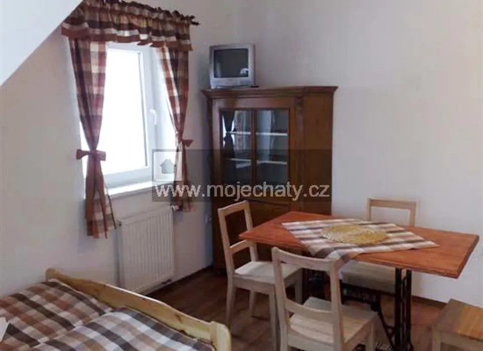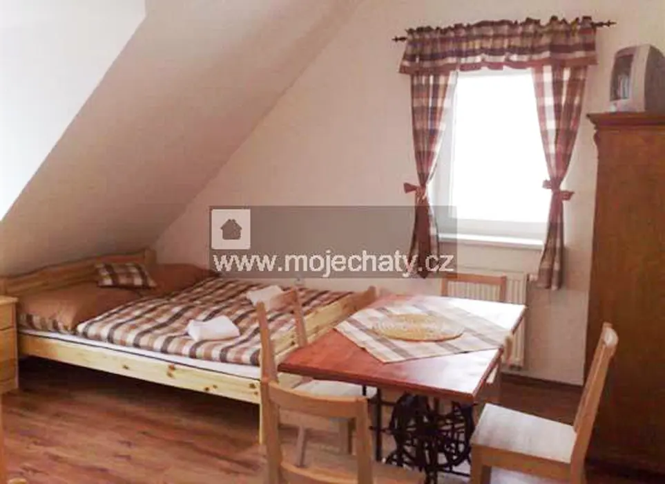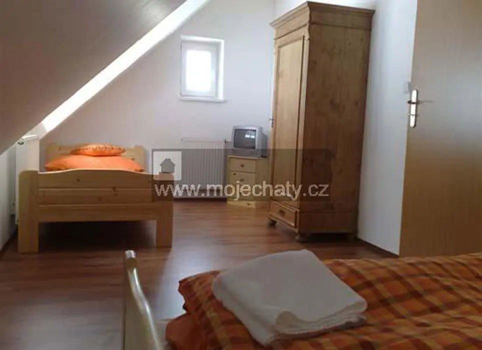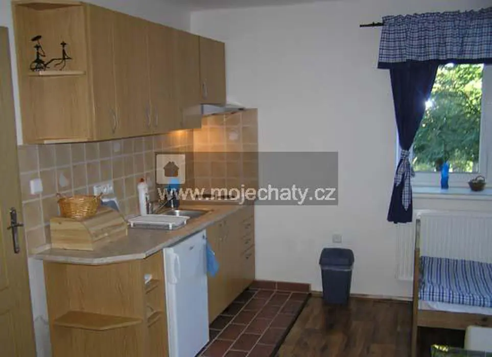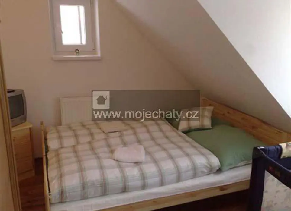 VIZ FOTO 40 + 41 + 43 + 44 - v podkroví - 6 lůžek - 2 ložnice 2x3, kuchyňský kout - el. dvoukolový vařič, varná konvice, lednice, základní nádobí. Sprcha + WC.