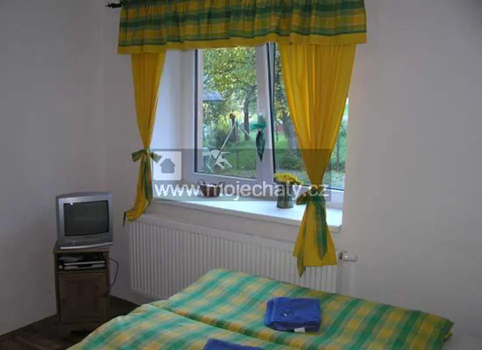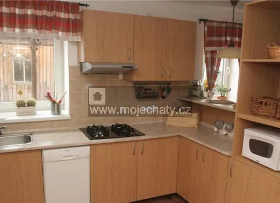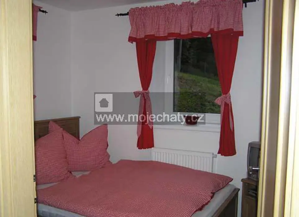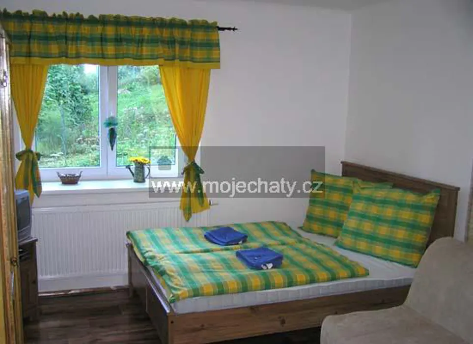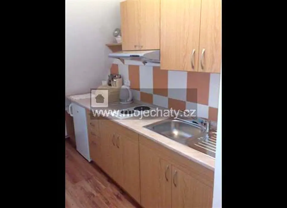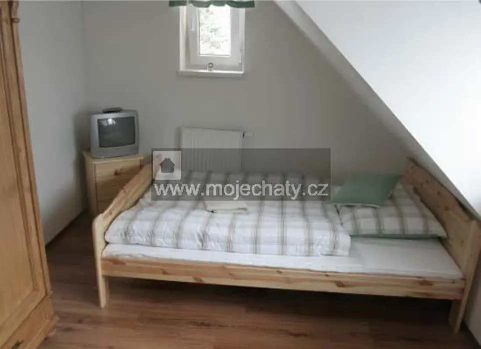 VIZ FOTO 40 + 41 + 43 + 44 - v podkroví - 6 lůžek - 2 ložnice 2x3, kuchyňský kout - el. dvoukolový vařič, varná konvice, lednice, základní nádobí. Sprcha + WC.