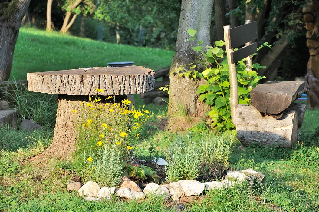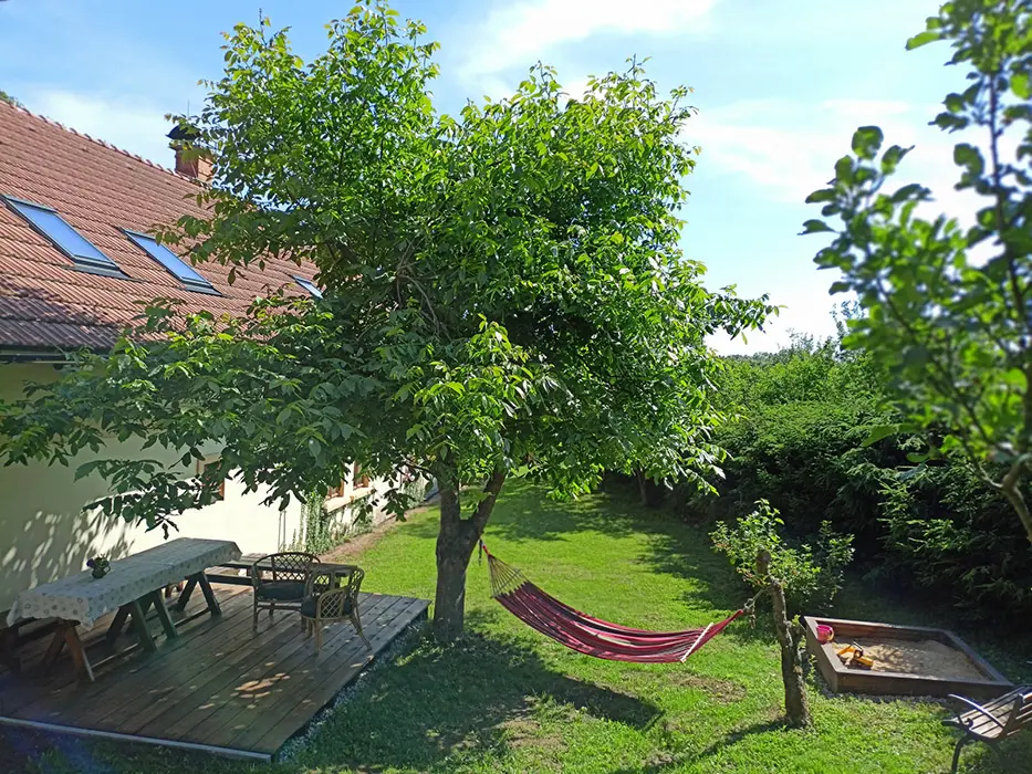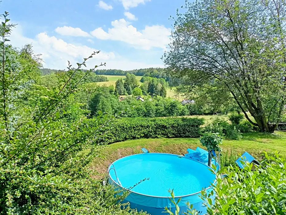 Venkovní posezení, bazén 9m3, houpačka, ohniště, hry - petangue, kroket, obří mikádo, badminton