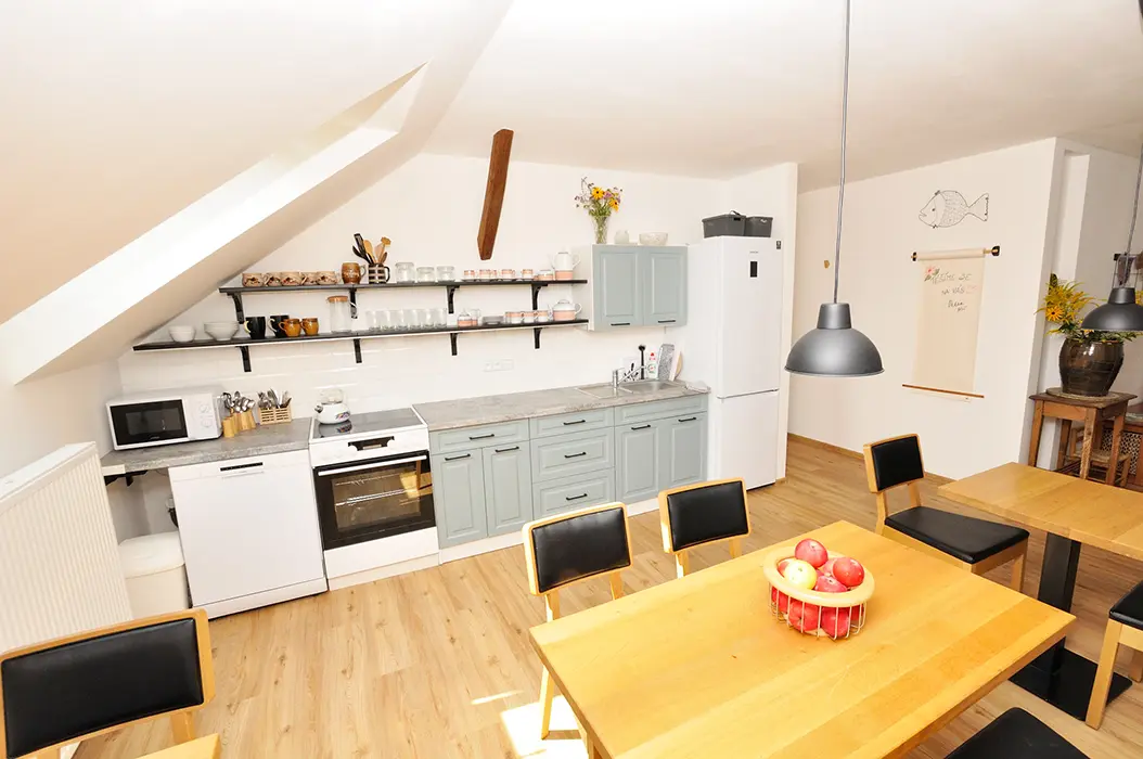 Velká kuchyně s posezením - lednice s mrazákem, sklokeram. varná deska, trouba, myčka, mikrovlnka, varná konvice, nádobí, 3 stoly a židle, krbová kamna. 3 ložnice - 1x2+1, 1x2+2, 1x2 lůžka. Soc. zařízení - 2 x sprcha, 3 x WC. Topení - centrální, v koupelnách el. přímotopy, krbová kamna
