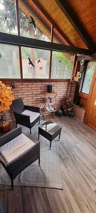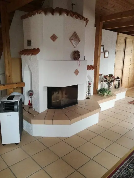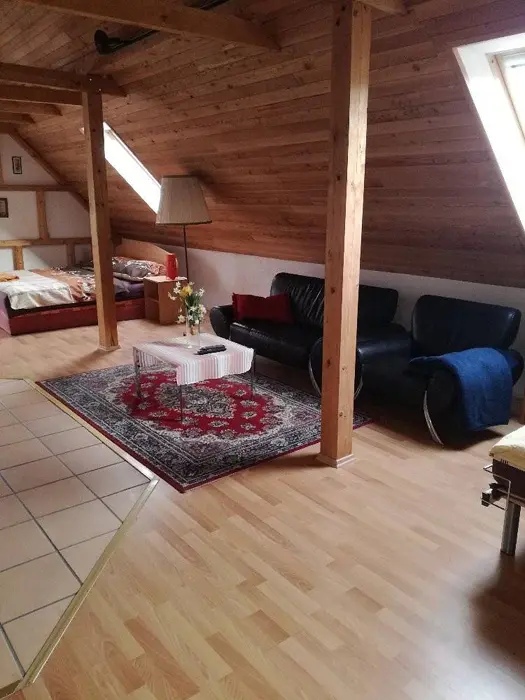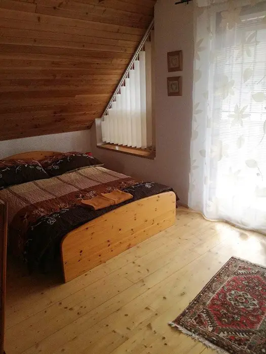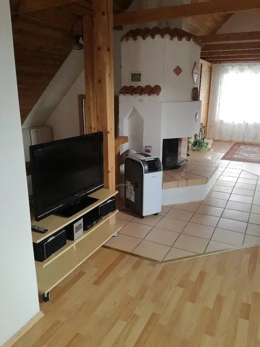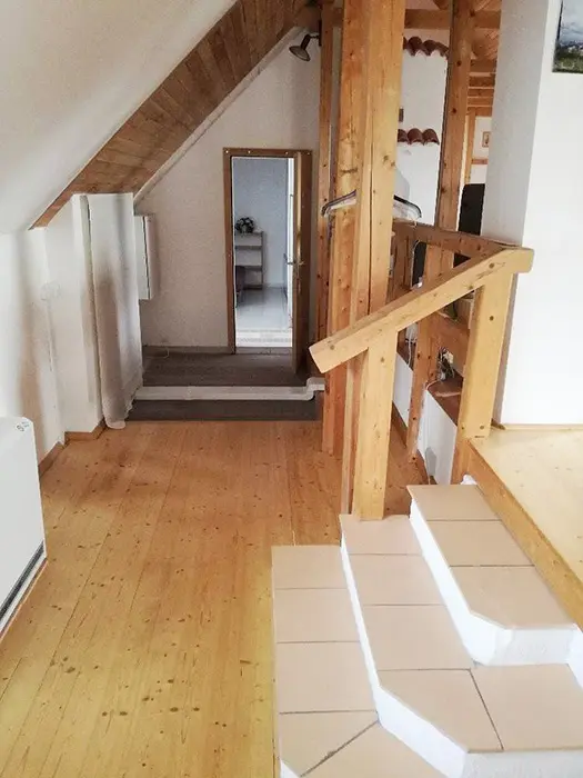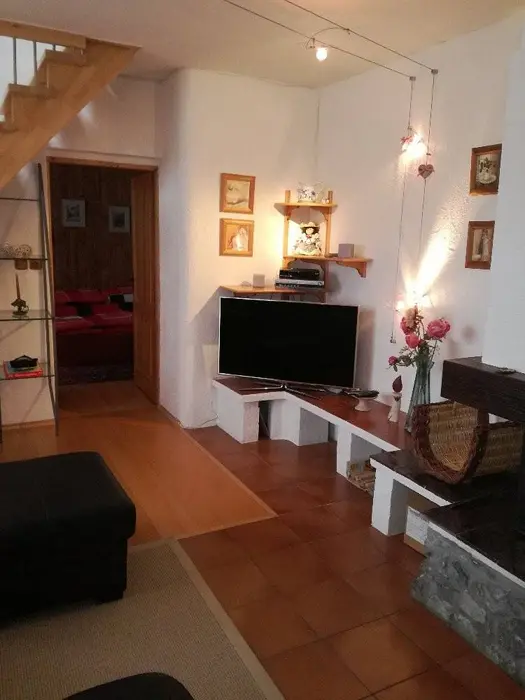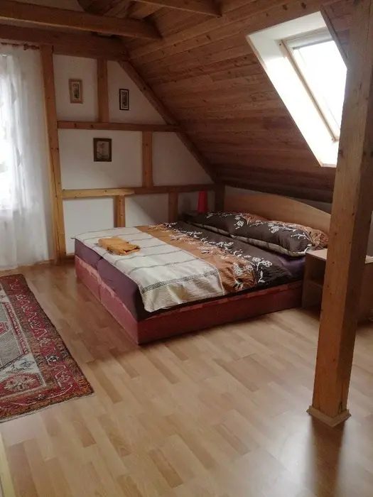 Horní patro - sedací souprava + ve velkém otevřeném prostoru 4 lůžka a balkon, krb. Vybavená kuchyně. 1 ložnice - 1x2 lůžka. Sociální zařízení - koupelna se sprchovým koutem, WC. Topení - ústřední topení