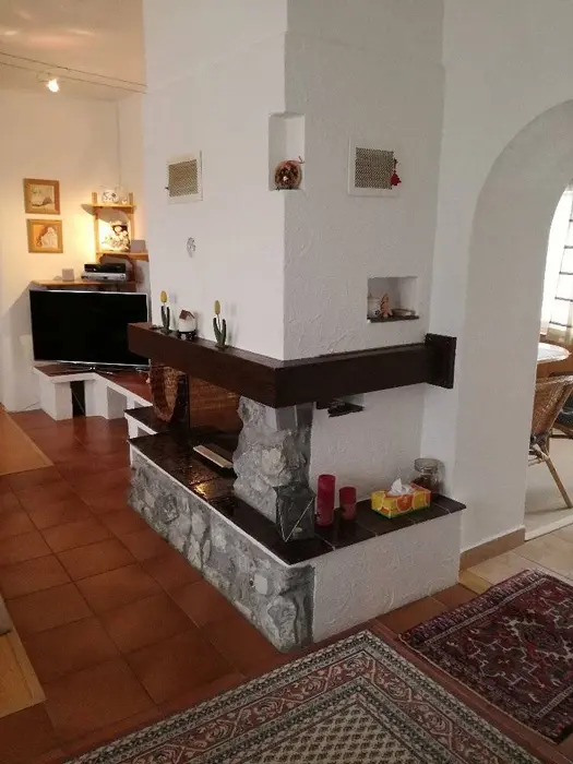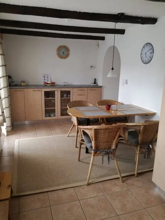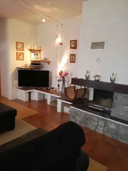 V přízemí - obývací pokoj - rozkládací sedací souprava - možnost 2 přistýlek, krb, TV, kuchyně - sklokeramická varná deska, trouba, lednice, varná konvice, nádobí. 1 ložnice 1x3 lůžka. Sociální zařízení - v přízemí - koupelna s vanou a WC. Topení - ústřední topení