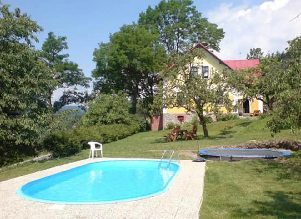 Prostorná zahrada, ohniště s posezením, gril, dětské hřiště - pískoviště, kolotoč pro děti, trampolína, velký zapuštěný bazén 7 x 3,5 x 1,2 m