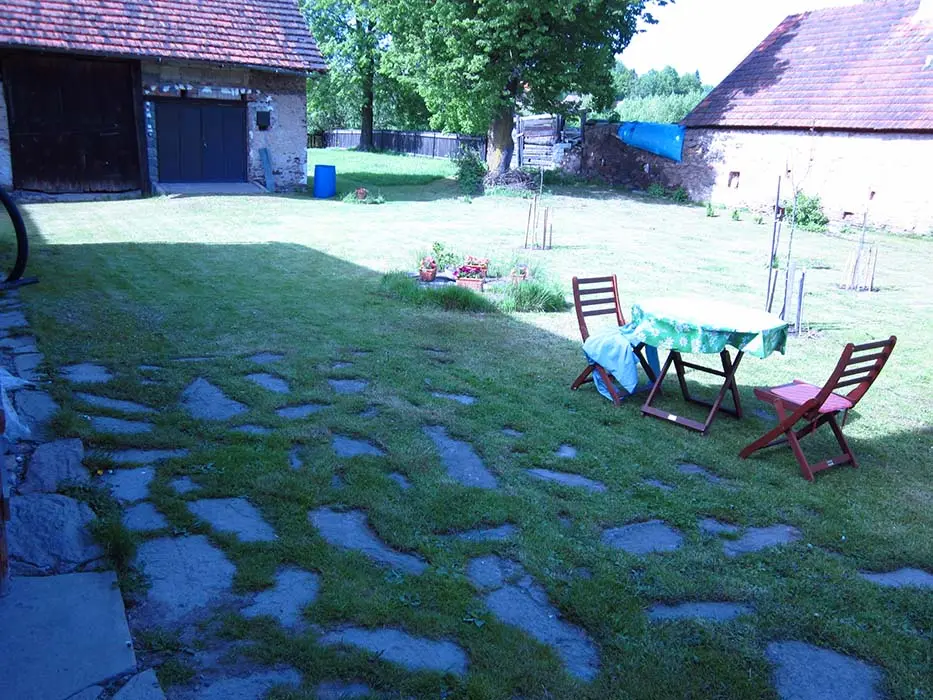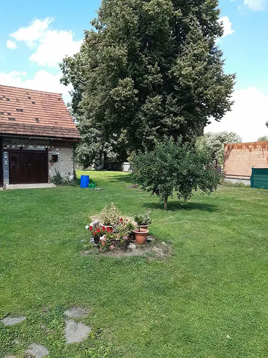 Zahradní posezení pro 4 osoby, gril, ohniště na pozemku, dětská houpačka a skluzavka + malá trampolínka, pískoviště