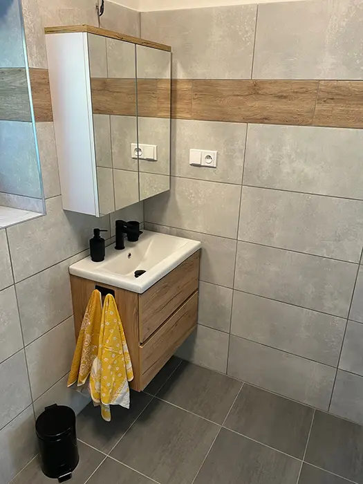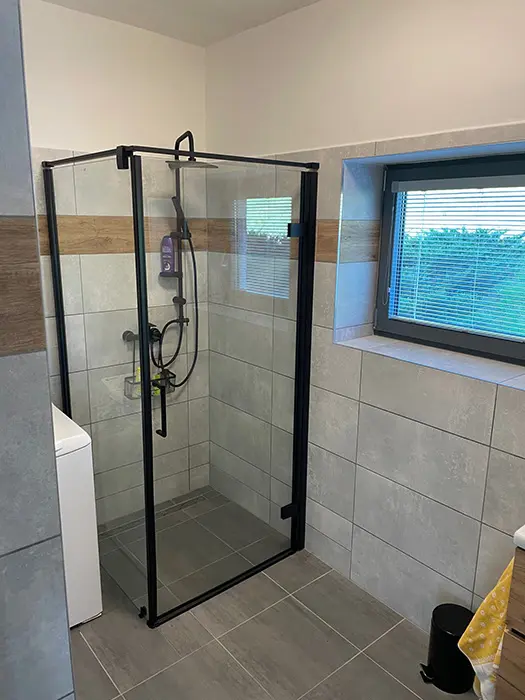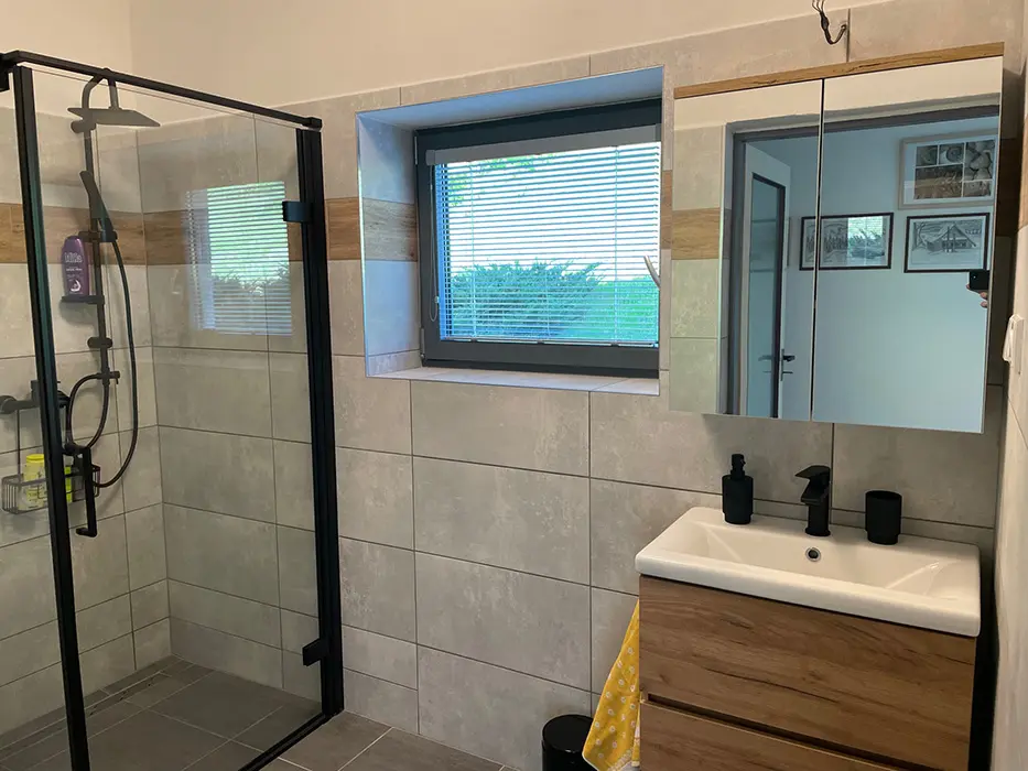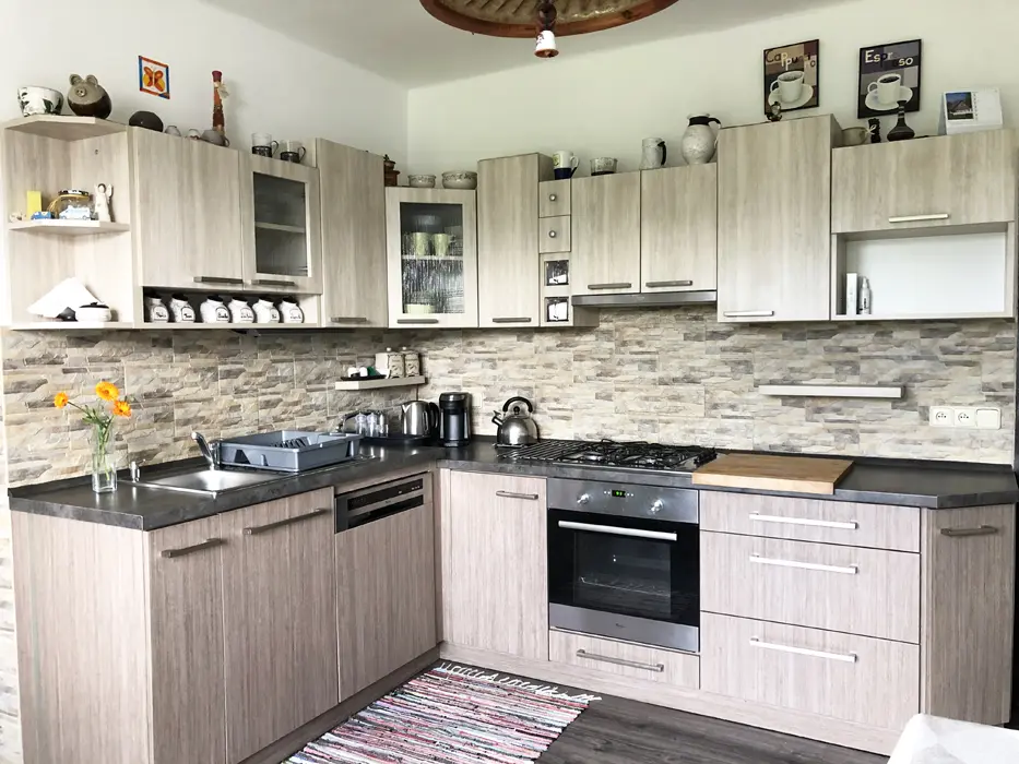 Obývací pokoj - samostatný, možnost 2 přistýlek. Kuchyně - samostatná, el. trouba, sklokeramická varná deska, lednice, mrazák, varná konvice, mikrovlnná trouba, myčka nádobí, jídelní stůl, židle. 4 ložnice - v přízemí 1x3, v patře 1x2 ( tato je průchozí ) do 1x3 , samostatná 1x4 lůžka. Sociální zařízení - sprchový kout, pračka v koupelně, samostatné WC. Topení - tepelné čerpadlo