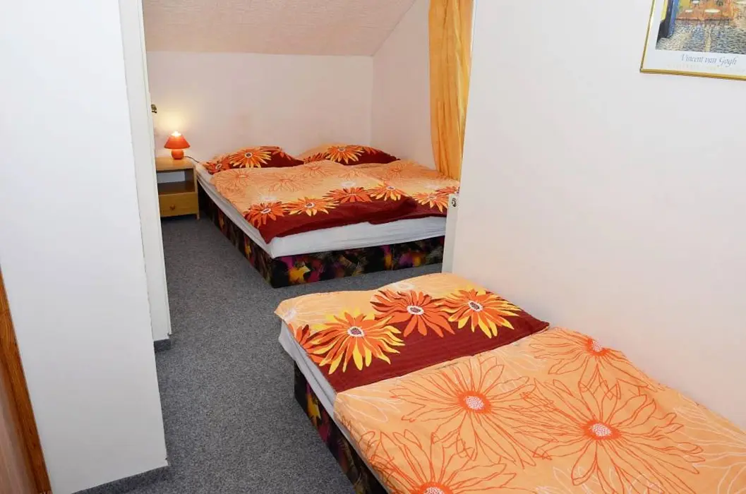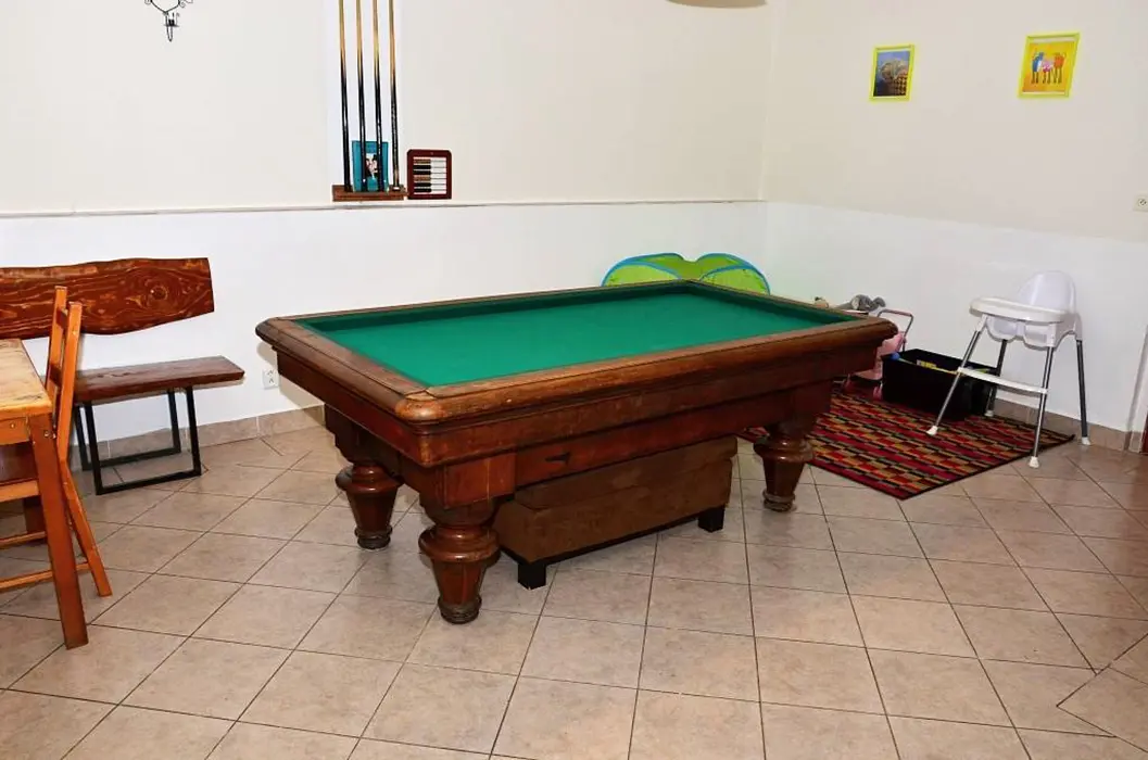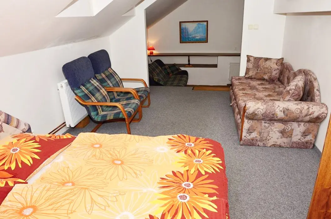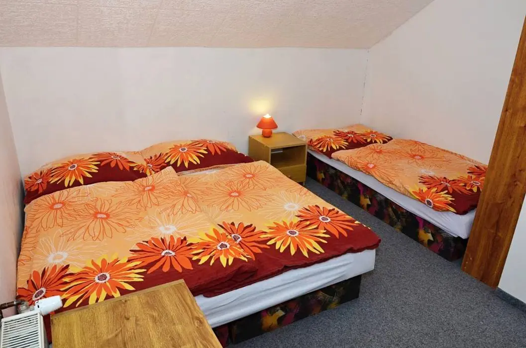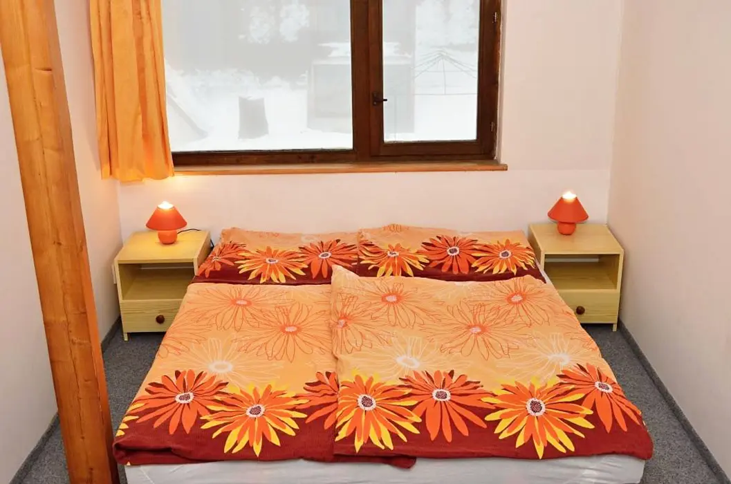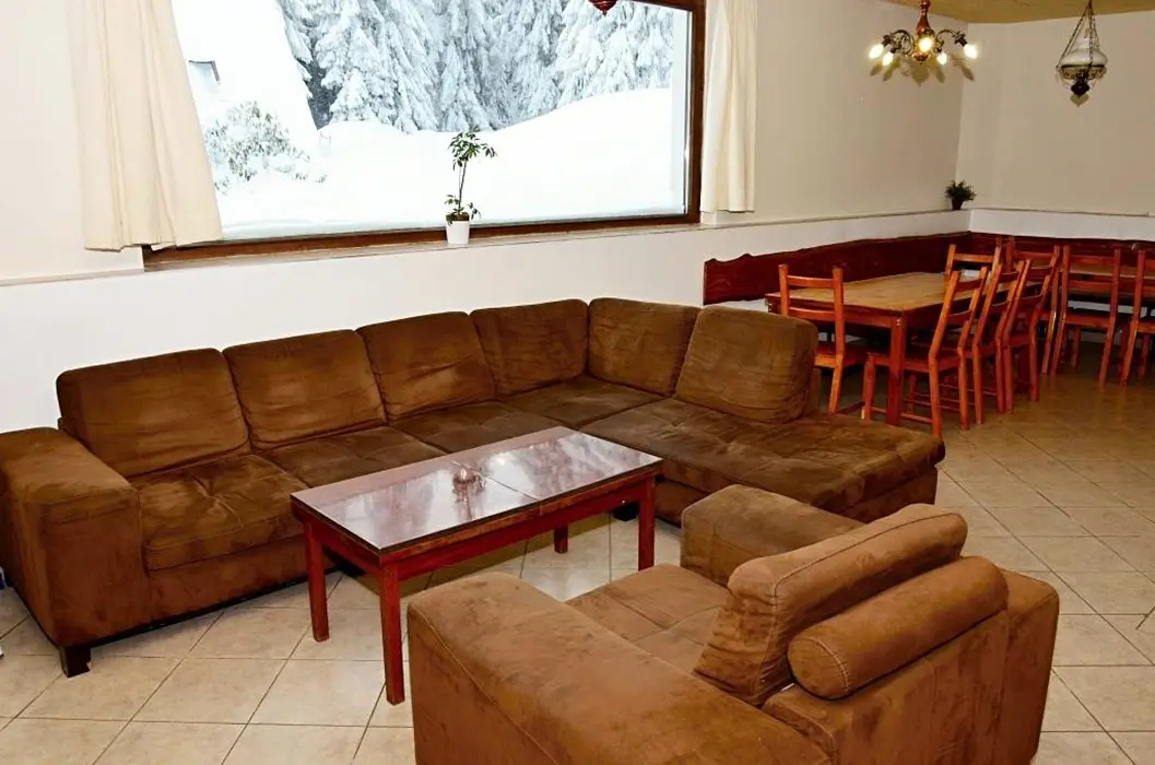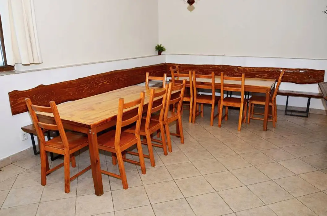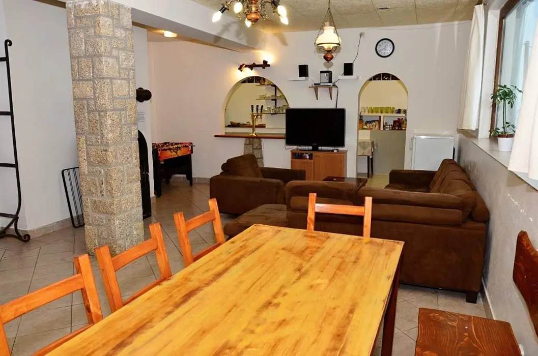 V přízemí plně vybavená kuchyně (3x lednice s mrazákem, 2x plynový sporák, trouba, 2x varná konvice, myčka, mikrovlnná trouba, pračka, bar s výčepním zařízením, kuchyňské vybavení), společenská místnost (krbová kamna, sedací souprava, TV, DVD přehrávač, minivěž, kulečník, šipky, fotbálek, dětský koutek). K dispozici je 6 ložnic - 4x3, 1x2 + 4 přistýlky, 1x2 + 2 přistýlky, každá s vlastním sociálním zařízením ( sprcha + WC ). K dispozici 2x dětská cestovní postýlka. Centrální vytápění + krbová kamna