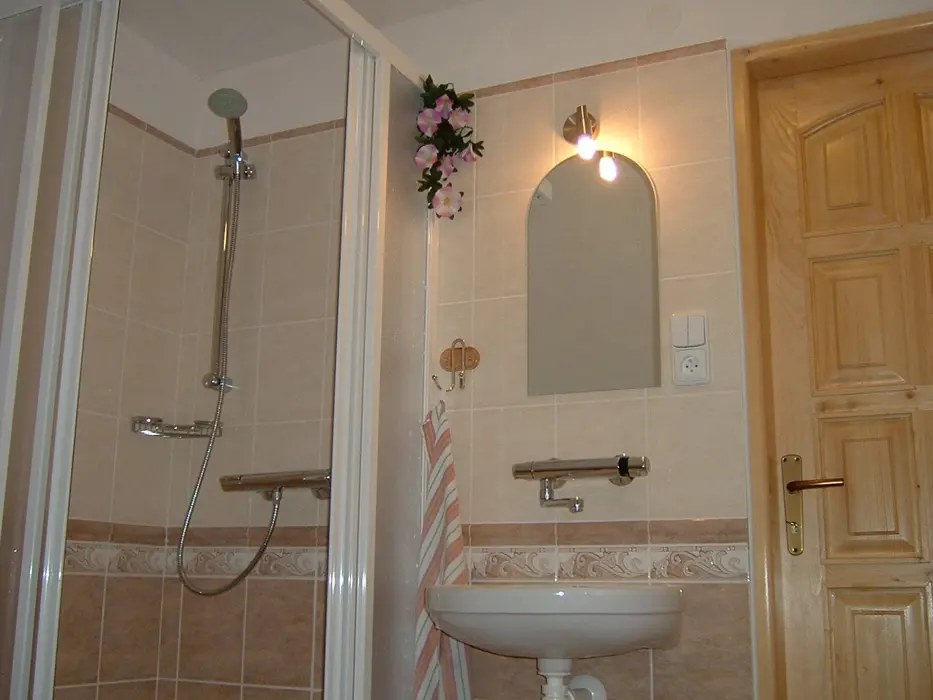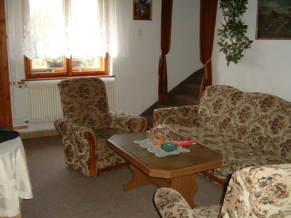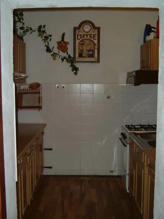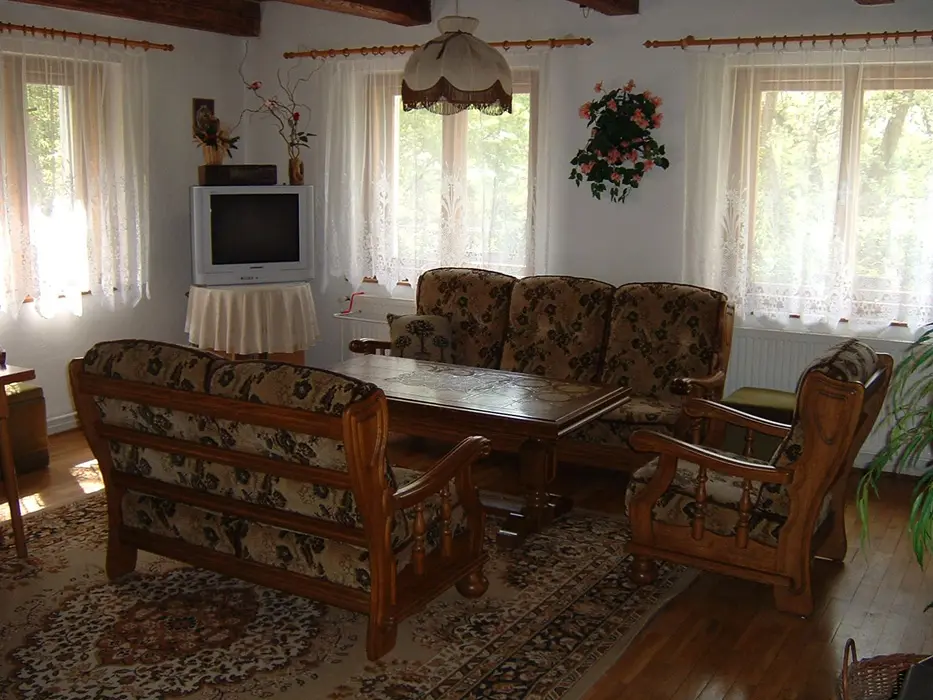Velký obývací pokoj s posezením, kabelová TV. Samostatná kuchyně - pl. sporáky, mikrovlnka, toustovač, překapávač, lednice, základní nádobí. V patře 4 ložnice 3x4, 1x2 lůžka. 2x koupelna - 1x sprcha + 2 umyvadla, 1x sprcha + 1 umyvadlo, 2x WC. Topení centrální plynové