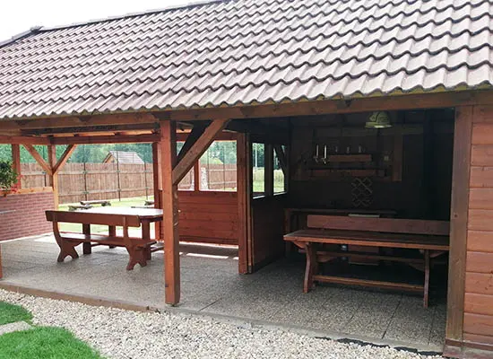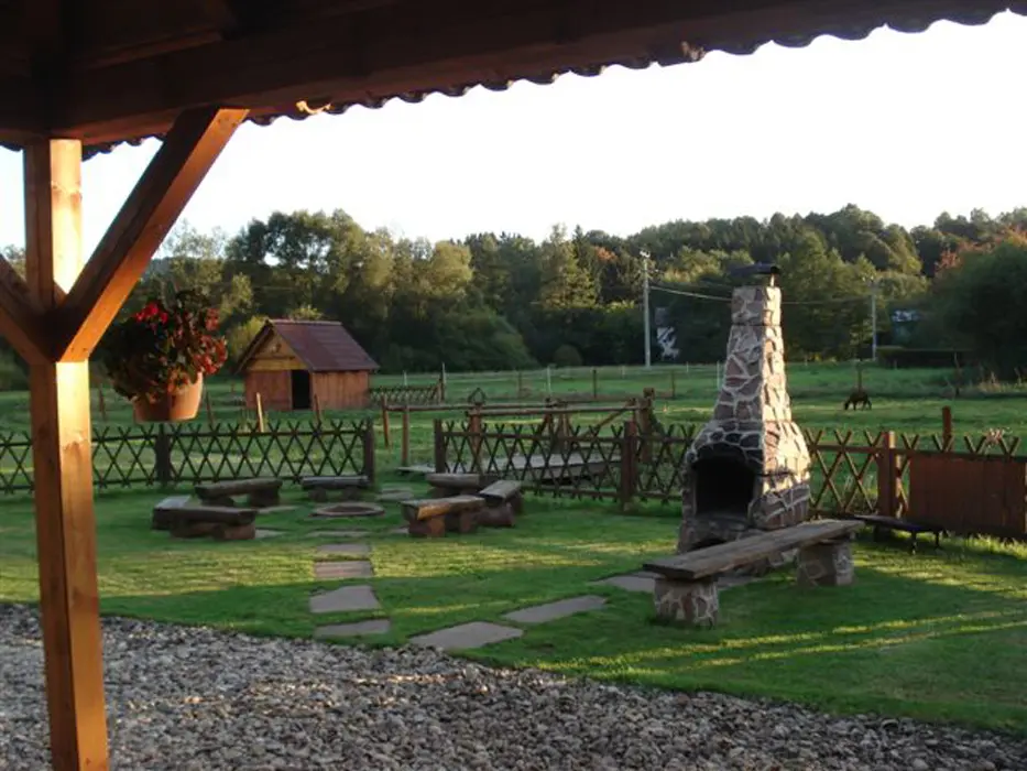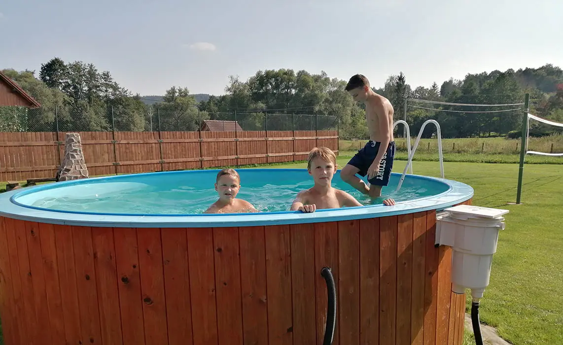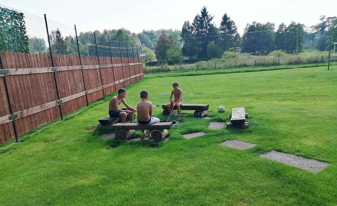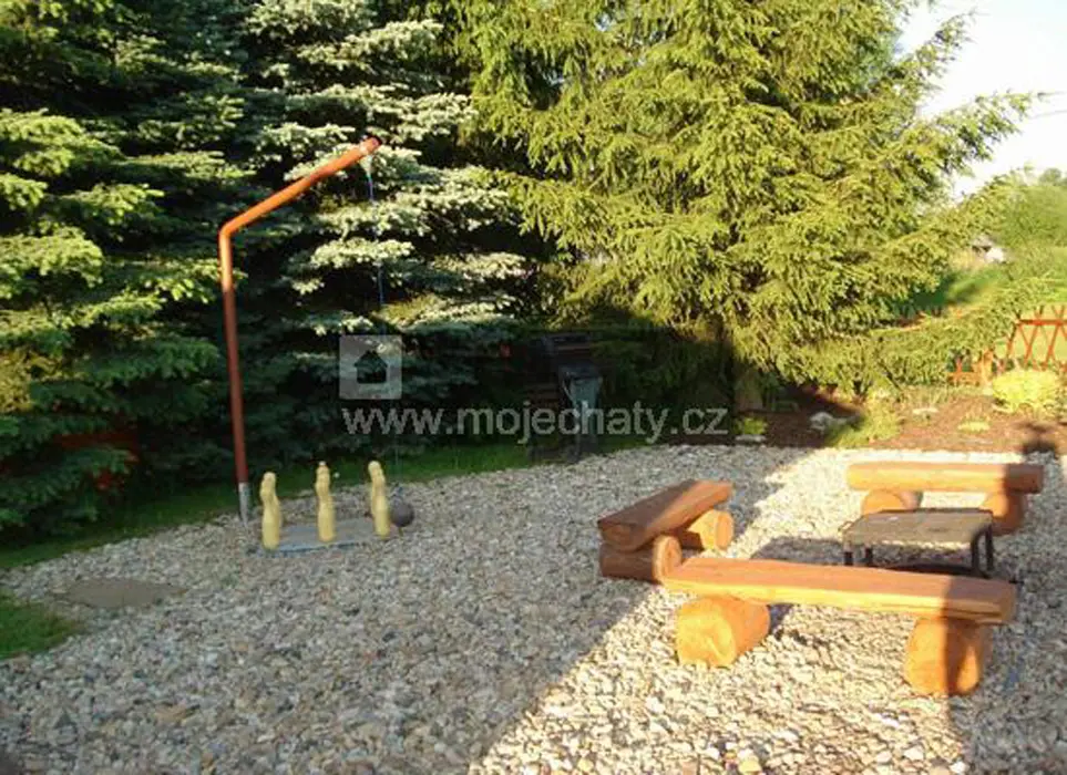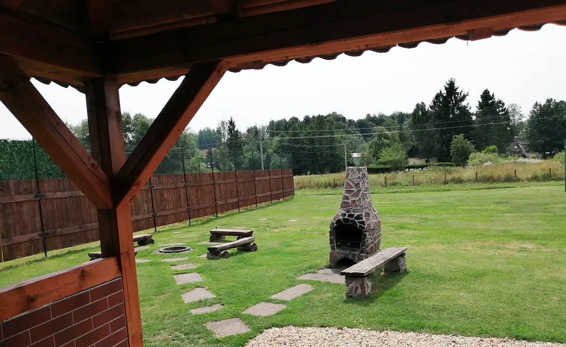 Veliký zatravněný pozemek, nadzemní kruhový bazén, ohniště s posezením, dětský koutek, gril, ping pong, trampolína, velký krytý uzavřený altán - letní kuchyňka, LCD televize, repro soustavy, satelit, krbová kamna