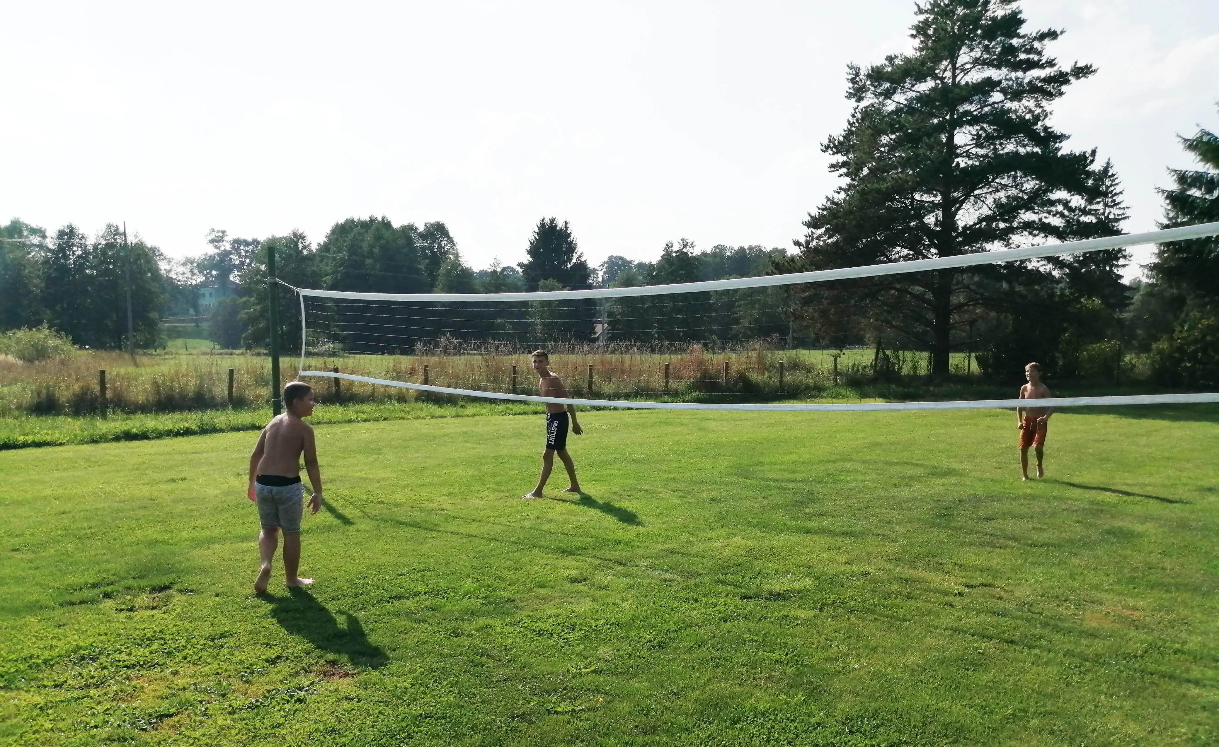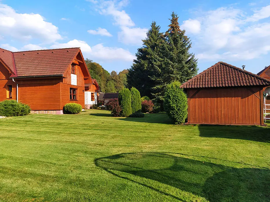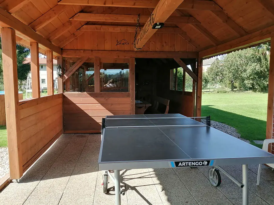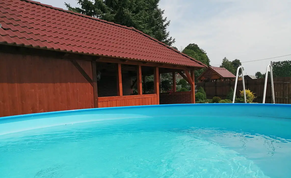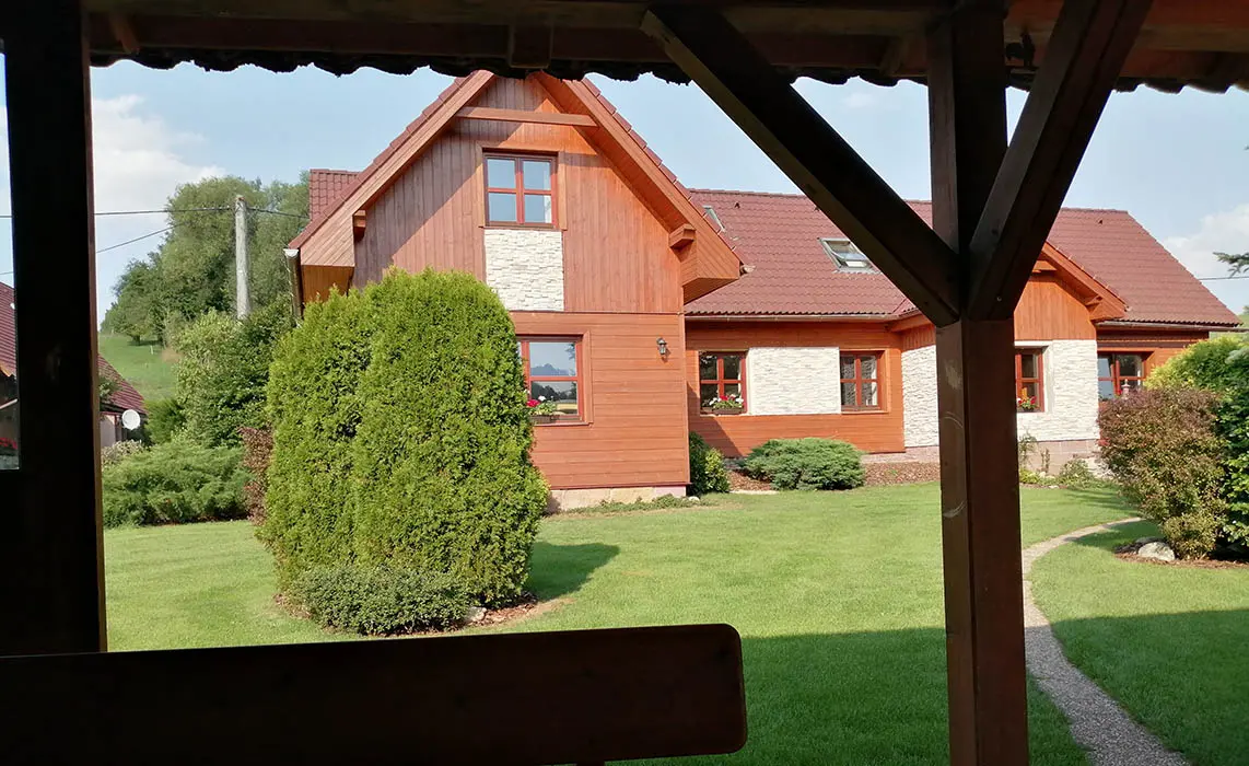 Veliký zatravněný pozemek, nadzemní kruhový bazén, ohniště s posezením, dětský koutek, gril, ping pong, trampolína, velký krytý uzavřený altán - letní kuchyňka, LCD televize, repro soustavy, satelit, krbová kamna