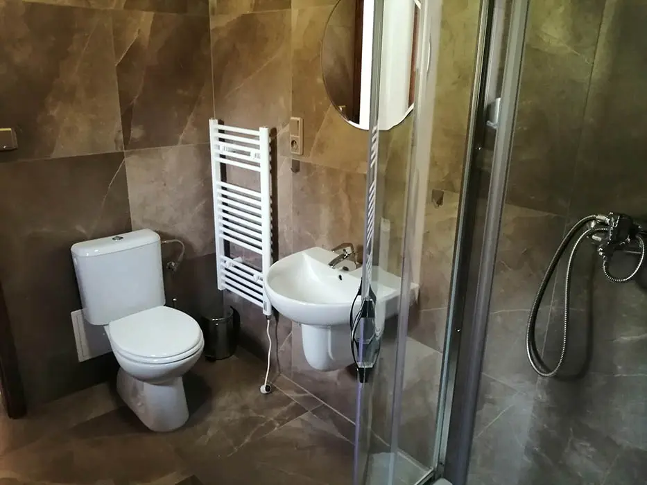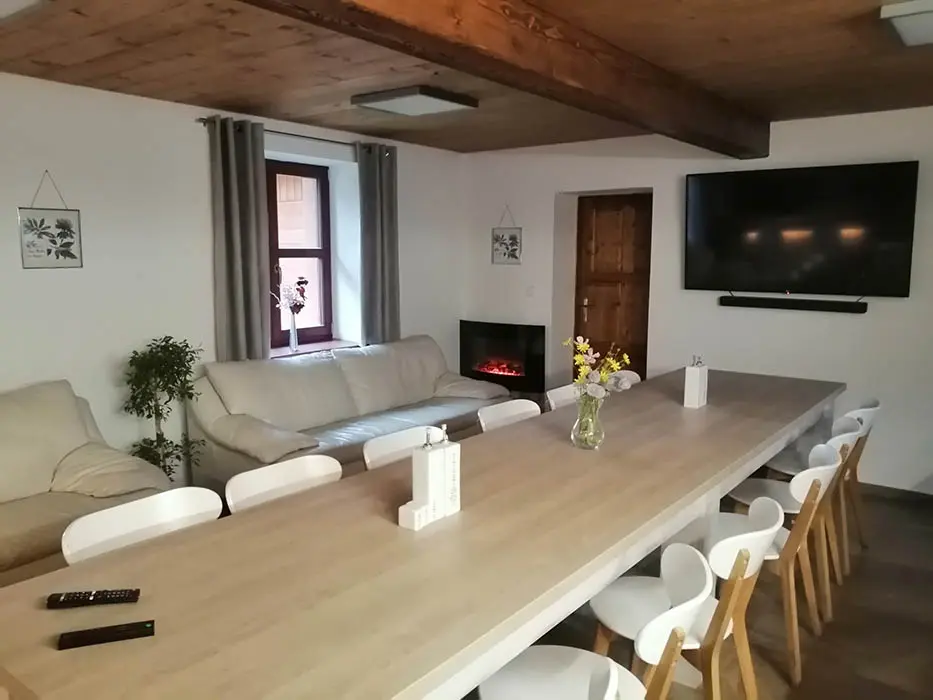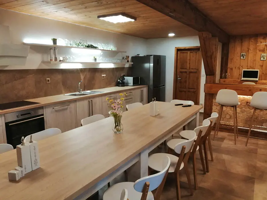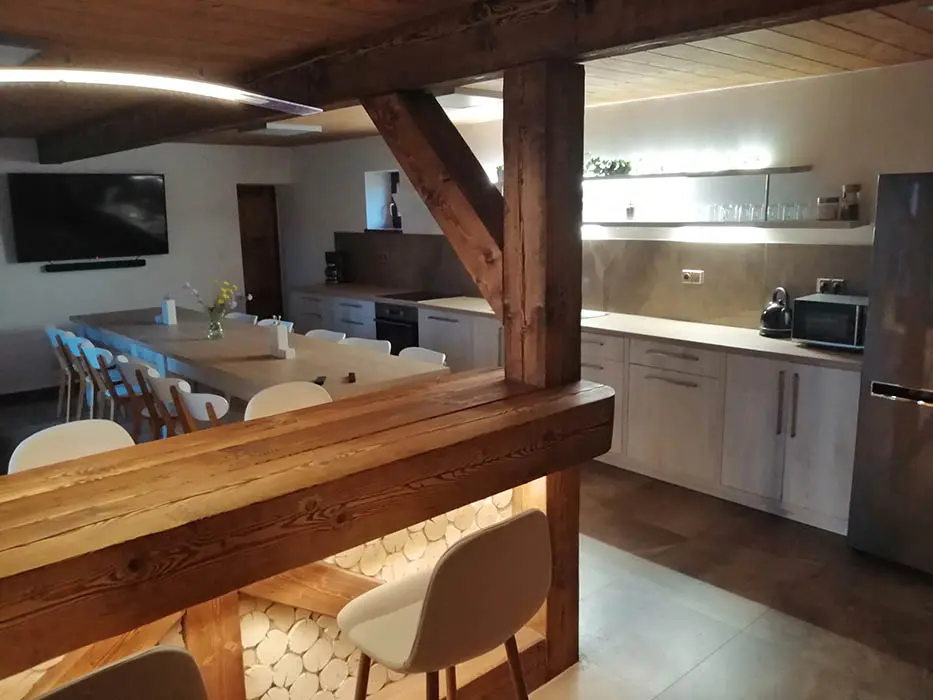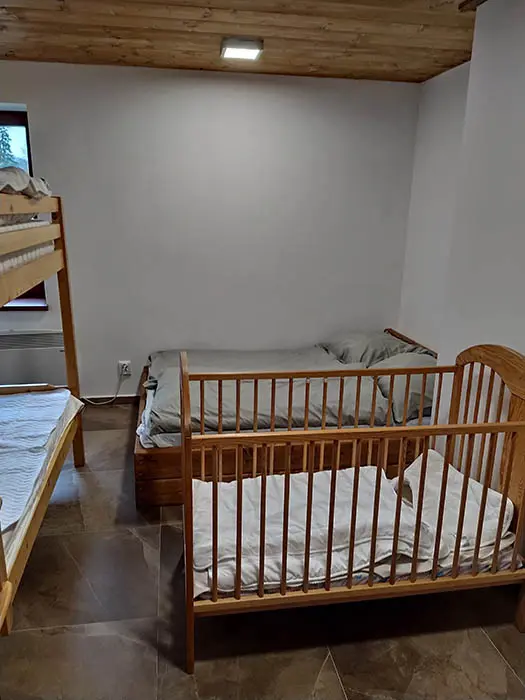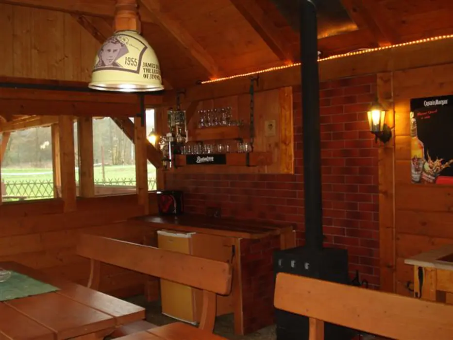 PŘÍZEMÍ: veliká společenská místnost - sedací soupravy, stoly a židle pro 18 osob, el. krbová kamna, LCDTV, vybavení kuchyně - el. sporák s troubou, mikrovlnka, varná konvice, americká lednice, myčka, dostatek nádobí. 5 ložnic - v přízemí 2x4, v patře - 1x3, 2x4 lůžka. PATRO: další prostorný obývací pokoj s posezením, stůl a židle, el. krbová kamna, LCDTV. Soc. zařízení - v přízemí - sprcha + WC, další sprcha u vířivky, v patře koupelna se sprchou, 2x WC. Topení - elektrické