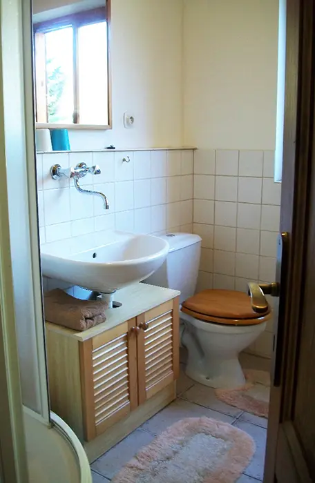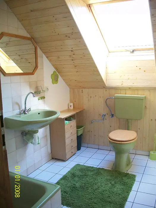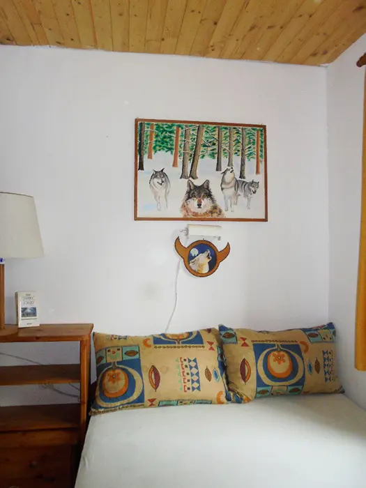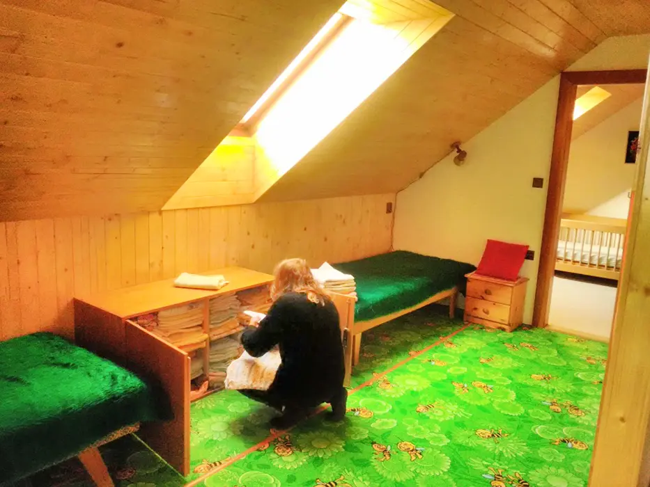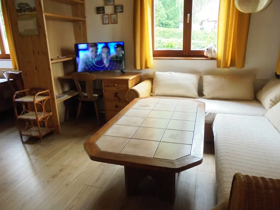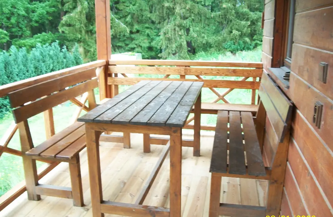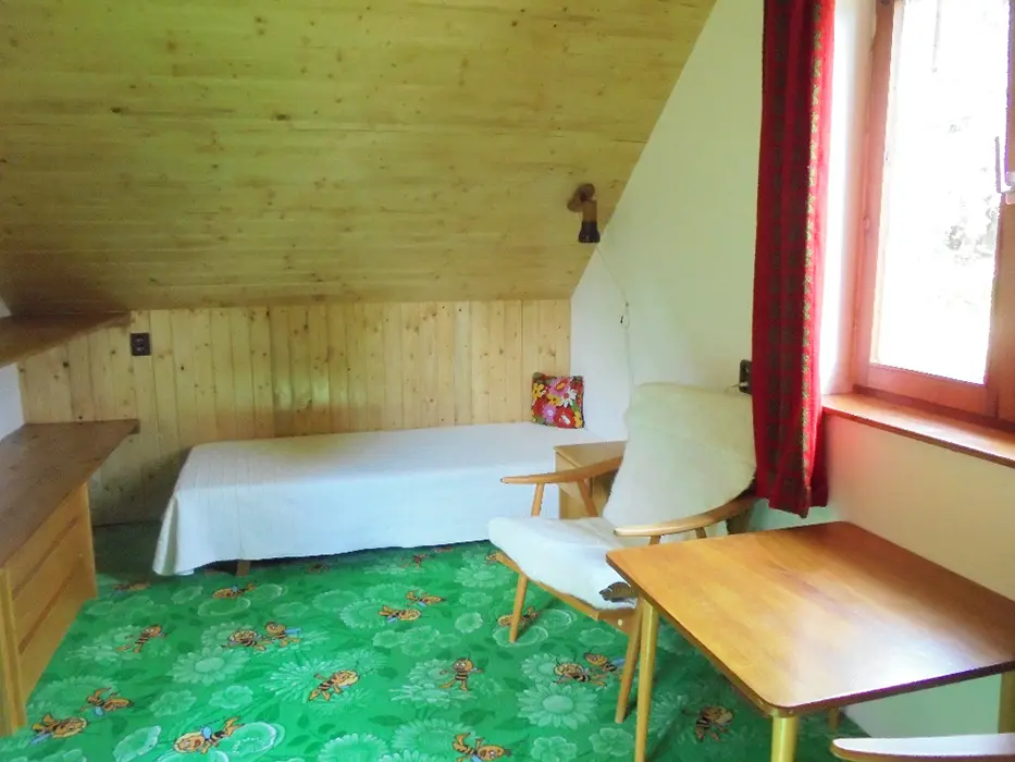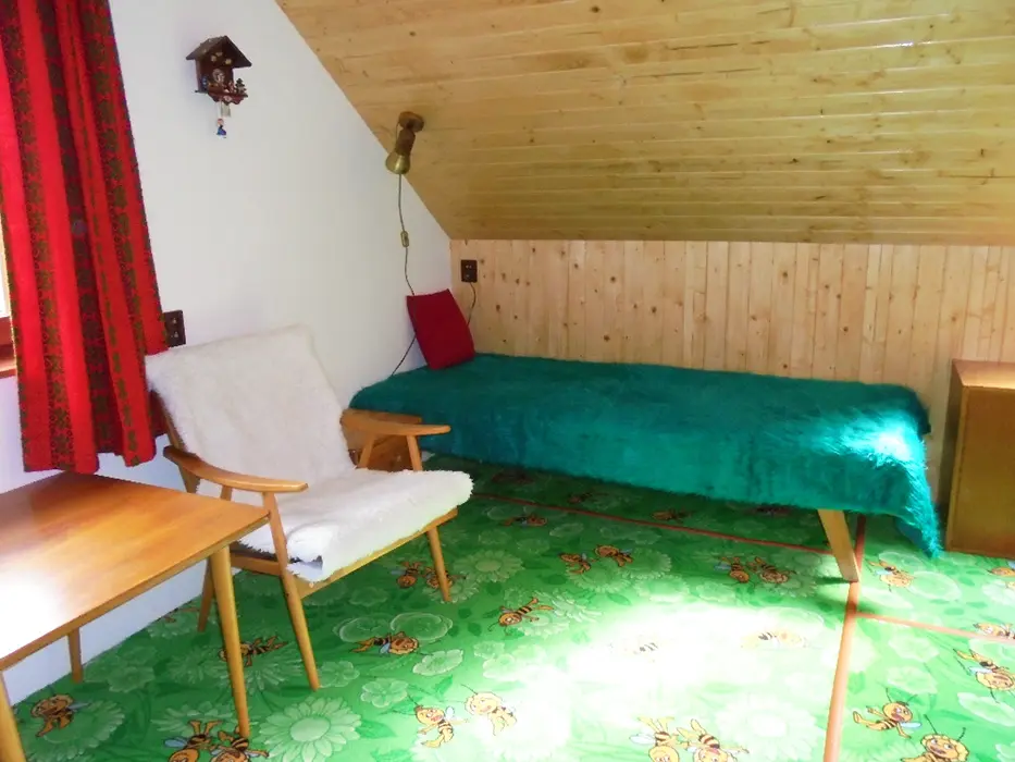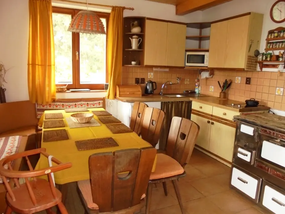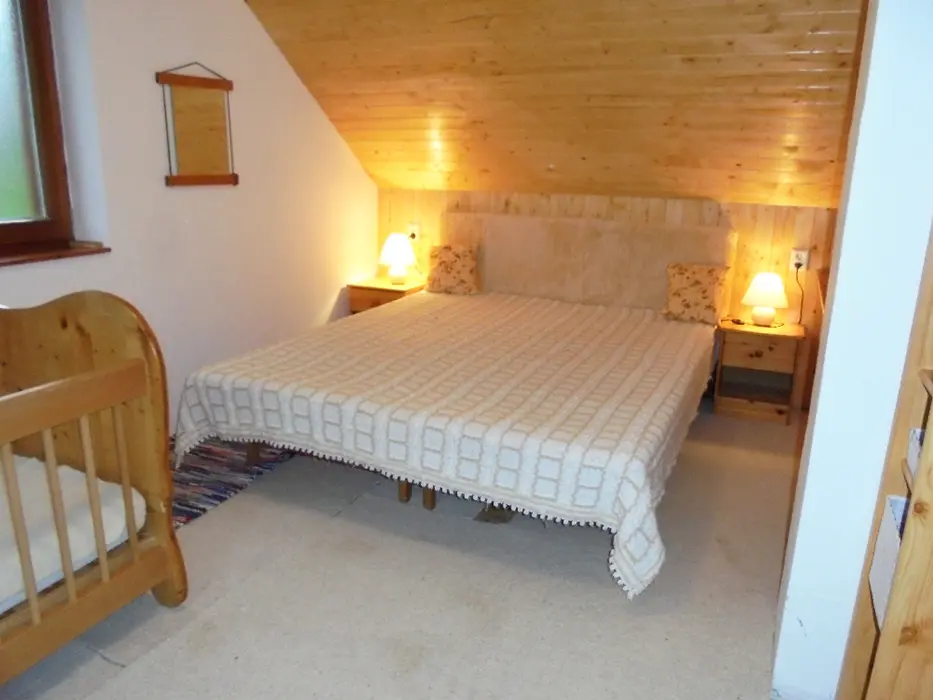 Obývací pokoj s posezením - sedací souprava - 2 přistýlky, LCDTV - spojený s kuchyní - el. varná dvoukolová deska, lednice, varná konvice, mikrovlnka, mixer, remoska, jídelní stůl s rohovou lavicí, 6 židlí, židlička pro batole. 3 ložnice - v přízemí 1x2 (140cm ), v patře - 1x2 + dětská postel 150 cm, 1x3 lůžka. K dispozici dětská postýlka. Soc. zařízení - 2 koupelny ( v přízemí i v patře ) - každá - sprcha, umyvadlo + WC. Topení - na tuhá paliva