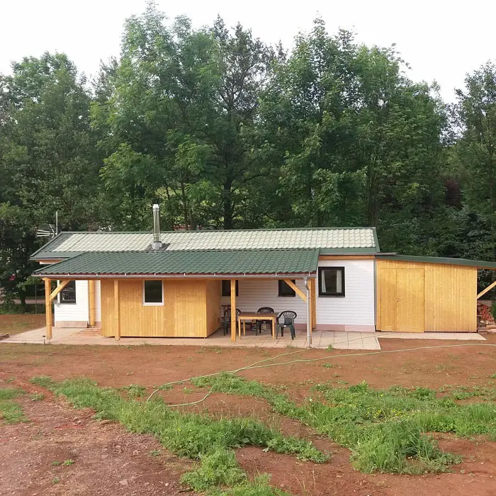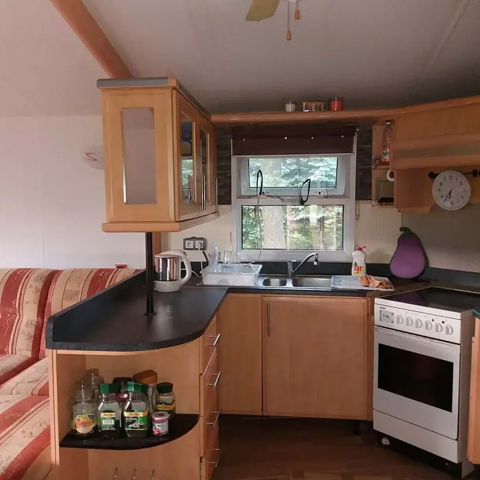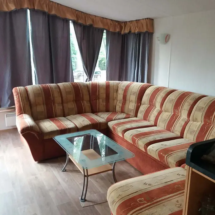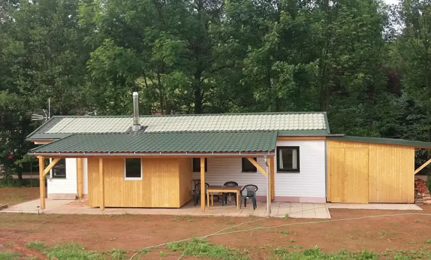 Obývací pokoj s posezením - na rozkládací sedačce 1 přistýlka, TV - spojený s kuchyní - el. sporák, sklokeramická varná deska, mrazák, varná konvice, mikrovlnka, jídelní stůl a židle. 2 ložnice - 1x1, 1x3 lůžka. Sociální zařízení - sprchový kout, samostatné WC. Topení - krbová kamna, přímotopy
