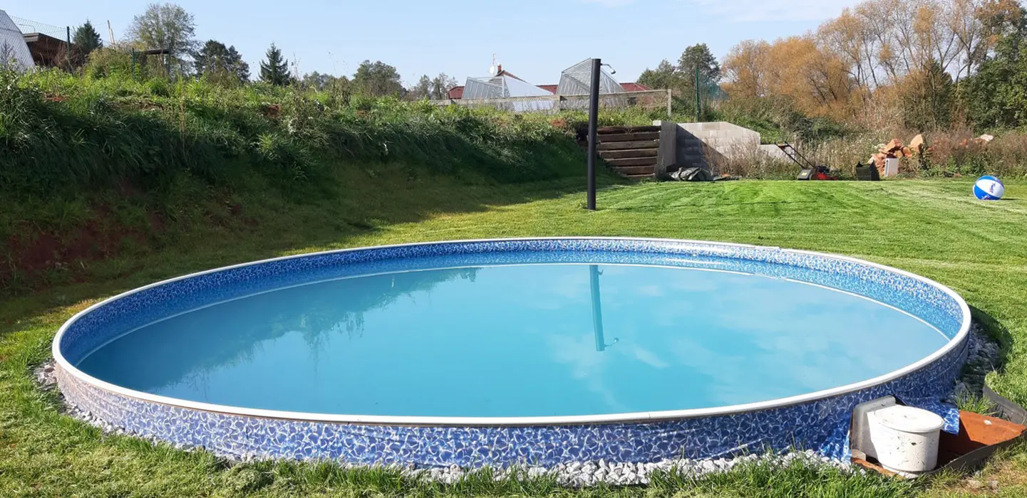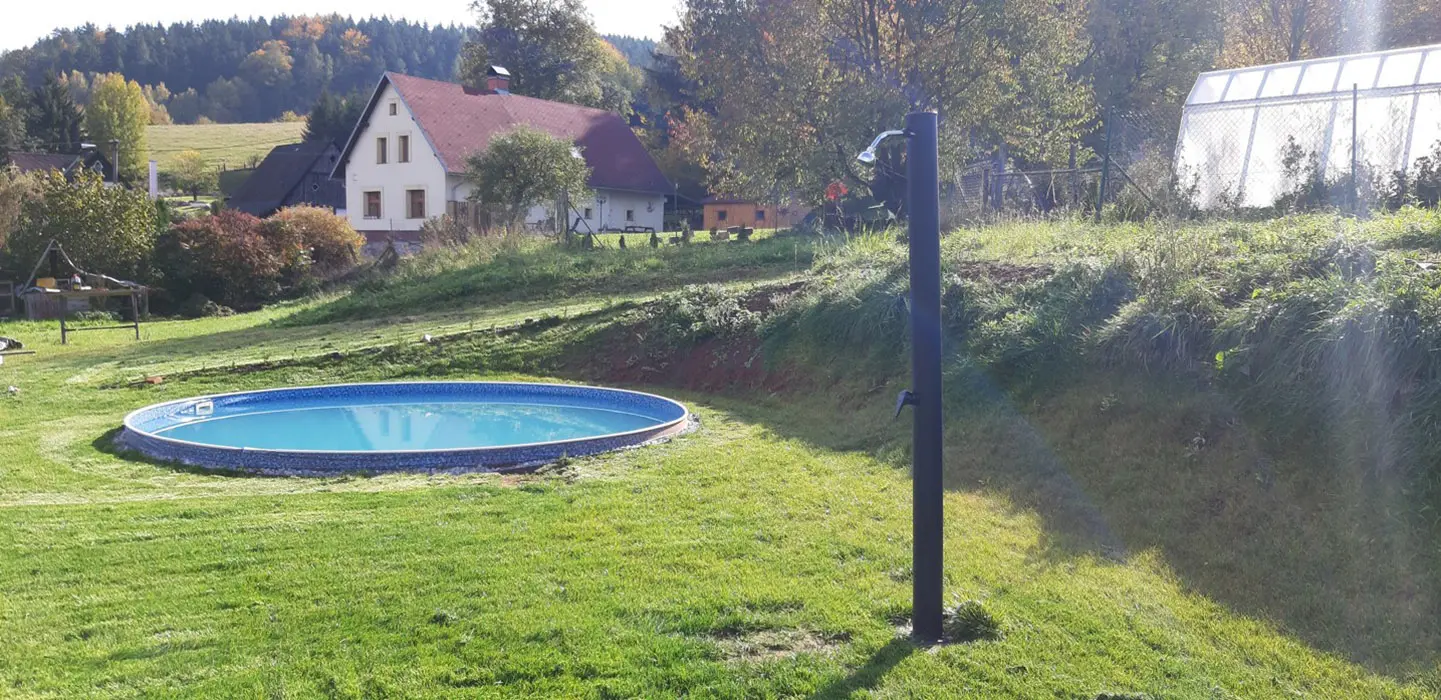 ANO - zapuštěný bazén průměr 4,6 m, hloubka 1,2 m, zahradní sprcha