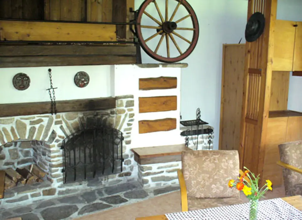 V přízemí obývací pokoj s posezením, krb, jídelní stůl, BTV, SAT, válenda 1 lůžko. Malá kuchyňka - kombinovaný sporák - pl. sporák + el. trouba, lednice 110 l, MVT, varná konvice, kávovar, základní nádobí. 2 ložnice - v přízemí 1x2, v patře 1x4 lůžka. Koupelna se sprchou, WC. Topení el. přímotopy + tuhá paliva