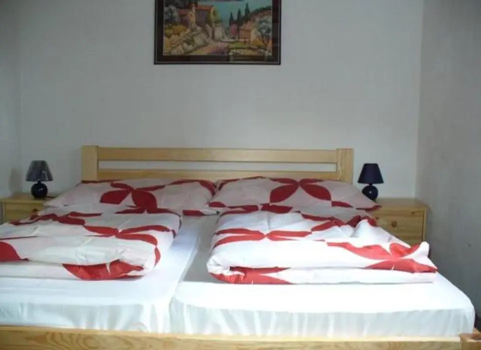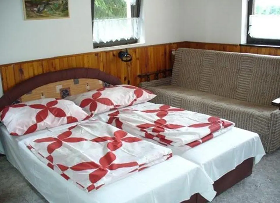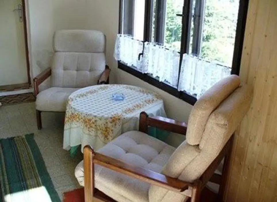 Veranda s posezením, obývací pokoj - sedací souprava ( možnost rozložení na 1,5 lůžko ), TV, kuchyňský kout - pl. sporák a el. trouba, mikrovlnka, varná konvice, lednice s mrazákem, stůl a židle, nádobí. 2 ložnice 1x4, 1x2 lůžka. Koupelna - sprchový kout, umyvadlo + WC. Topení - tuhá paliva