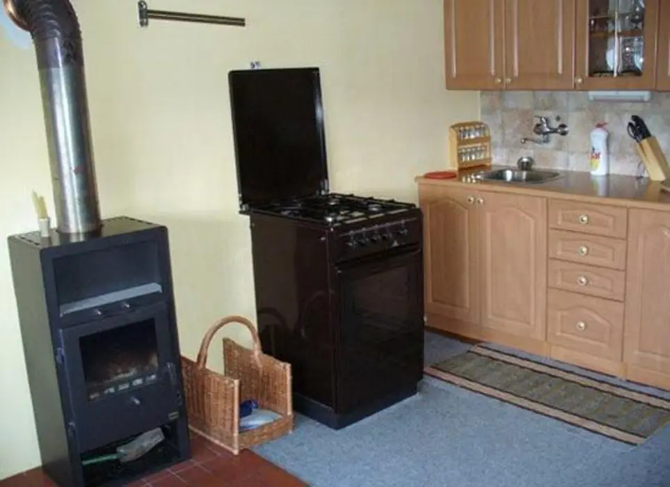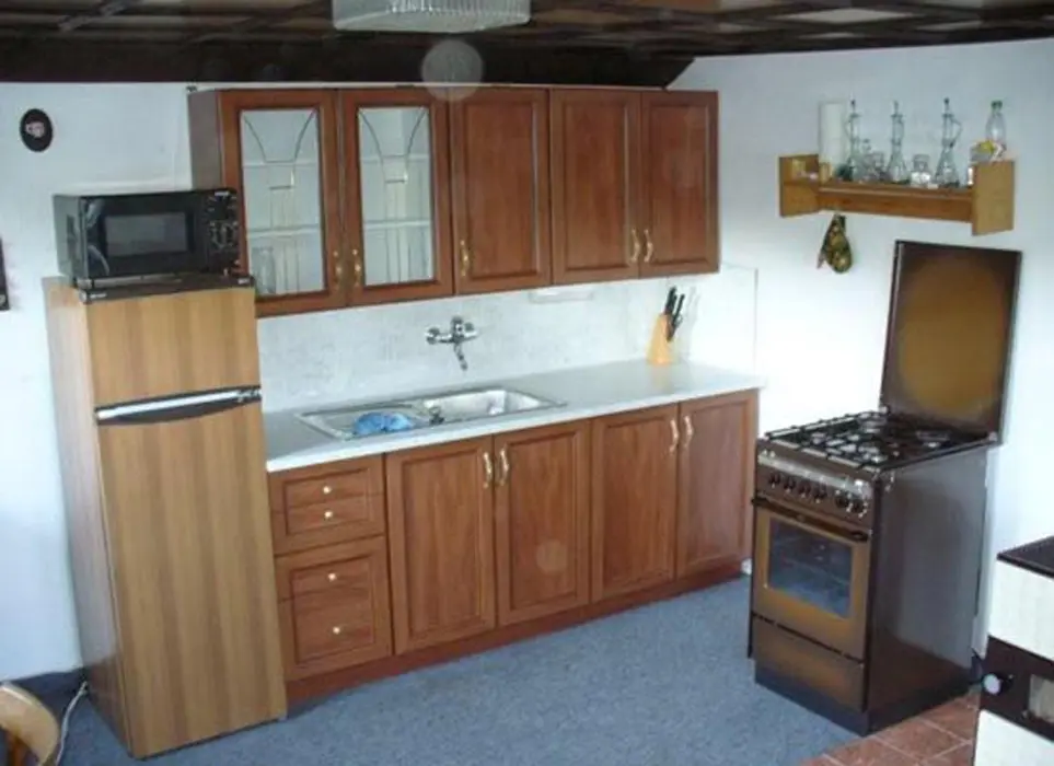 V patře - vstupní chodba, obývací pokoj - sedací souprava, krbová kamna, TV, kuchyňský kout - pl. sporák, mikrovlnka, varná konvice, lednice s mrazákem, stůl a židle, nádobí. 2 ložnice 1x4 ( dvoulůžko + palanda), 1x4 ( dvoulůžko + 2 postele). Koupelna - sprchový kout, umyvadlo + WC. Topení - tuhá paliva