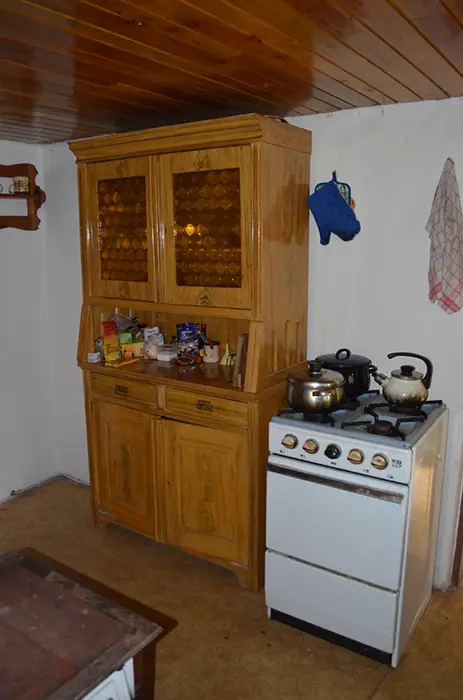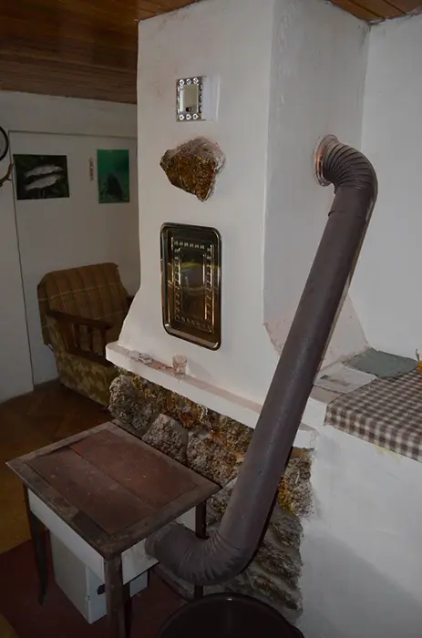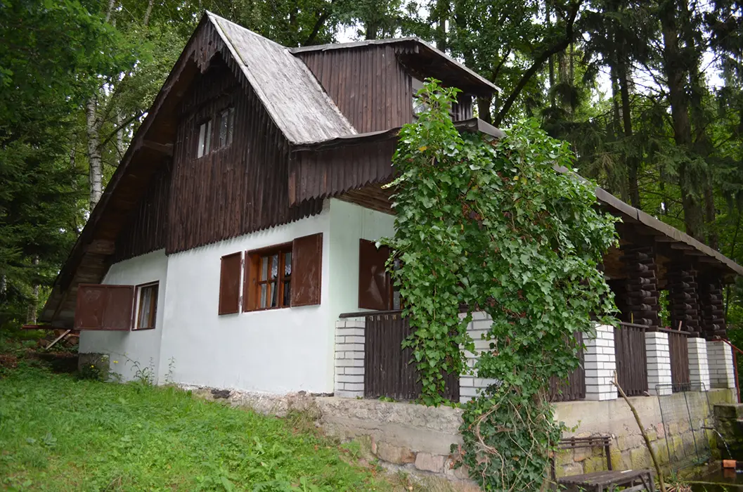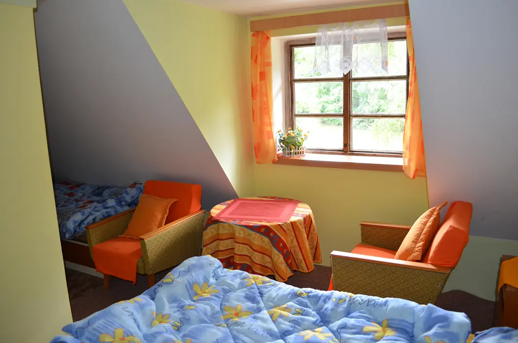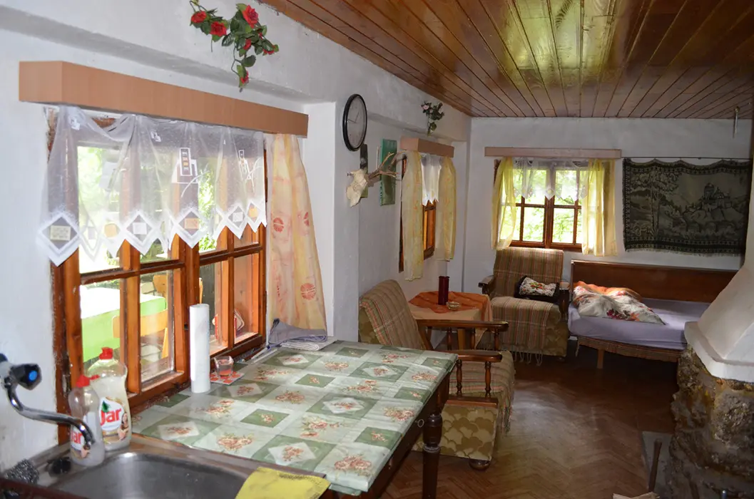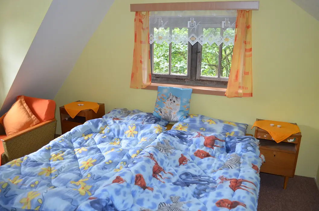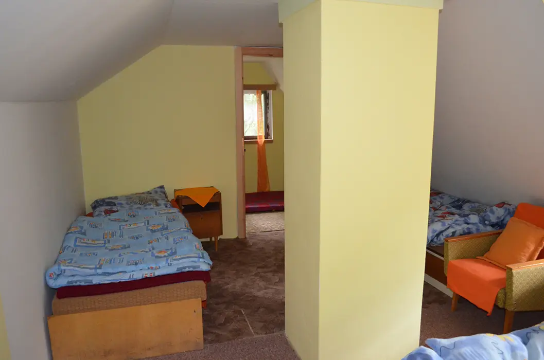 Pro NENÁROČNÉ klienty - do chaty není zavedena elektrická energie ( světlo zajištěno - lampy na baterie a petrolejka ), pouze studená voda. V přízemí - kuchyňka, pl. sporák, lednička na plyn /asi 60l/, kamna na tuhá paliva, obývací pokoj s krbem. 1 malá ložnice s dvojlůžkem, v patře 1 ložnice 1x4 lůžka. Soc. zařízení - umyvadlo, vana, splachovací WC. Ohřev vody na kamnech