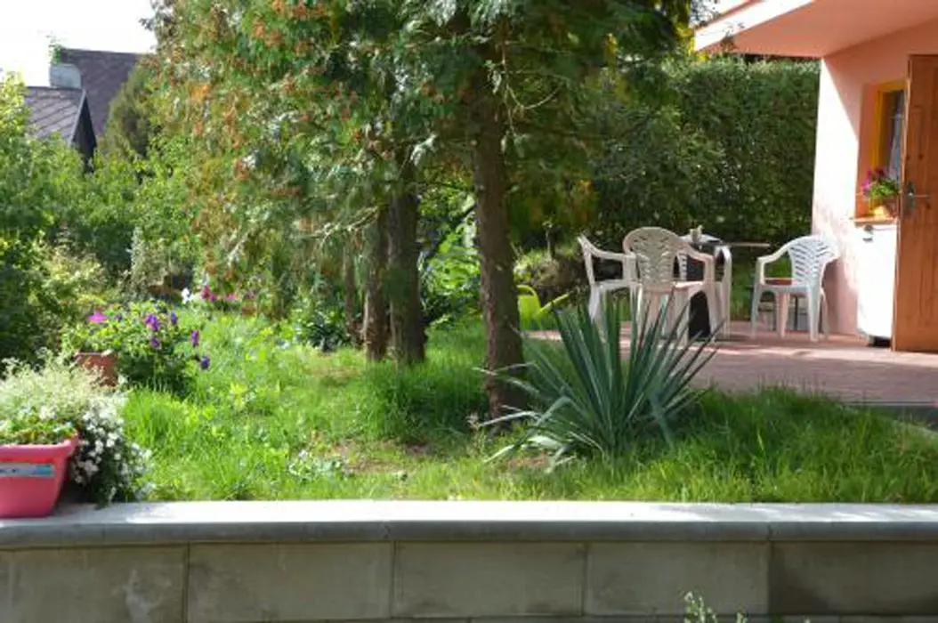 Částečně oplocený pozemek, zahradní nábytek, ohniště, přenosný gril, slunečník
